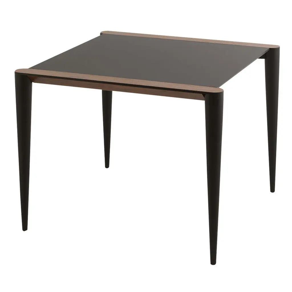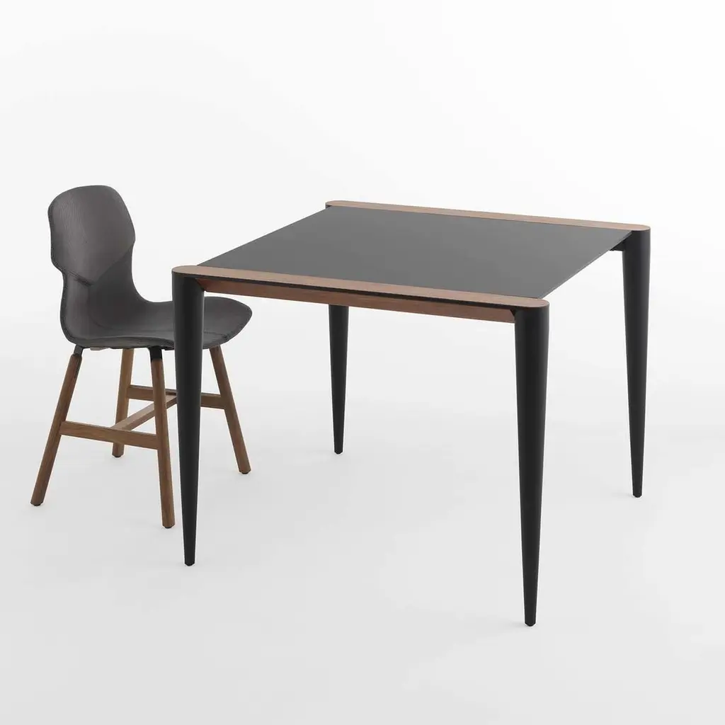 Resting on black-lacquered aluminum conical legs, this bistrot table is characterized by a distinctive top made of Fenix, a new material created with nanotechnology that renders the surface anti-fingerprint, resistant to scratch and suitable for contact with food. The Canaletto walnut details add a sophisticated touch to this minimalist and elegant piece of functional decor designed by Renato Zamberlan.