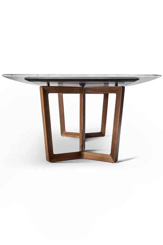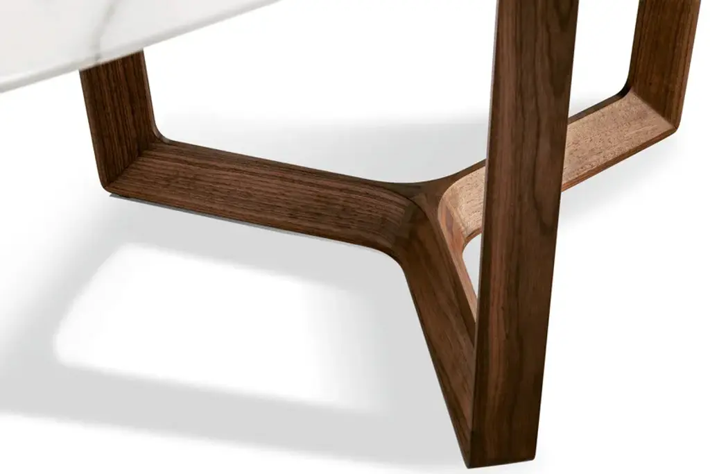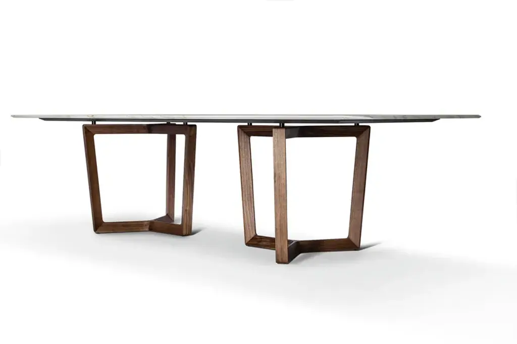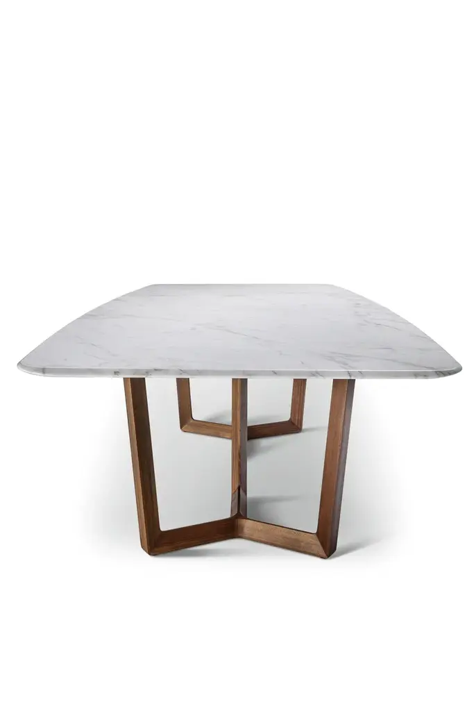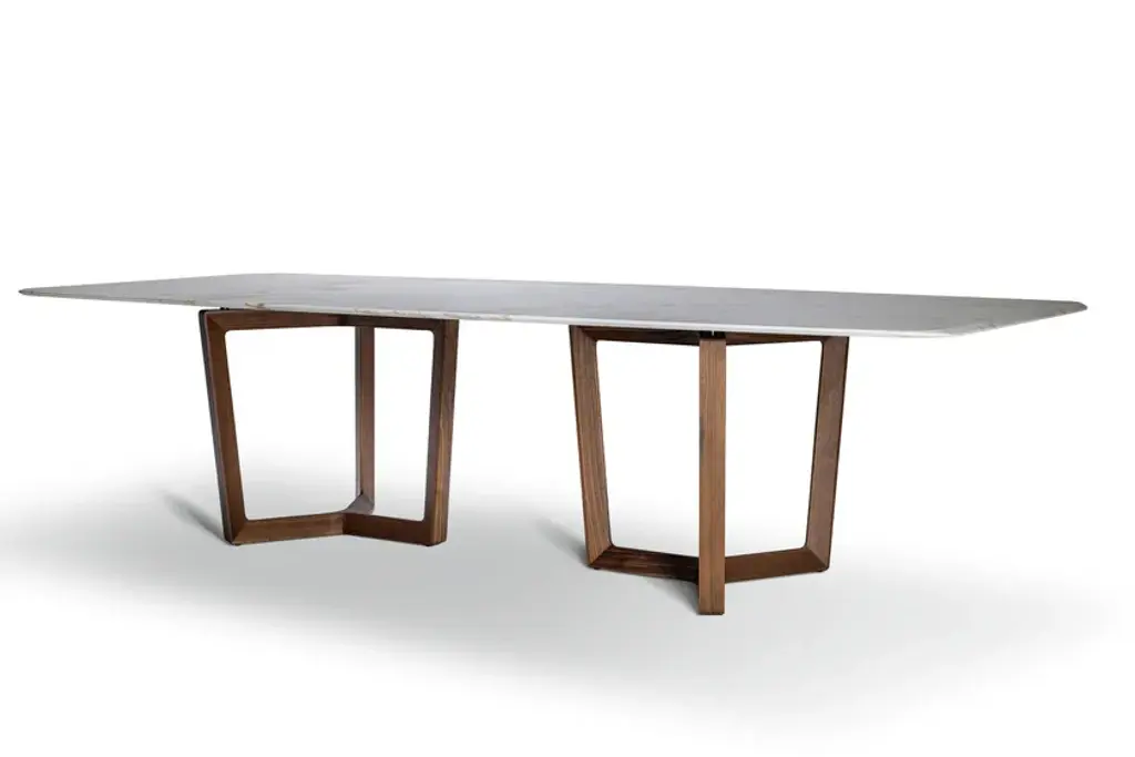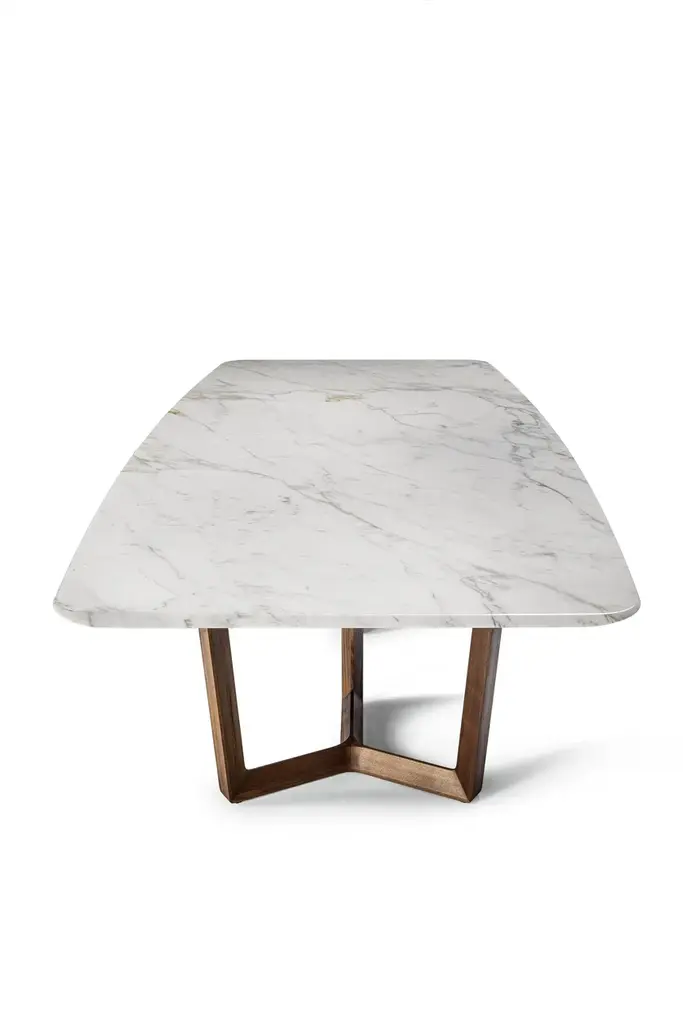 Roberto Lazzeroni has designed the Bolero Ravel table for Poltrona Frau. The top produced from a single slab of barrel-shaped marble, the tapered edges and the 3-legged base make it even more dynamic and sleek. A sensual score of sounds that blend together harmoniously in space: Roberto Lazzeroni was clearly inspired by Ravel’s hypnotic Bolero when he designed this sleek table which seems to be almost suspended in the air despite its “heavy” materials. Materials like the marble top which, attached to the supports using a spacer, almost appears to float in space. Its faintly trapeze-like shape accentuates the visual perception of a thickness reduced to the minimum. A sensation emphasised by the refined bevelled edges which slant upwards on the short sides and downwards on the long sides. The original tapered triangular section gives the 3-legged base greater dynamism. The overall effect is one of an ethereal table of understated elegance that is easily combined with other pieces of Poltrona Frau furniture. The Bolero Ravel table has a self-supporting easel structure base consisting of three legs with distinctive triangular cross-section. The legs can come in wenge-coloured solid ash wood or solid Canaletto walnut. Mounting plates and spacers in black lacquered steel. The top is made from a single slab of barrel-shaped marble with tapered edges. It can come in Calacatta Oro or Fior di Pesco marble. Both are available with a polished finish, treated with a polished paint that improves the resistance of the surface preventing the absorption of liquids, or a semi-polished finish, treated with a more natural looking water-repellent oil. The bottom surface of the marble top has a technical mesh to guarantee its resistance.