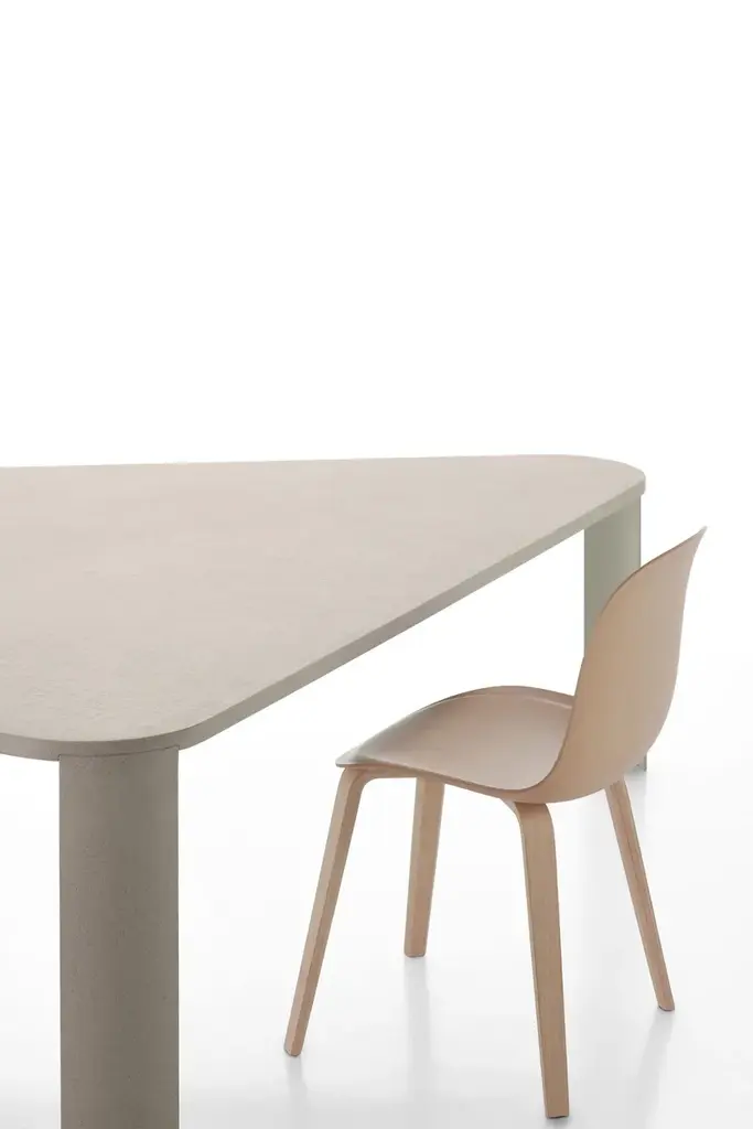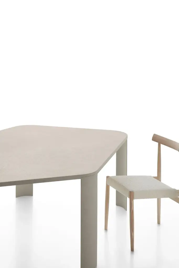 The tables in the Bonnet family interpret the theme of soft, rational forms with architectural elan, introducing a touch of femininity into the MDF Italia collection that invites unprecedented social experiences.The legs, which resemble smoothed blades, rise up and embrace the table top with which they create a dynamic tension. The simple but bold asymmetrical and unusual shapes of the top have a strong personality that softens formal rigour with what the designer, Marialaura Irvine, calls a “radical whisper”. When combined, these tables can create unexpected compositions. The result of experiments with materials and colours, the sophisticated single-material finishes made with Coccioperla give the surfaces a tactile, brilliant and vivid aura. Top and frameThe top (3 cm thick) is made of melamine supported by a metal frame that allows the top to be joined to the bases, both finished with the new Coccioperla finish, a material mix obtained from a mixture of mortar, aggregates and crushed mother-of-pearl. The spatula application process is entirely manual over the entire table surface and produces a unique texture that makes each product distinctive both to the eye and to the touch. Available in white, cream, dove grey and black. BasesThe bases are made of curved metal and follow the angles of the top. Coccioperla finish in the same colour as the top.DimensionsThe tables are available in 10 dimensions, of which 5 are shaped, 3 rectangular and 2 square. 73 cm high.