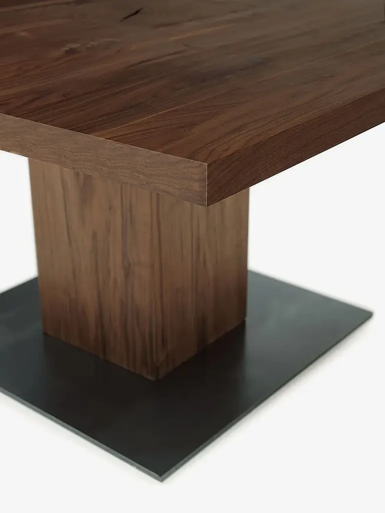 BOSS EXECUTIVE SQUARE is a table with a solid wood top made of glued slats, distinguished by the through-leg visible on the top, crafted from a section of tree trunks. Version with a square-shaped top and an iron floor plate.