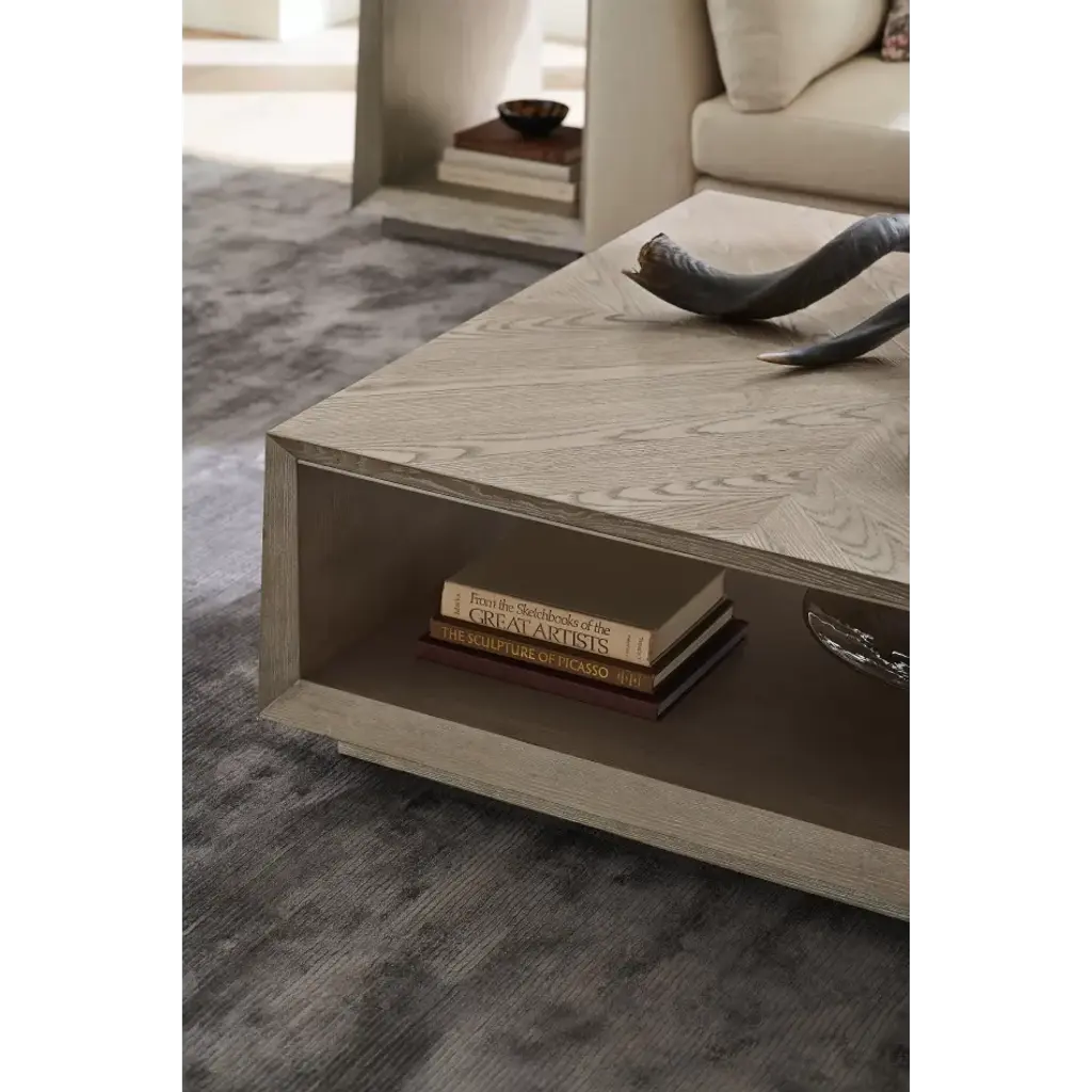 As the center of your conversation area, the Boxcar cocktail table lends authentic warmth and character. Its clean geometric lines are brought to life with the organic beauty of Ash Driftwood veneers formed in an artistic alternating pattern across the tabletop. Designed with an open storage area, this cocktail table’s timeless form is bolstered by thoughtful functionality—creating just the place to stow magazines or a favorite knitted throw. Highlights of a Sundance Gold finish peek through in metal accents that add another layer of luxe.