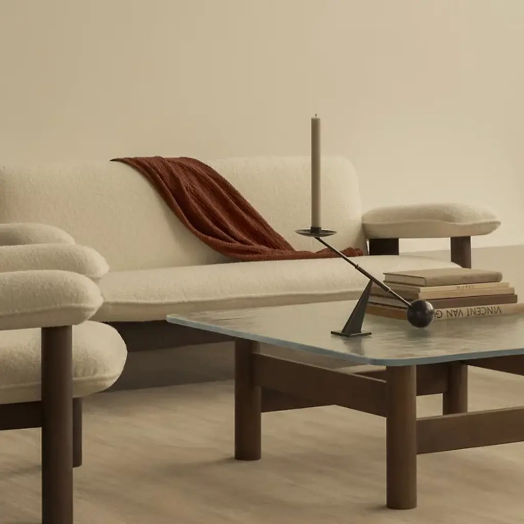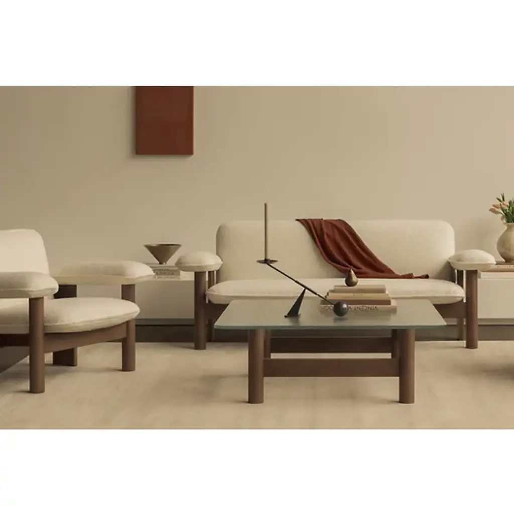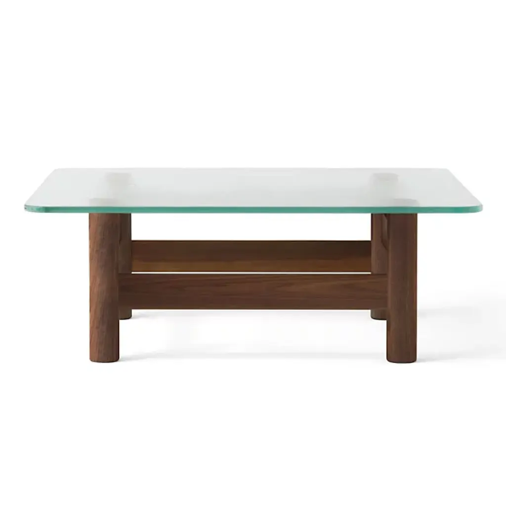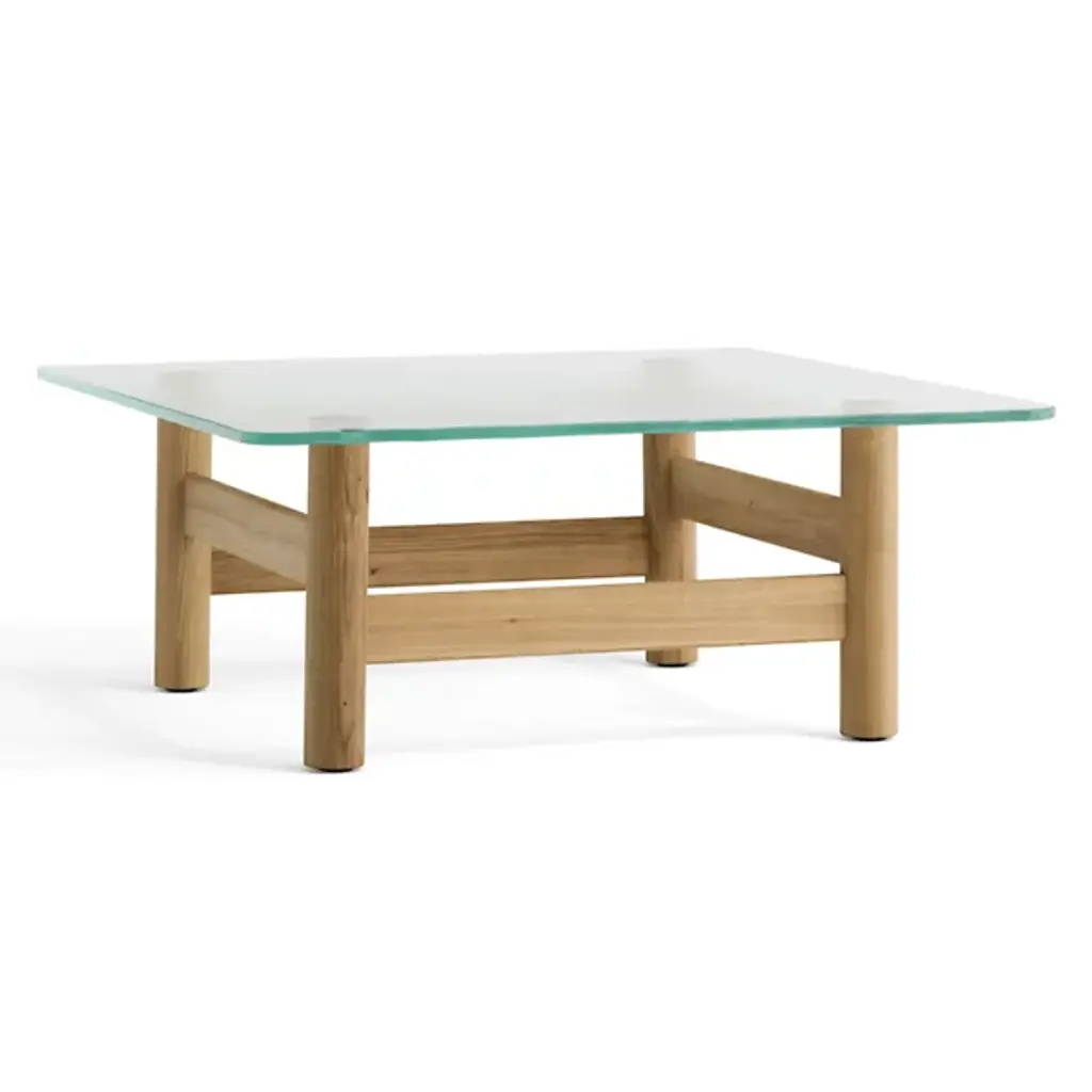 The Brasilia Lounge Table from Audo Copenhagen is an open, sculptural construction using simple shapes to elevate a thick, clear glass top. Designed by Anderssen & Voll, its solid oak wood construction is made in Slovenia, and features four cylindrical legs braced by vertical beams. The open design keeps the wood grain on display, contrasting the natural subtleties of the wood with the translucent glass top. A mix of mid-century Scandinavian design and Brazilian Modernism, its strong frame displays traditional wood joinery techniques with its smooth curves offering a soothing accompaniment to its surroundings.