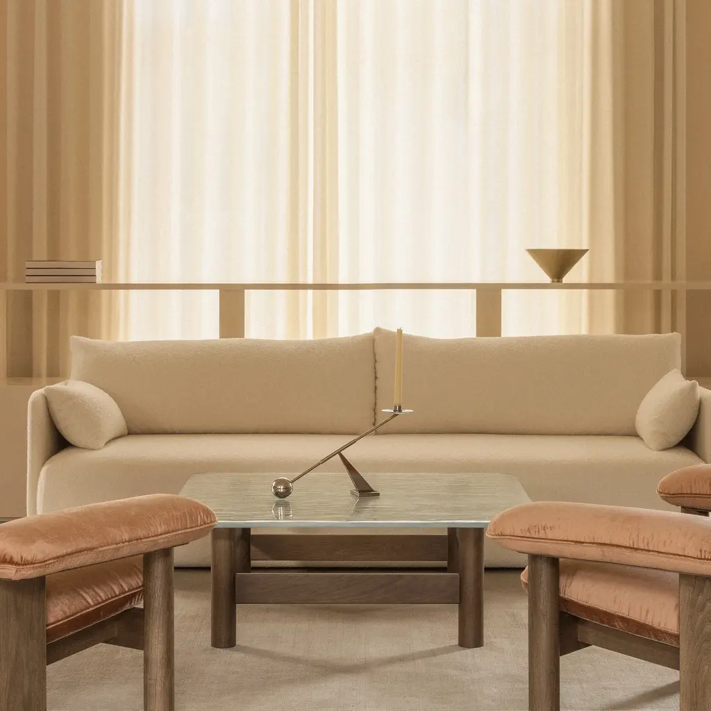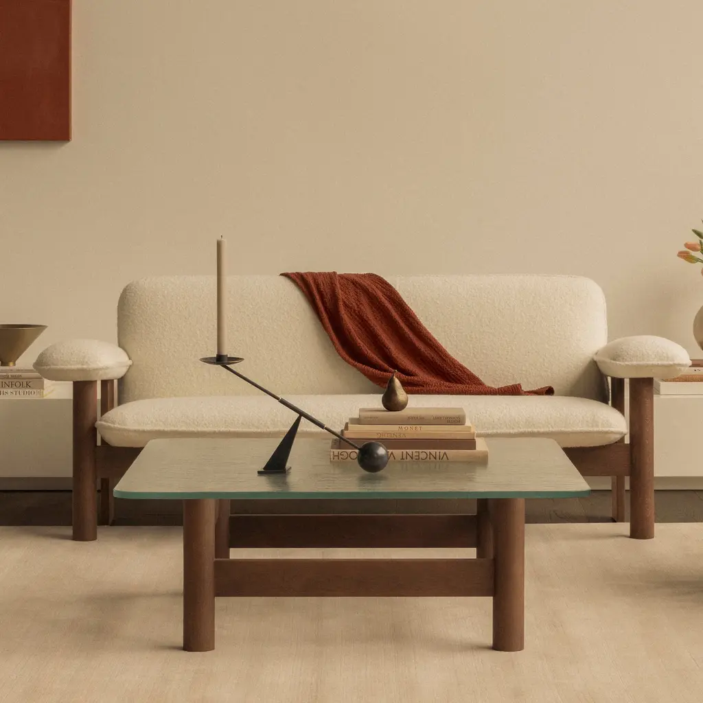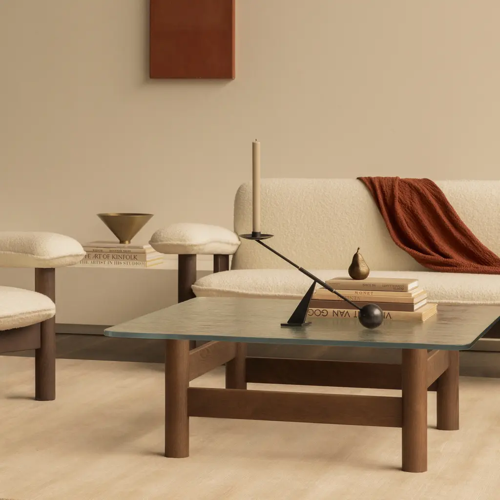 The Brasilia Lounge Table combines Scandinavian mid-century design with Brazilian modernism. Designed by Anderssen & Voll, it features a solid wood base available in natural oak, dark-stained oak, or walnut, highlighting traditional joinery techniques. The fused, tempered opti-white glass tabletop provides a light contrast to the solid base. Rounded corners and gently curved legs enhance its streamlined look.