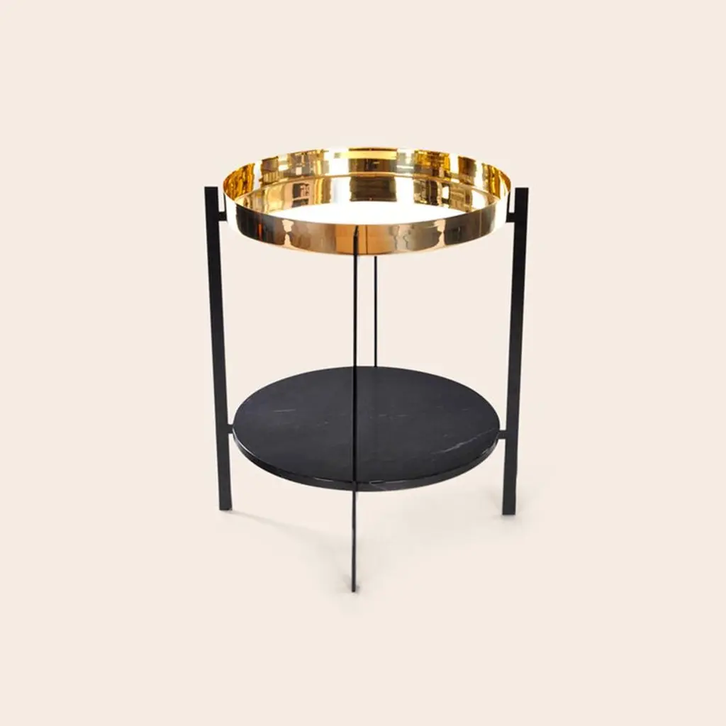 Brass and Black Marquina Marble Deck Table by OxDenmarqDimensions: D 57 x W 57 x H 67 cmMaterials: Steel, Black Marquina Marble, BrassAlso Available: Different tray conbinations available,OX DENMARQ is a Danish design brand aspiring to make beautiful handmade furniture, accessories and lighting in natural high-quality materials in fair prices. " When we set out back in 2003, we were primarily working with vegetable-tanned saddle leather thus the name OX was a tribute to our unique leather and the animal providing it.The other half of our name, DENMARQ, is chosen to emphasize that we are a Danish design brand based on the Danish design tradition and that most of our furniture is produced in Denmark. However, DENMARQ not only refers to our home country, but also to the co-founder and designer - DENnis MARQuart.Before finishing his design studies at the Copenhagen Design University, Dennis Marquart did a Blacksmith education. This background is extremely useful when developing and designing products."OX DENMARQ handmade products will only get more beautiful as time passes and natural patina sets in.Many OX products are shaped around marble or vegetable-tanned saddle leather. Stone and leather are materials that will, and should, get marks over time. But they will also age with a very special beauty. When you learn to appreciate the beauty of maturity and of time passing, you have learned to appreciate patina the way it should be appreciated.