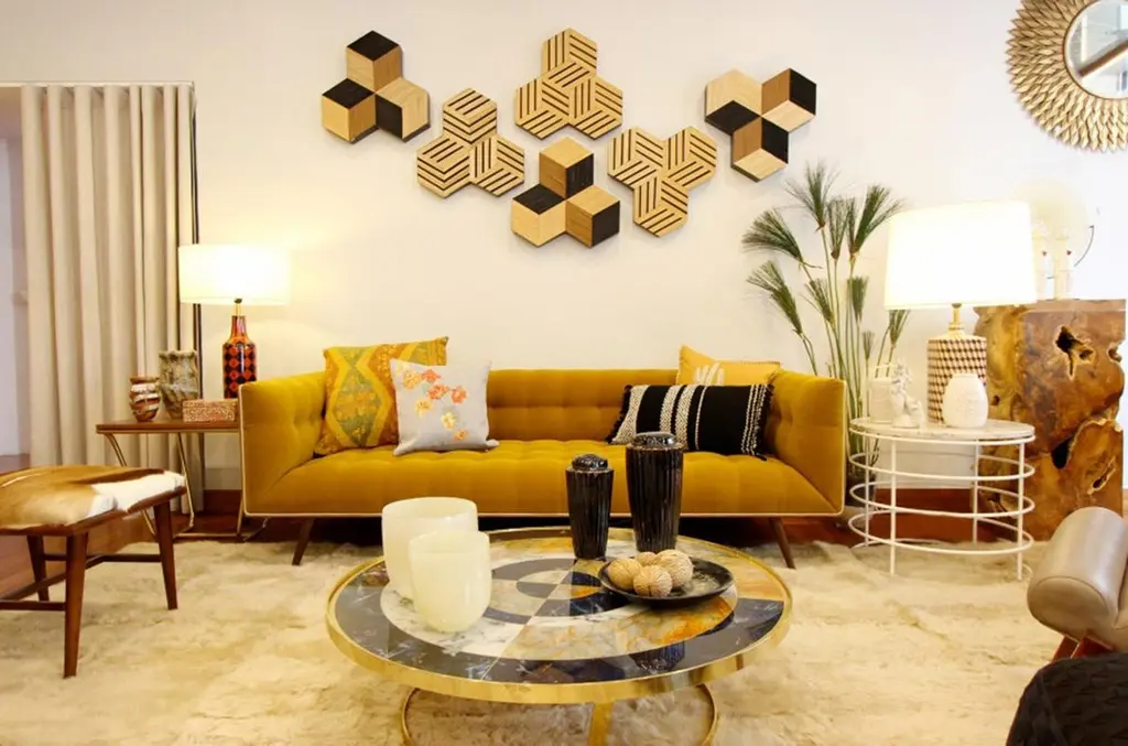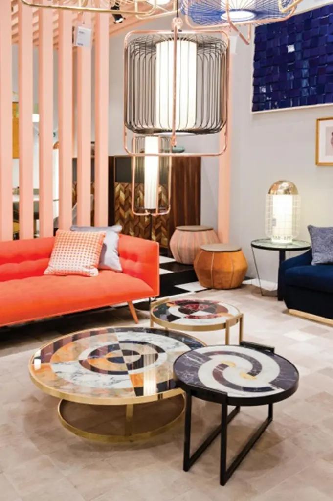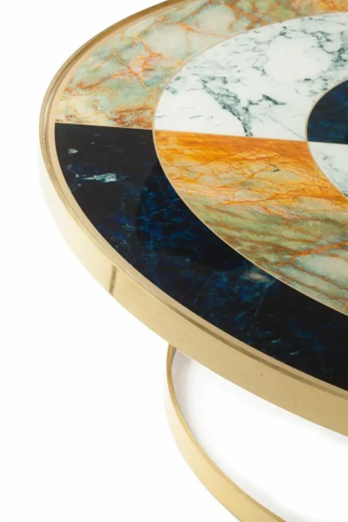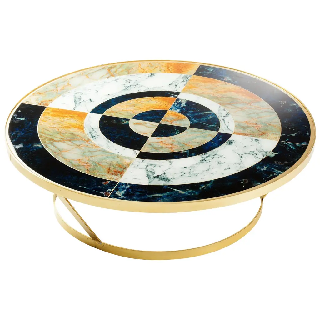 York brings a modern twist to traditional marble. A round top with bold, geometric pattern sits on a polished brass structure, making York a truly unique piece. Made to Order.