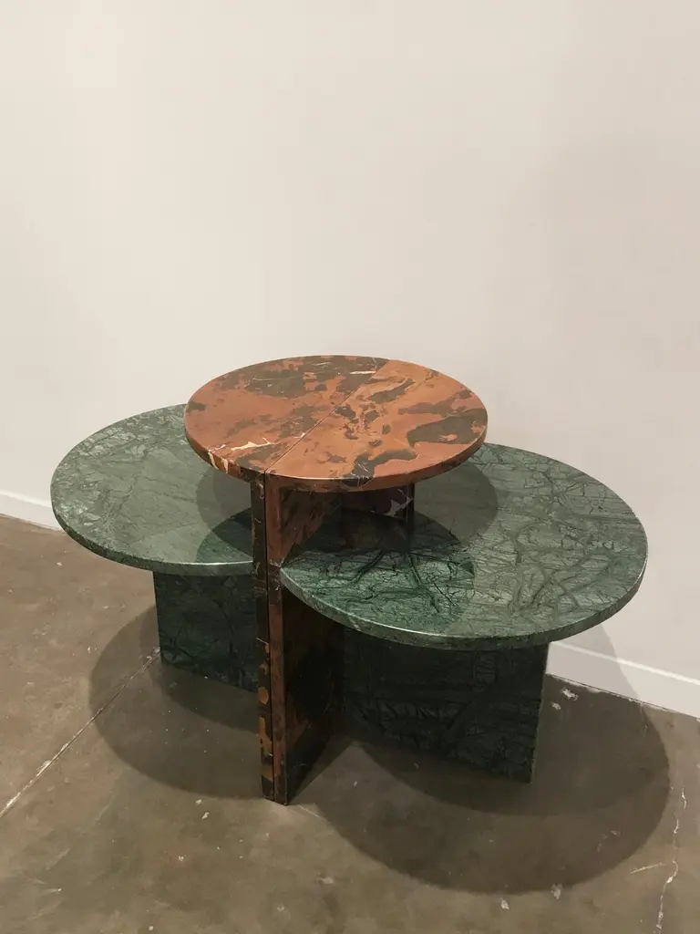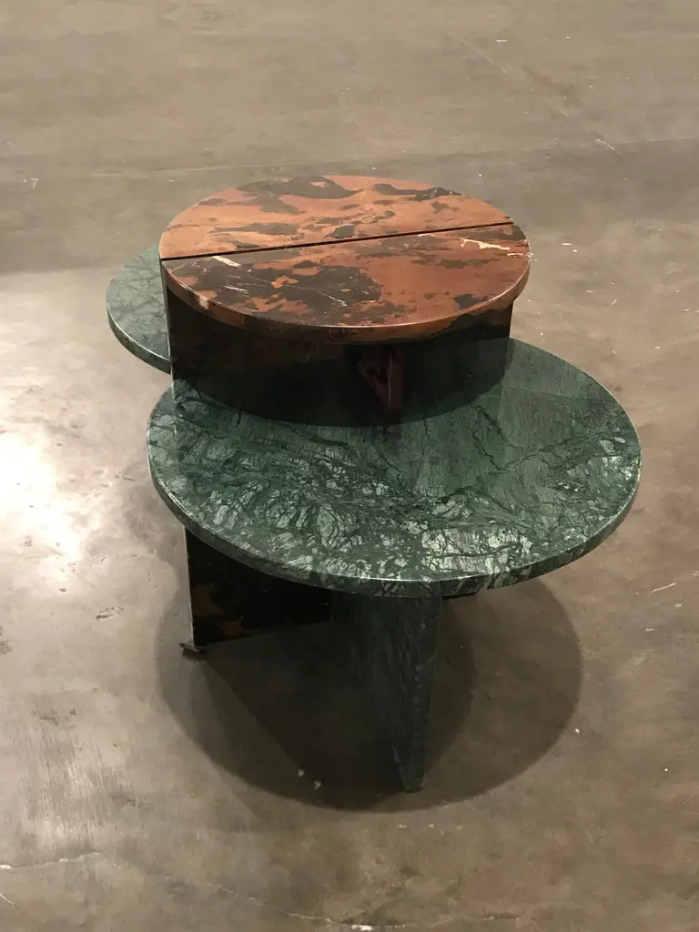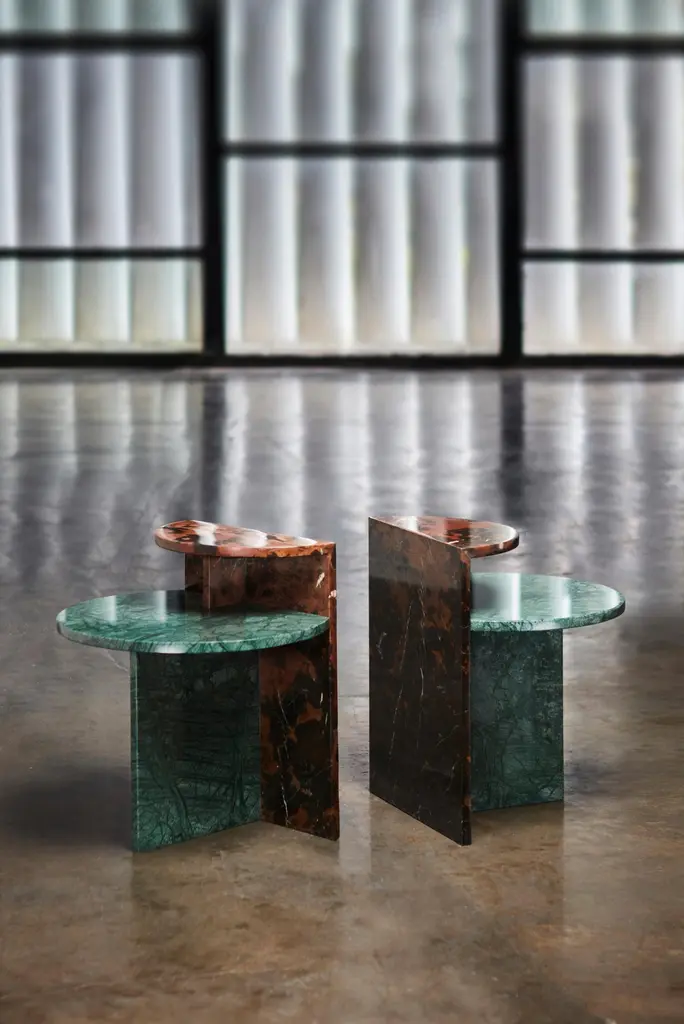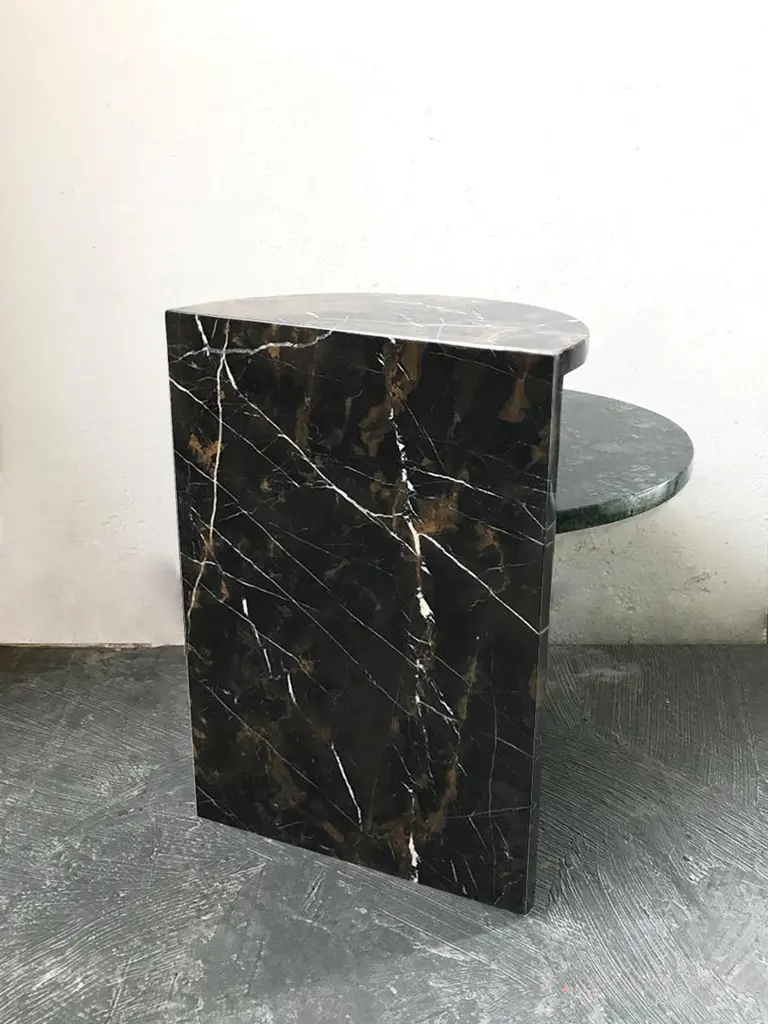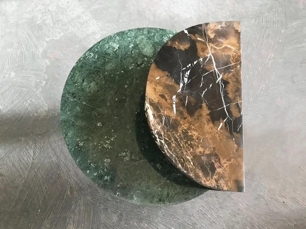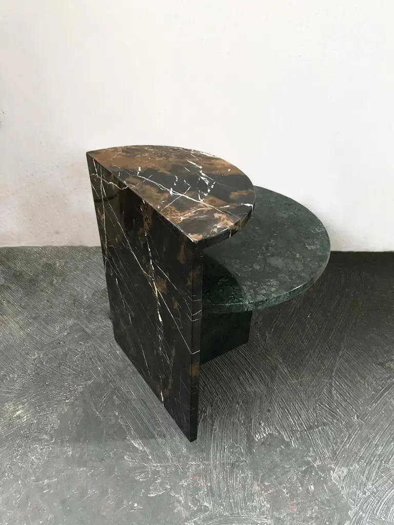 The café side table is made of marble and has simple geometric shapes. Its design with two circular shaped tops and two levels of height make the table a versatile piece that can be used as a coffee table or side table; and in composition with 02 pieces.(Request 02 items to use in pair)Indoor use, public and residential spaces.