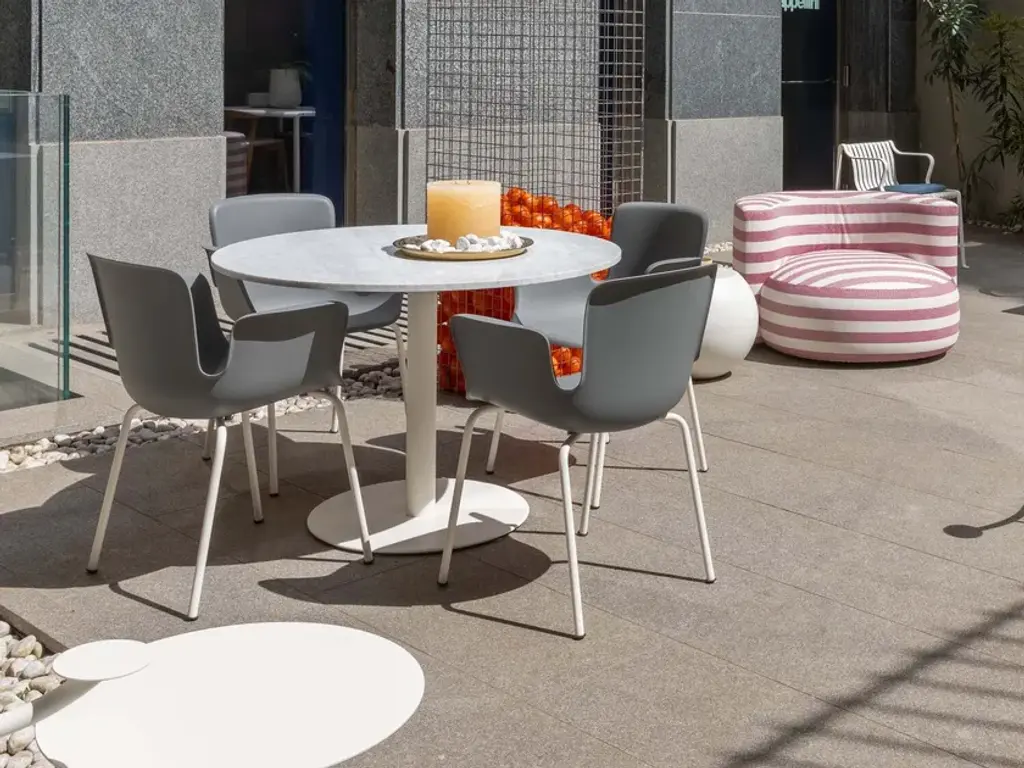 A great classic of the collection, designed by Giulio Cappellini more than twenty years ago, the Break service table is now presented with new outdoor finishes that enhance the light and simple shapes of this product with a strong visual impact. Available in two heights, Break Lido features a central stainless-steel base, matt painted in white colour, and a square or round tabletop, in different dimensions, made of white Carrara marble or vitrified lava stone in the shades of blue or red colour.