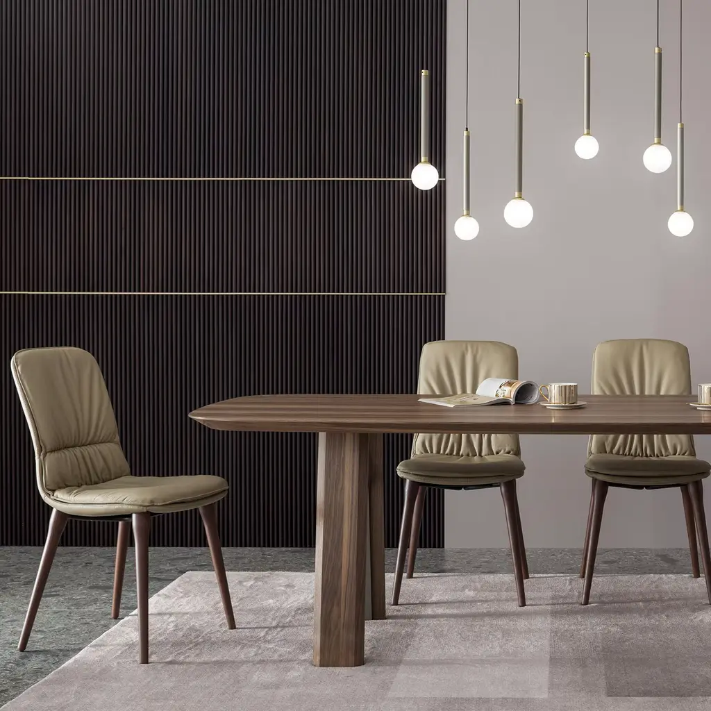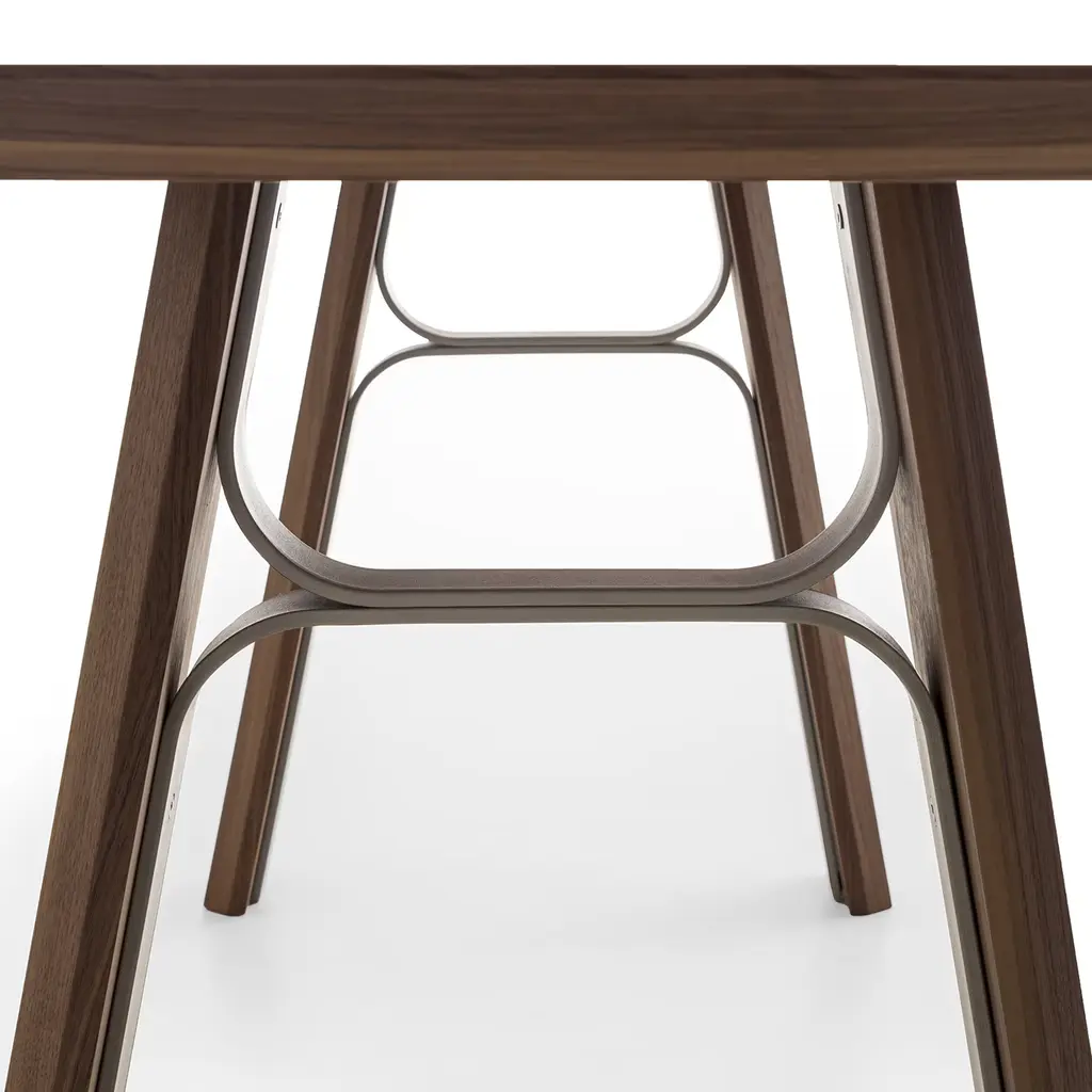 Borrowing its harmonious aesthetic from fluid-lined bridges, this table makes for the perfect solution to gather around with family for special meals. Its lightweight MDF core is enriched with a precious Canaletto walnut veneer, finished with natural oils and reinforced by curved champagne metal beams - varnished with epoxy powders - at the base. The top's 60° border is finished by hand.