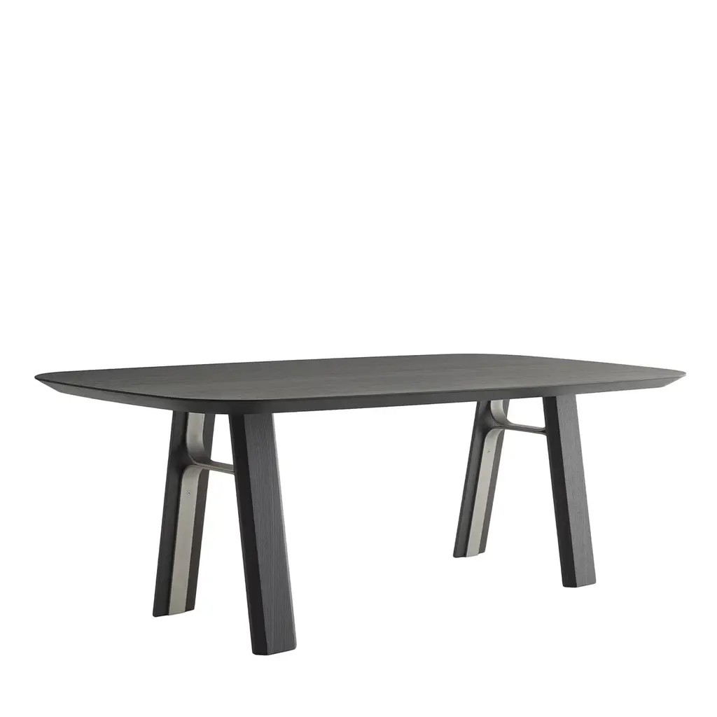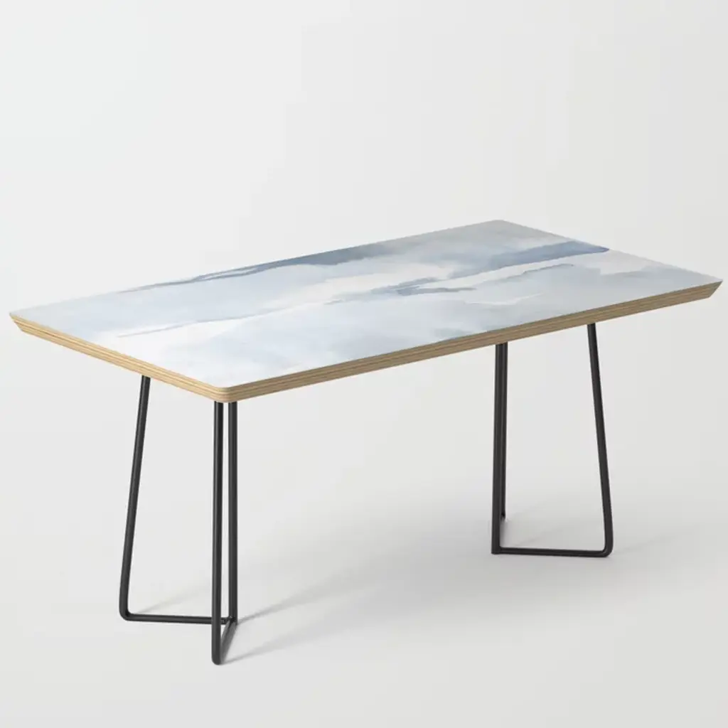 This elegant table is a design defined by the Trinity White marble effect it flaunts printed on its extra-clear tempered glass tabletop. The glass adheres to a shaped lacquered MDF panel marked by a 60° hand-blunted profile, detail softening the bold aesthetic of the Laguna oak-veneered legs that are reinforced using curved metal beams varnished with champagne epoxy powders.