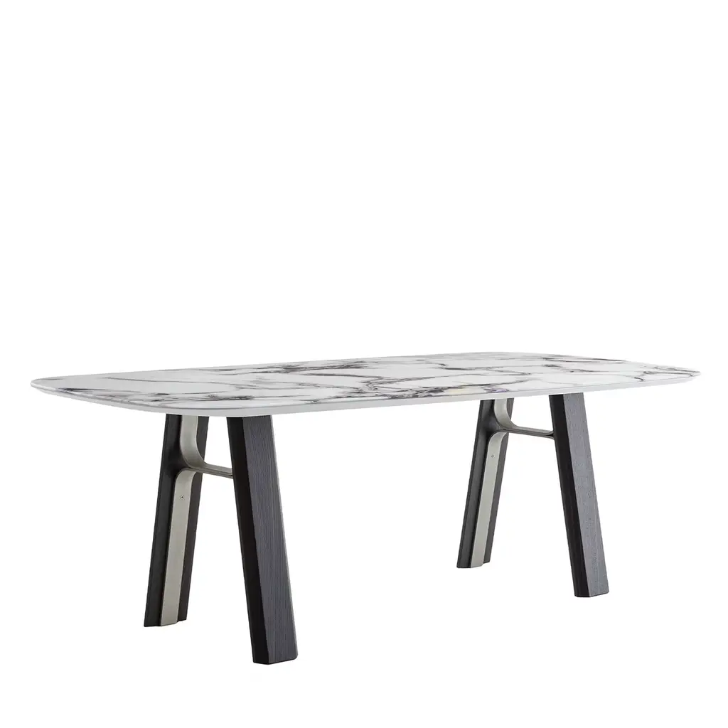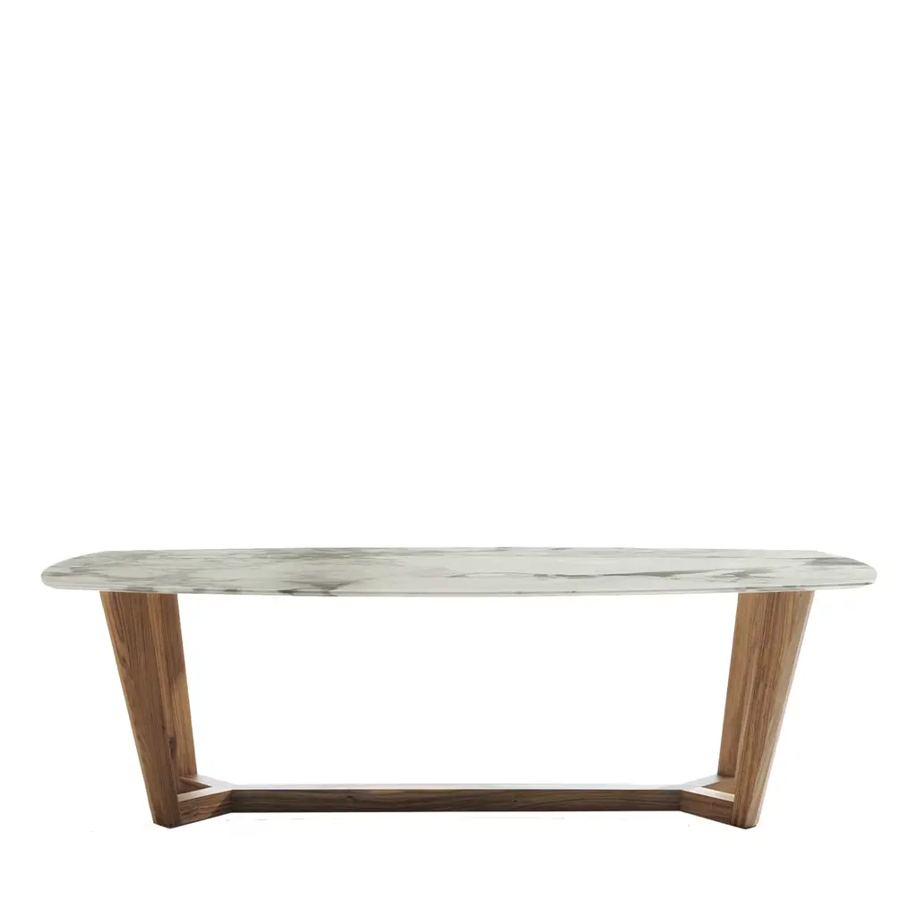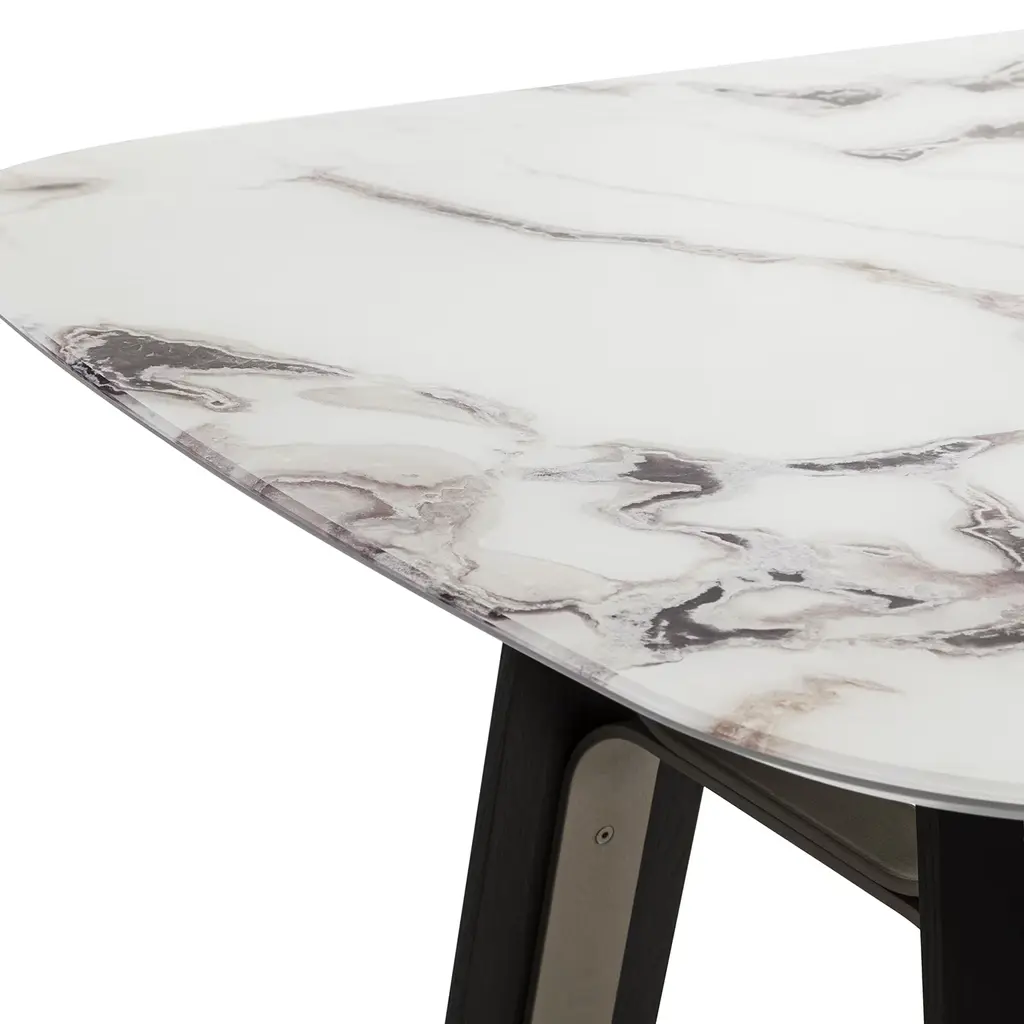Inspired by fluid-lined bridges, this table reinvents opulence with a superb Trinity White marble effect. The faithful marbled pattern gets printed on a shaped tempered glass panel that rests on a lacquered blunted MDF top. Deep-toned Laguna oak veneer accents the bold slanted MDF legs, which result reinforced by means of curved metal beams varnished with champagne epoxy powders.