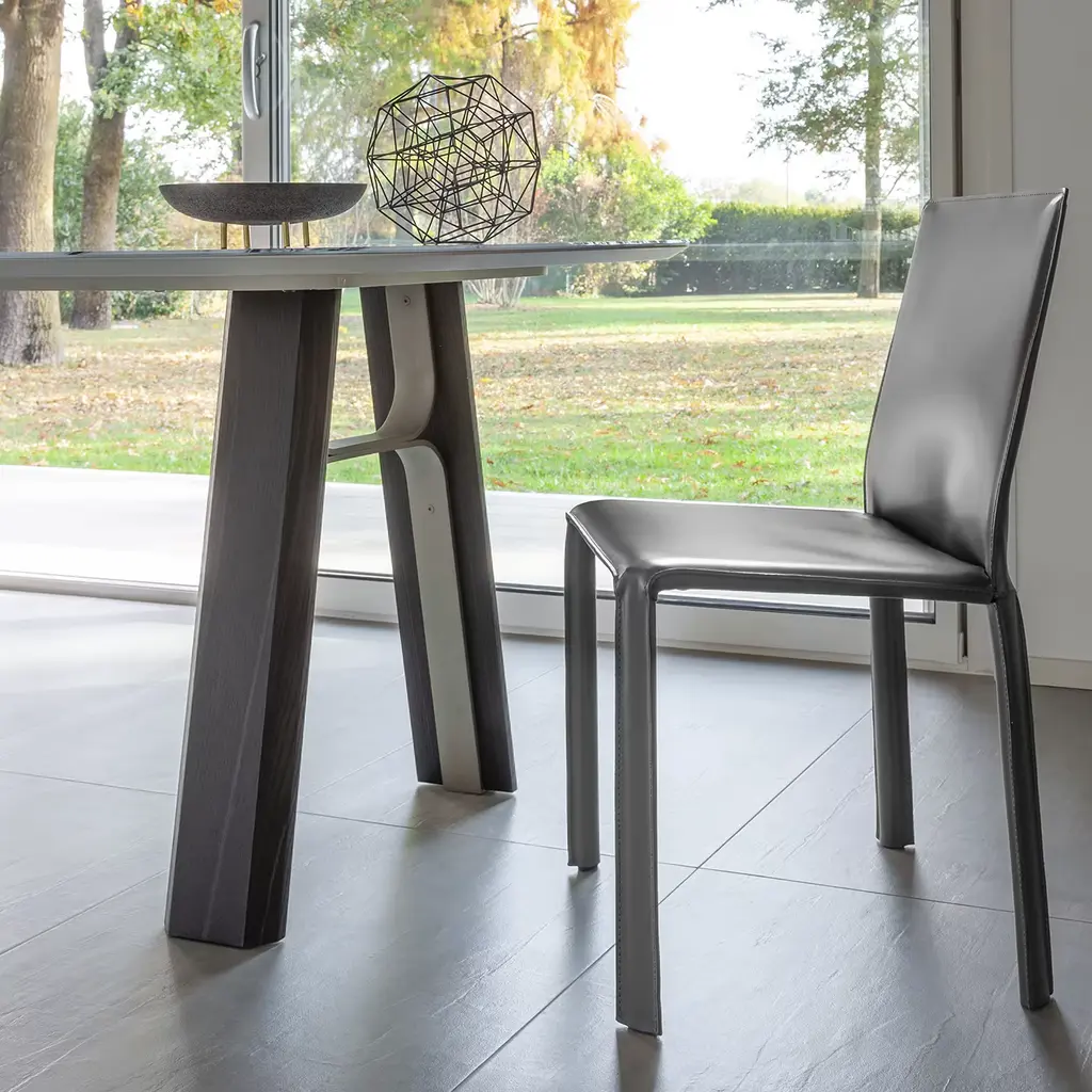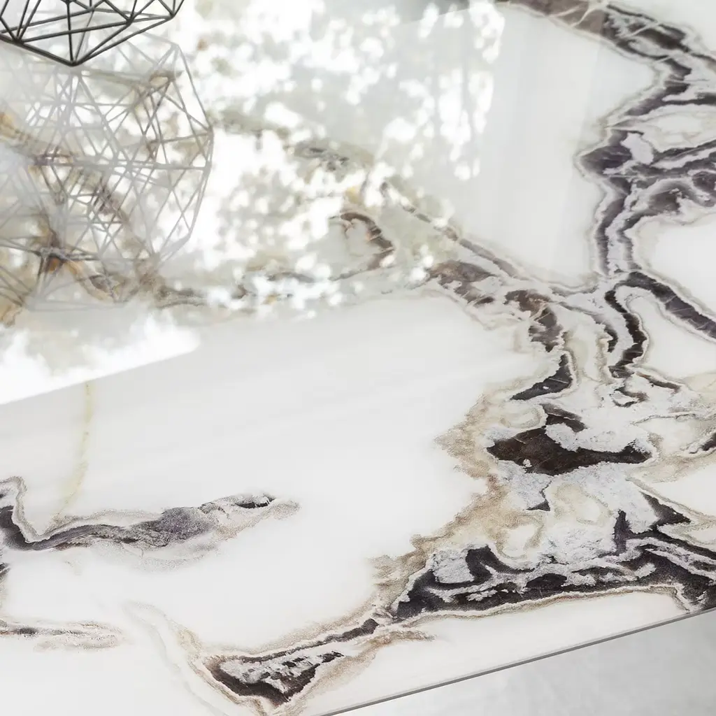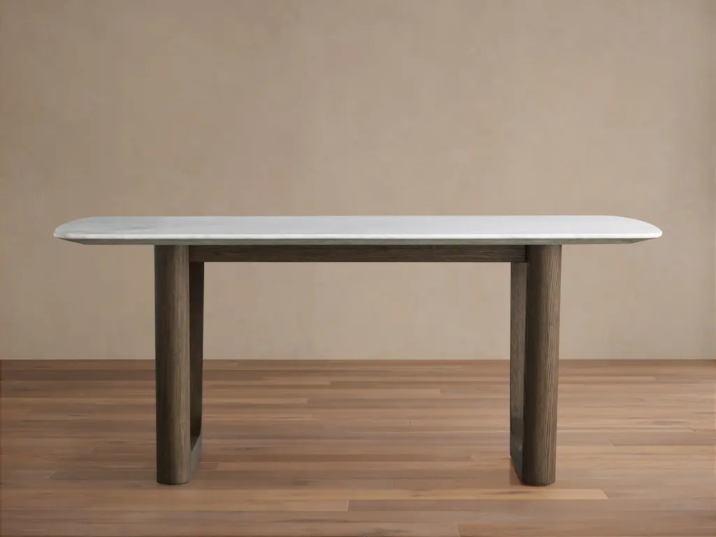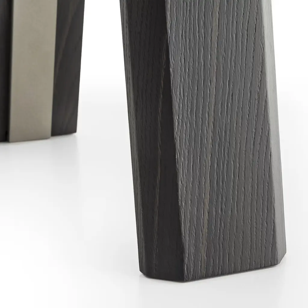 Inspired by fluid-lined bridges, this table reinvents opulence with a superb Trinity White marble effect. The faithful marbled pattern gets printed on a shaped tempered glass panel that rests on a lacquered blunted MDF top. Deep-toned Laguna oak veneer accents the bold slanted MDF legs, which result reinforced by means of curved metal beams varnished with champagne epoxy powders.