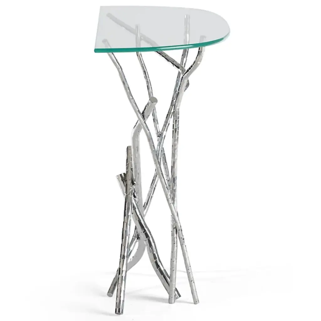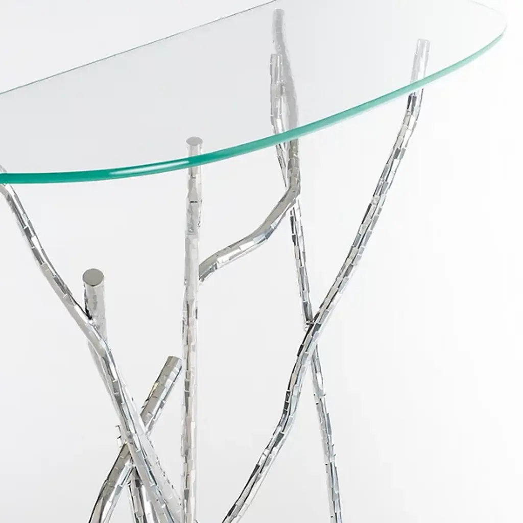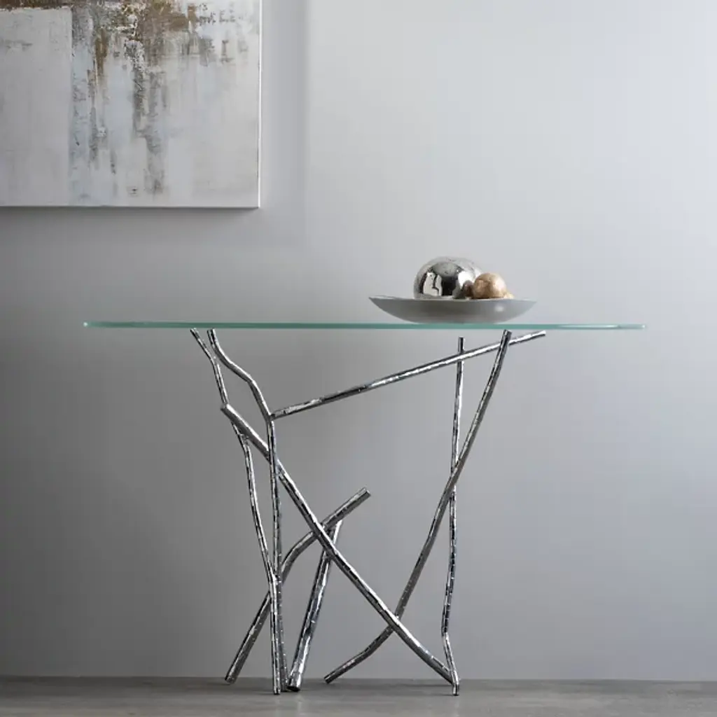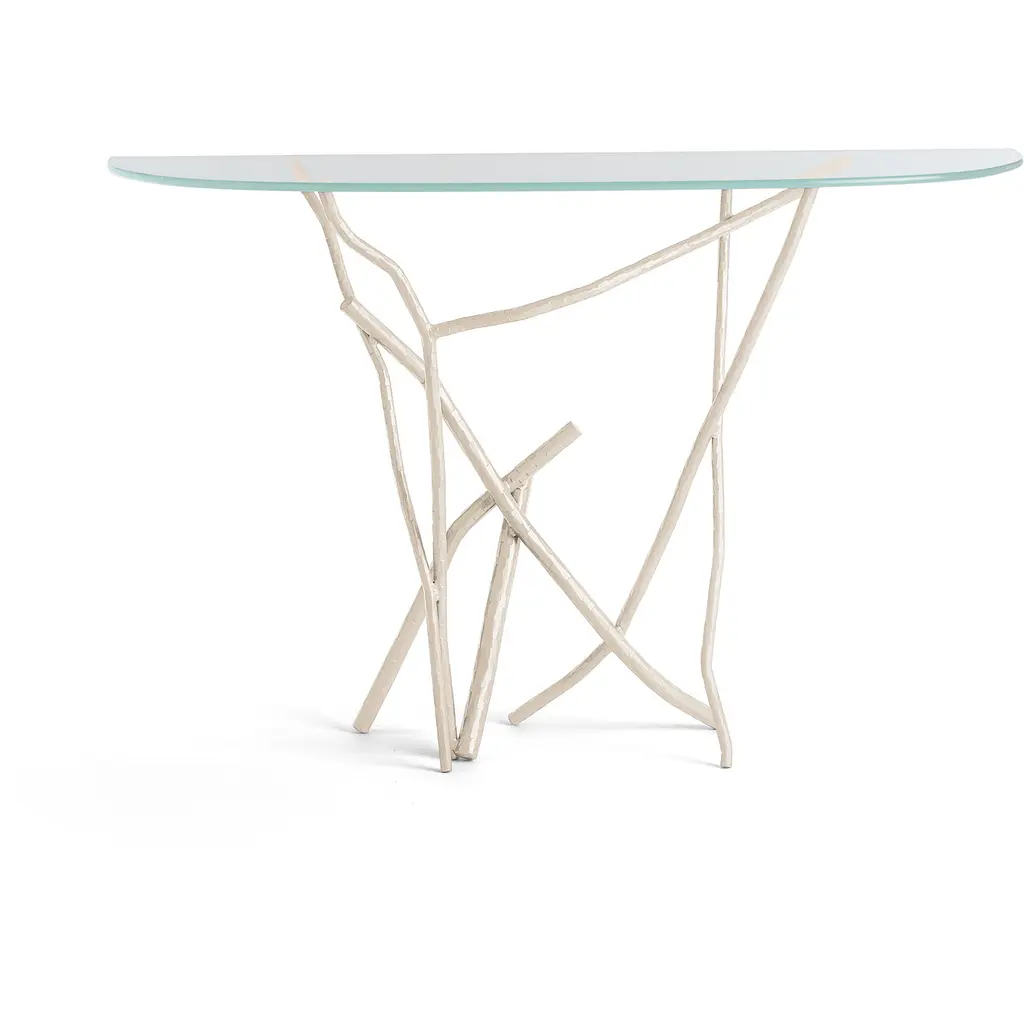 Graceful, sculptural, organic. Present key decorative objects atop the dramatic, handcrafted branch composition of the Brindille Console Table from Hubbardton Forge. Complementing the rounded front, the table top features a sharp-edged back to sit flush against a sofa, wall, or bed frame. The tabletop’s clear construction gives objects placed on top an eye-catching floating effect. Aluminum branches below also move the eyes through their sharp angle changes and hand-hammered organic texture. The console’s minimalist pairing of aluminum and glass complements both understated and décor-rich spaces.