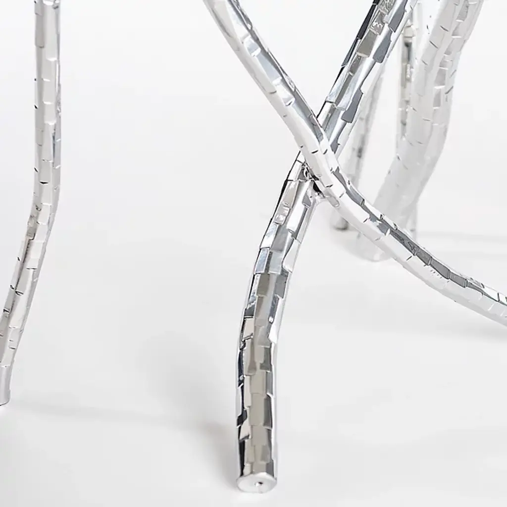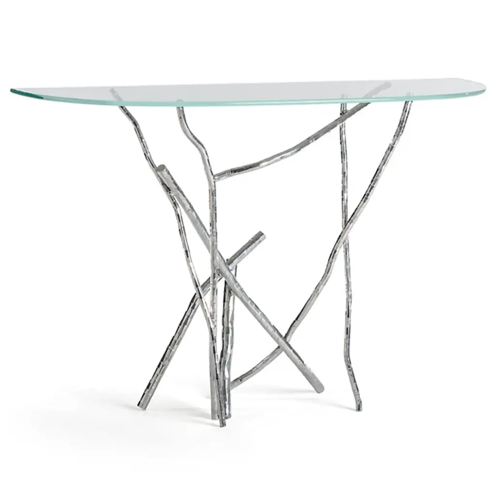 Graceful, sculptural, organic. Present key decorative objects atop the dramatic, handcrafted branch composition of the Brindille Console Table from Hubbardton Forge. Complementing the rounded front, the table top features a sharp-edged back to sit flush against a sofa, wall, or bed frame. The tabletop’s clear construction gives objects placed on top an eye-catching floating effect. Aluminum branches below also move the eyes through their sharp angle changes and hand-hammered organic texture. The console’s minimalist pairing of aluminum and glass complements both understated and décor-rich spaces.