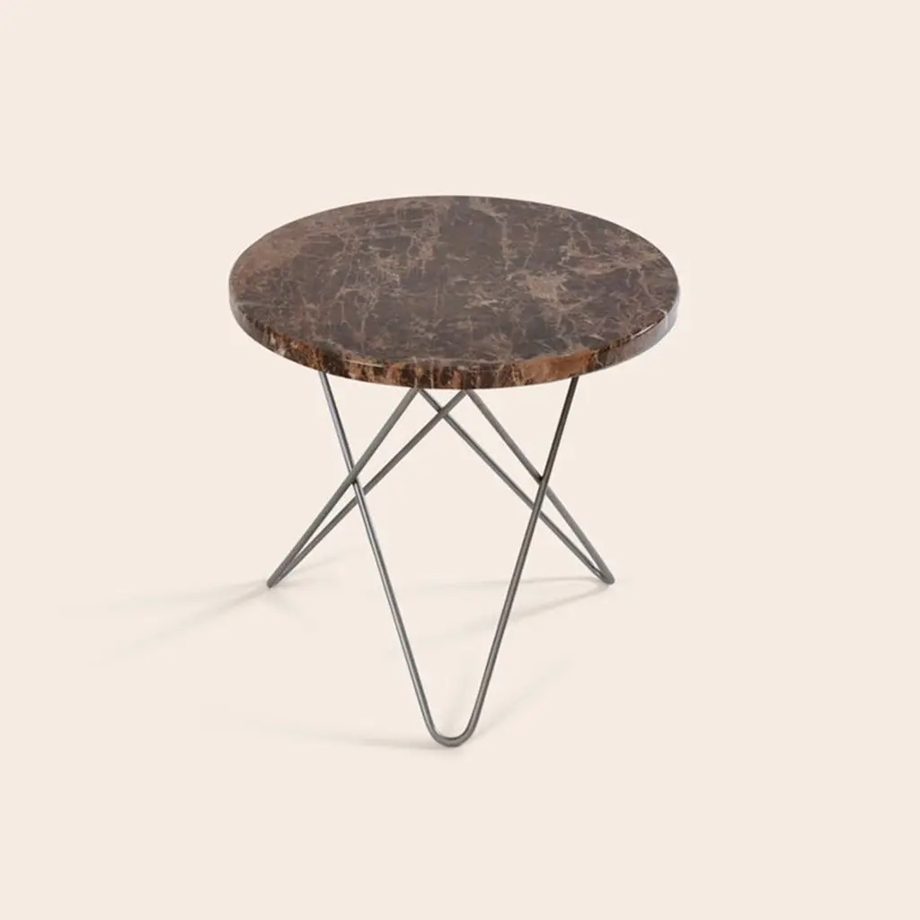 Brown Emperador marble and steel mini o table by Ox DenmarqDimensions: D 40 x H 37 cmMaterials: steel, brown emperador marbleAlso available: different top and frame options availableOx Denmarq is a Danish design brand aspiring to make beautiful handmade furniture, accessories and lighting in natural high-quality materials in fair prices. " When we set out back in 2003, we were primarily working with vegetable-tanned saddle leather thus the name OX was a tribute to our unique leather and the animal providing it.The other half of our name, DENMARQ, is chosen to emphasize that we are a Danish design brand based on the Danish design tradition and that most of our furniture is produced in Denmark. However, Denmarq not only refers to our home country, but also to the co-founder and designer - Dennis Marquart.Before finishing his design studies at the Copenhagen Design University, Dennis Marquart did a Blacksmith education. This background is extremely useful when developing and designing products."Ox Denmarq handmade products will only get more beautiful as time passes and natural patina sets in.Many OX products are shaped around marble or vegetable-tanned saddle leather. Stone and leather are materials that will, and should, get marks over time. But they will also age with a very special beauty. When you learn to appreciate the beauty of maturity and of time passing, you have learned to appreciate patina the way it should be appreciated.