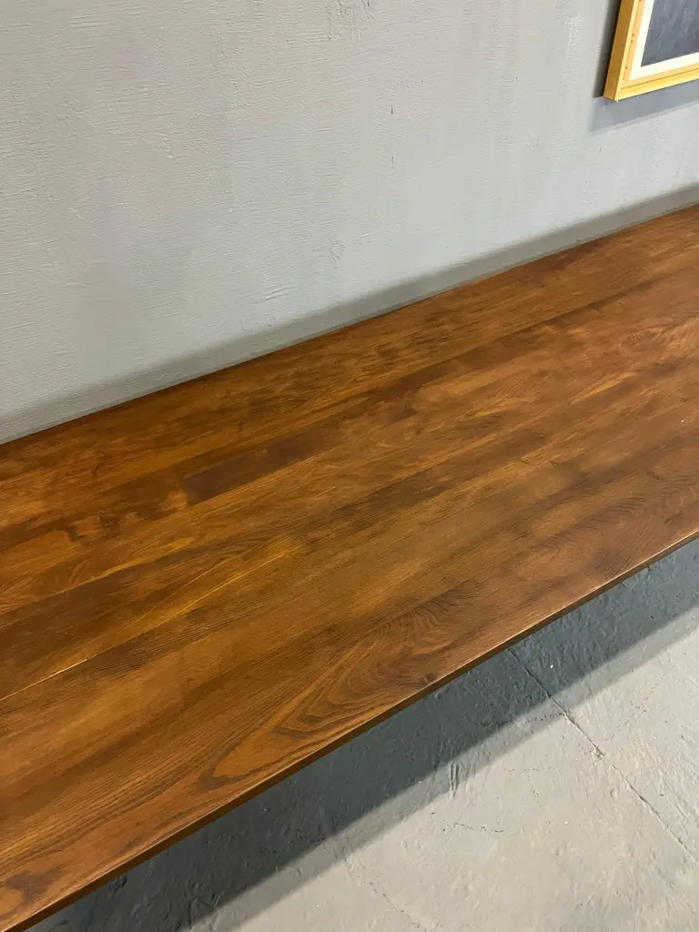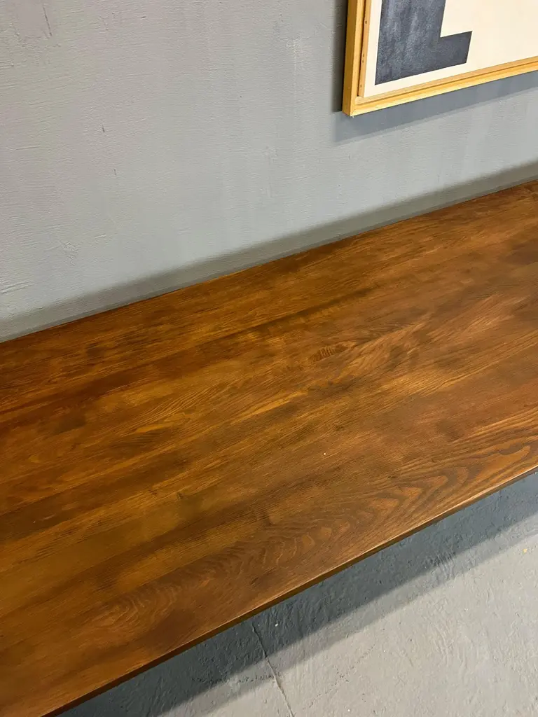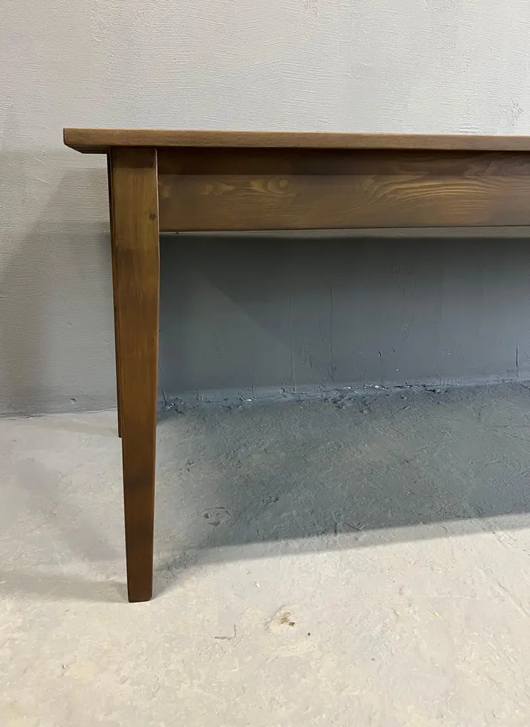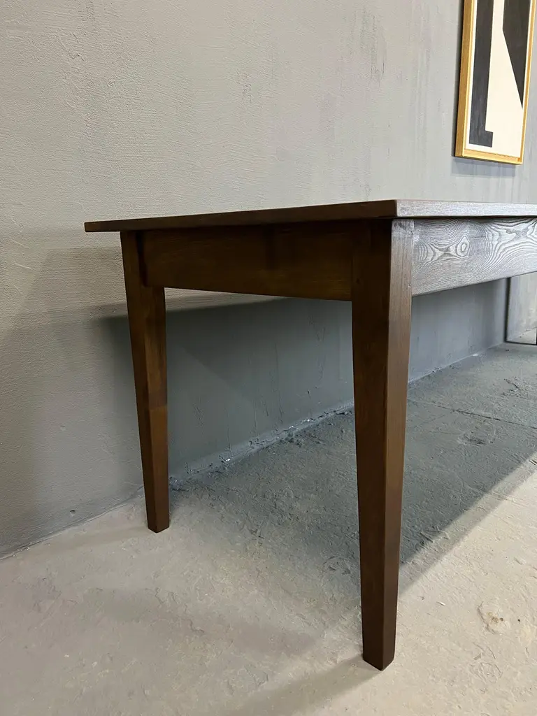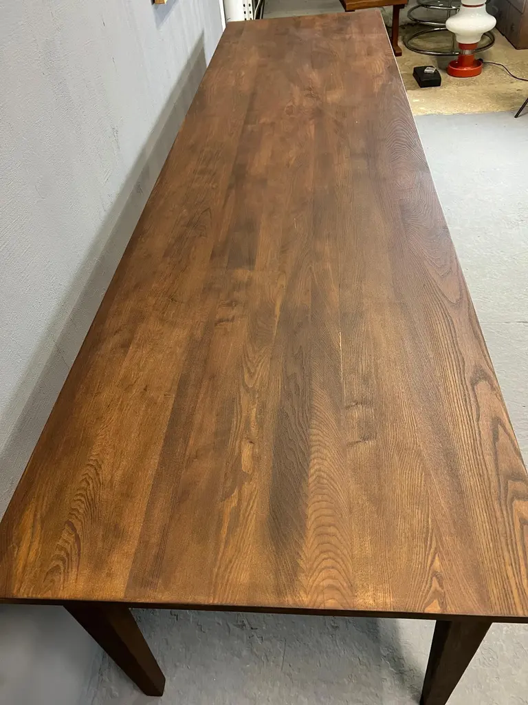 Very nice table 3 meters long in solid ash. It is made up of a 2 cm thick top and its dimensions are ideal to accommodate up to 14 guests easily: 3 meters long, 90 cm wide and 77 cm high with a height under the band of 63.5 cm. It is beautifully crafted and uses the traditional carpentry techniques of old tables, reinforced by a screwing of the top over the entire length of the crosspieces. With its tapered feet, it has a crazy class and its quality of manufacture makes it an investment over several decades. The table is varnished 2 coats in light oak tint, which will protect the wood on a daily basis. It will acquire a patina over time and its charm will increase over time. Its weight is about 40 kg, it is very stable and very solid, its heavy weight attests to the durability and the overall appearance of this table. Length: 3 meters. Width: 90cm. Height: 77cm. Height under headband: 63.5 cm.