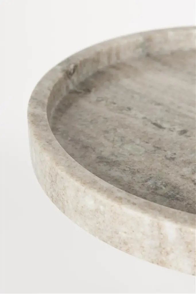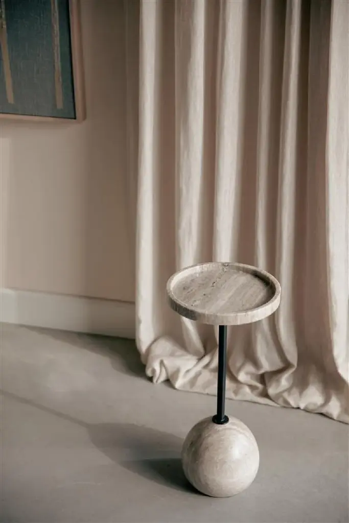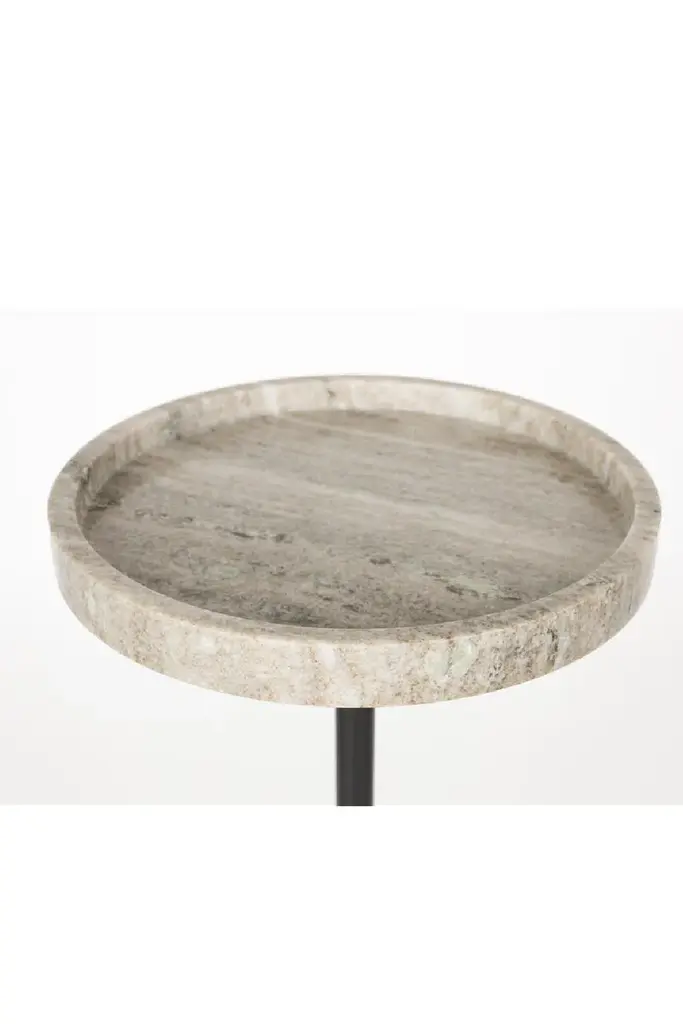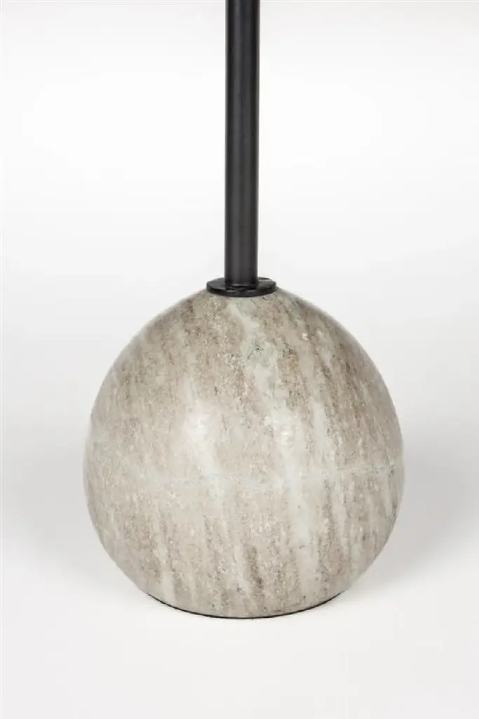 The brown marble top exudes class and luxury, while the round base in the shape of a ball adds a playful accent. The raised edge around the table top ensures that your glasses remain stable, and the black iron stem in the middle provides support.