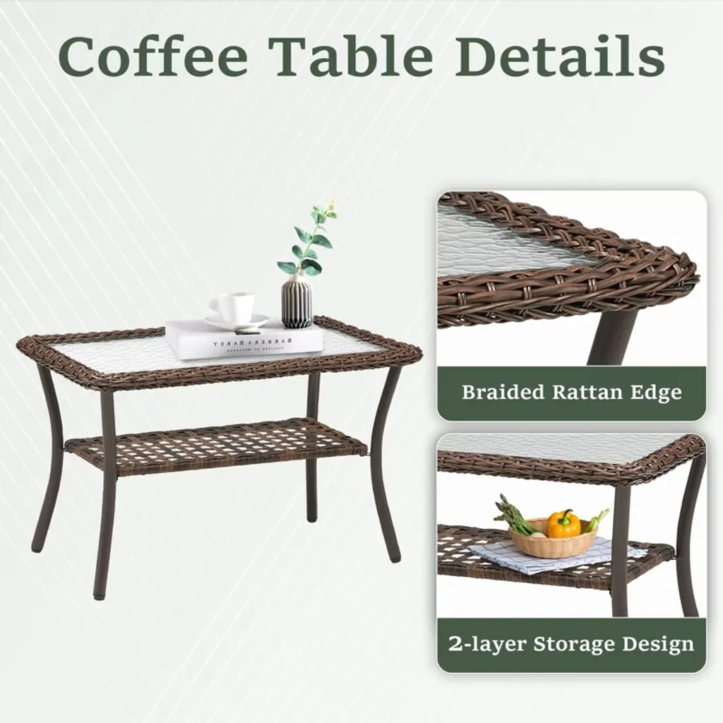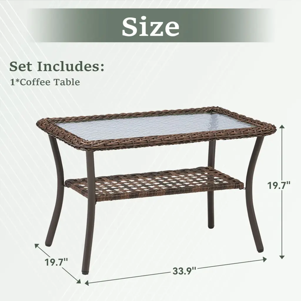 Elevate your outdoor living with the Buenhomino Outdoor Coffee Table. This stylish and functional piece combines a sleek tempered glass top for easy cleaning with a spacious lower storage shelf for organization. Crafted from durable, UV-resistant PE wicker and a sturdy iron frame, this wicker patio coffee table is built to last through the seasons. Its versatile design perfectly complements any patio, balcony, or porch, providing a perfect spot for drinks, decor, and relaxation.