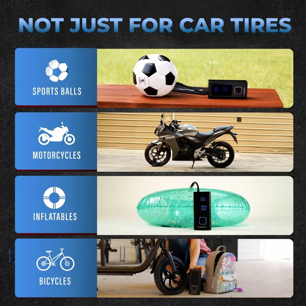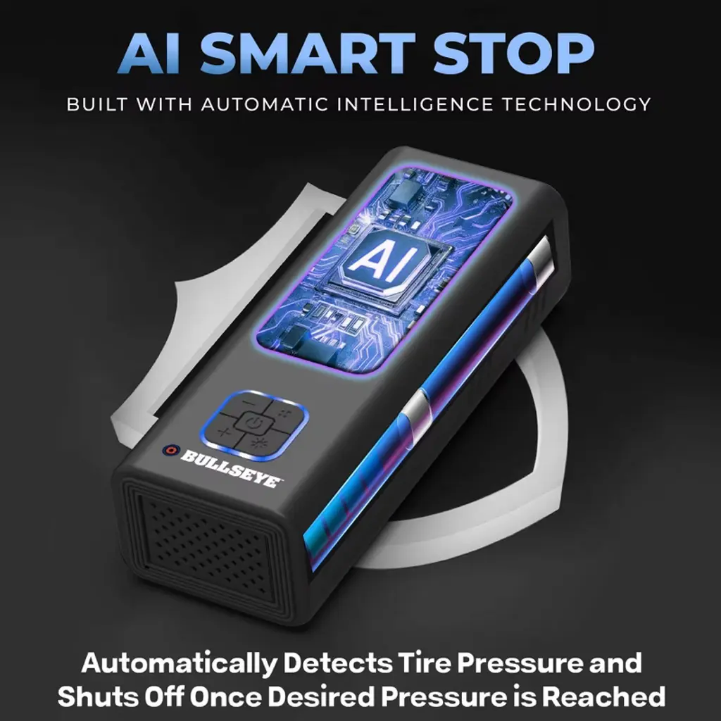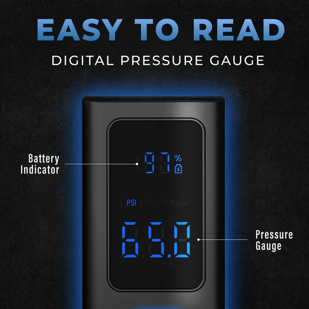 The Bullseye Pocket Air Pro is the next-generation portable tire inflator and powerbank, designed for those who need more power and versatility on the go. With an upgraded 6000 mAh battery and a higher maximum pressure of 120 PSI, the Pro model delivers faster and more efficient inflations than its predecessor. Despite its enhanced capabilities, it remains compact at 7" x 2.5" x 1.75", fitting conveniently into your car, backpack, or emergency kit for easy access anytime, anywhere. The Bullseye Pocket Air Pro features an LED display that provides real-time tire pressure readings and battery status, while the auto shut-off ensures precise inflation by automatically stopping at the desired PSI. Its built-in 50-lumen flashlight is ideal for nighttime emergencies, offering illumination when needed. The powerful 6000 mAh powerbank allows you to charge your phone or other devices, keeping you connected on the road. Perfect for inflating car tires, bicycles, motorcycles, and sports equipment, this versatile inflator includes a 6" air hose with a Schrader valve, a Presta valve adapter, two nozzle adapters, and an inflation needle. Whether you're topping off tire pressure or preparing for outdoor adventures, the Bullseye Pocket Air Pro is the ultimate portable solution for inflating and emergency power needs.