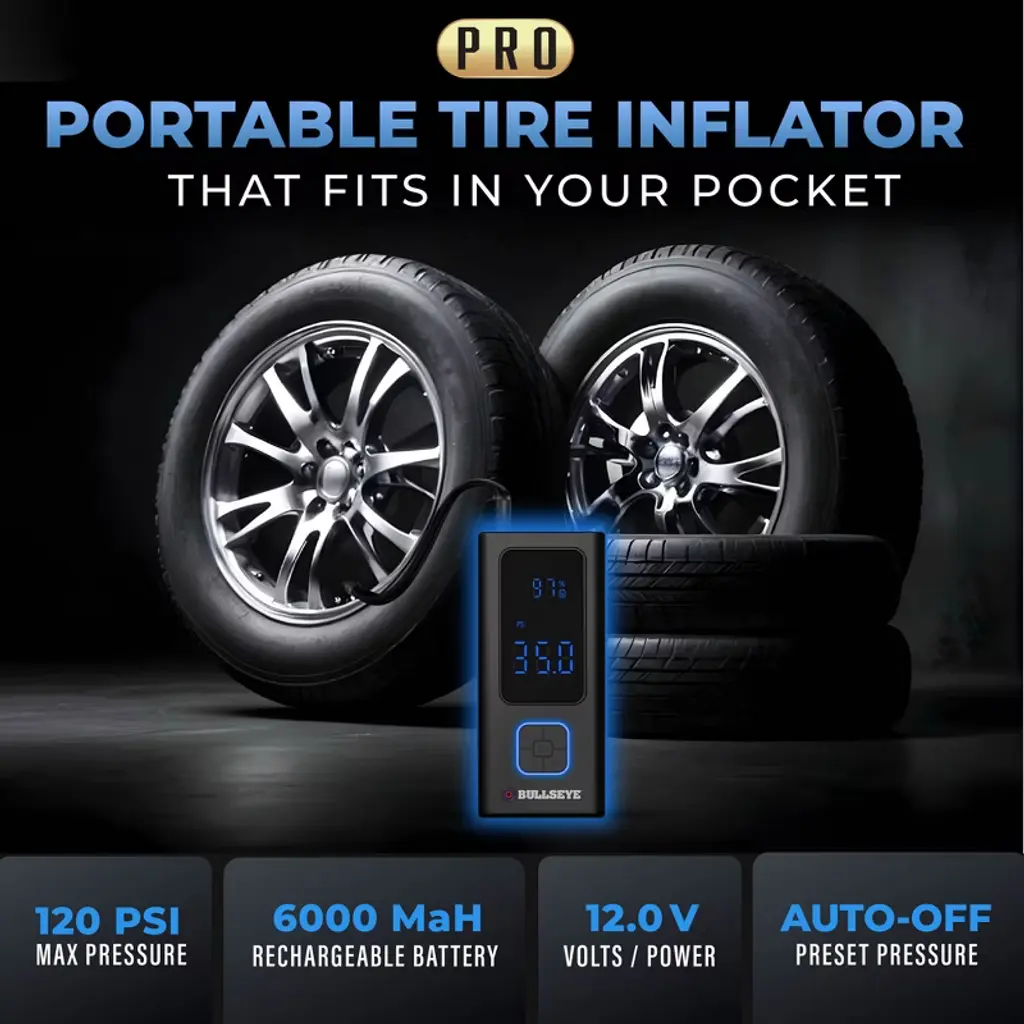 Bullseye Pocket Air Pro Tire Inflator Powerbank Electric Air Compressor Portable Pump Car Bike 120 Psi Led Gauge 6000 Mah