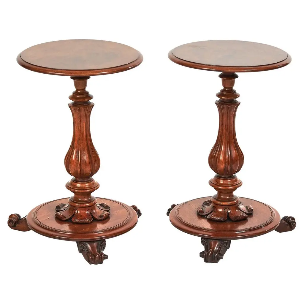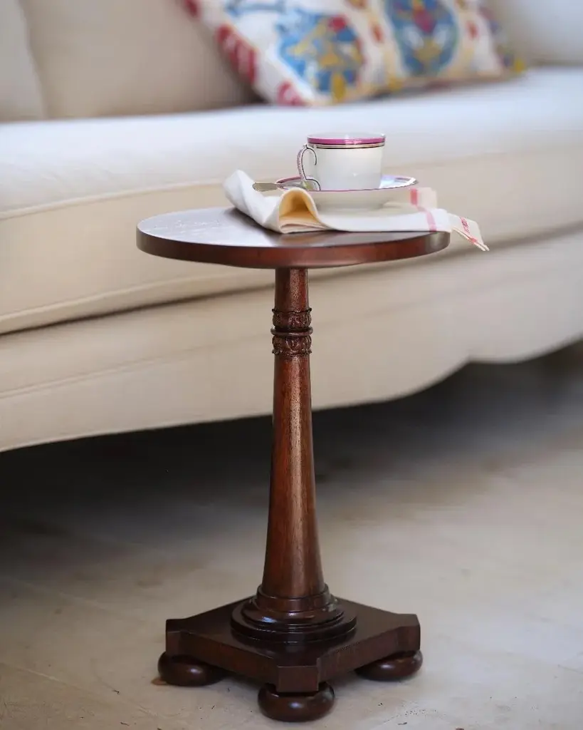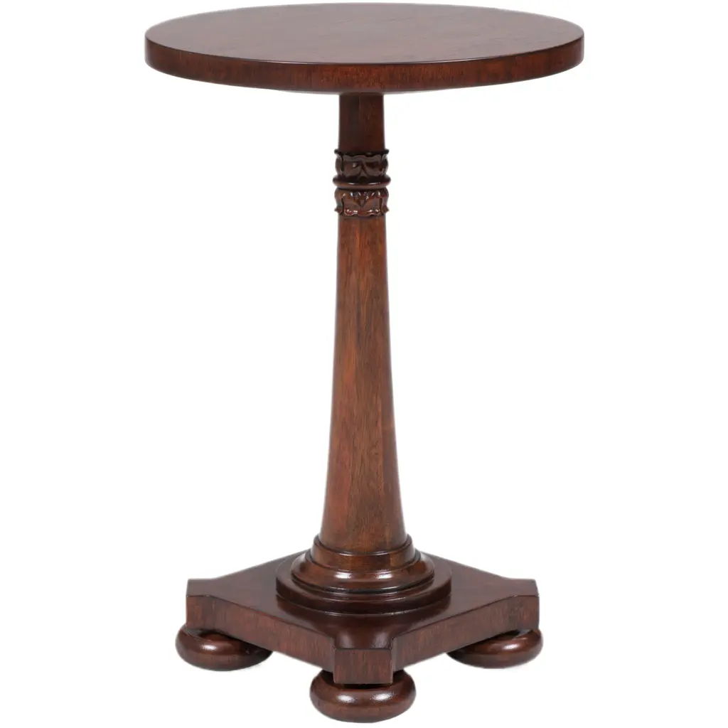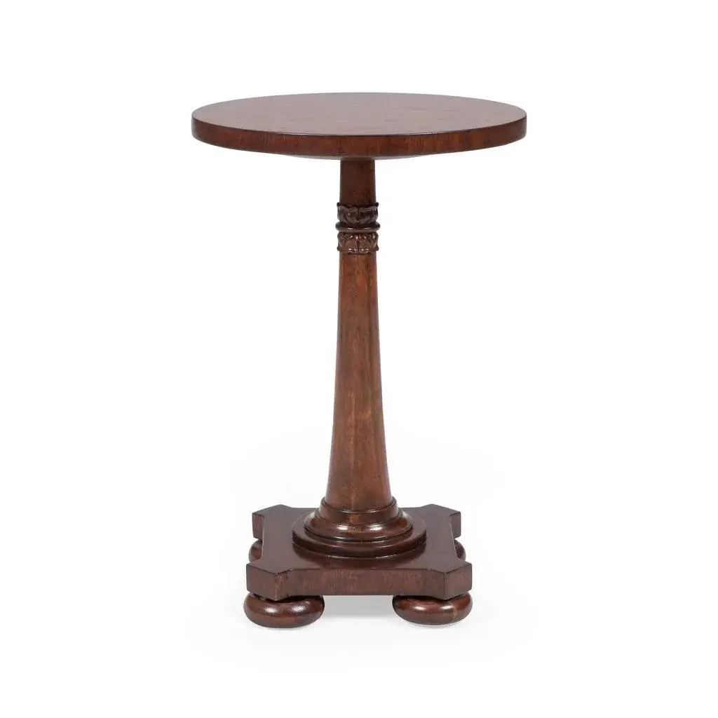 Goncalo Alves, sometimes called Tiger-wood, is a stunning hardwood that often grows in neotropical forests such as those of Brazil. Our sustainably sourced Bun Foot Drinks Table is faux-stained to mimic the grain of Goncalo Alves, with a traditionally minded form complete with bun feet and collar-turned and carved neck. Dimensions: 12" Diameter x 18"H
