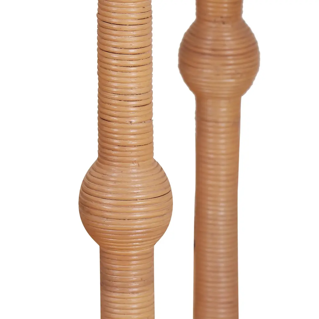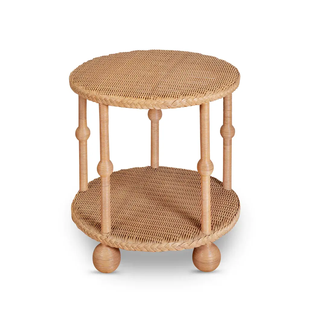 A fanciful, capacious drinks table, the Lucas has a blitheful spirit, with spherical feet echoed in the smaller spheres which bifurcate its legs. Braiding around the top and lower shelf make this a cousin of our Kenan table, and recalls the work of late 19th and early 20th century American wicker furniture makers. Natural rattan is suitable for use indoors or on a covered porch, loggia, or veranda.
