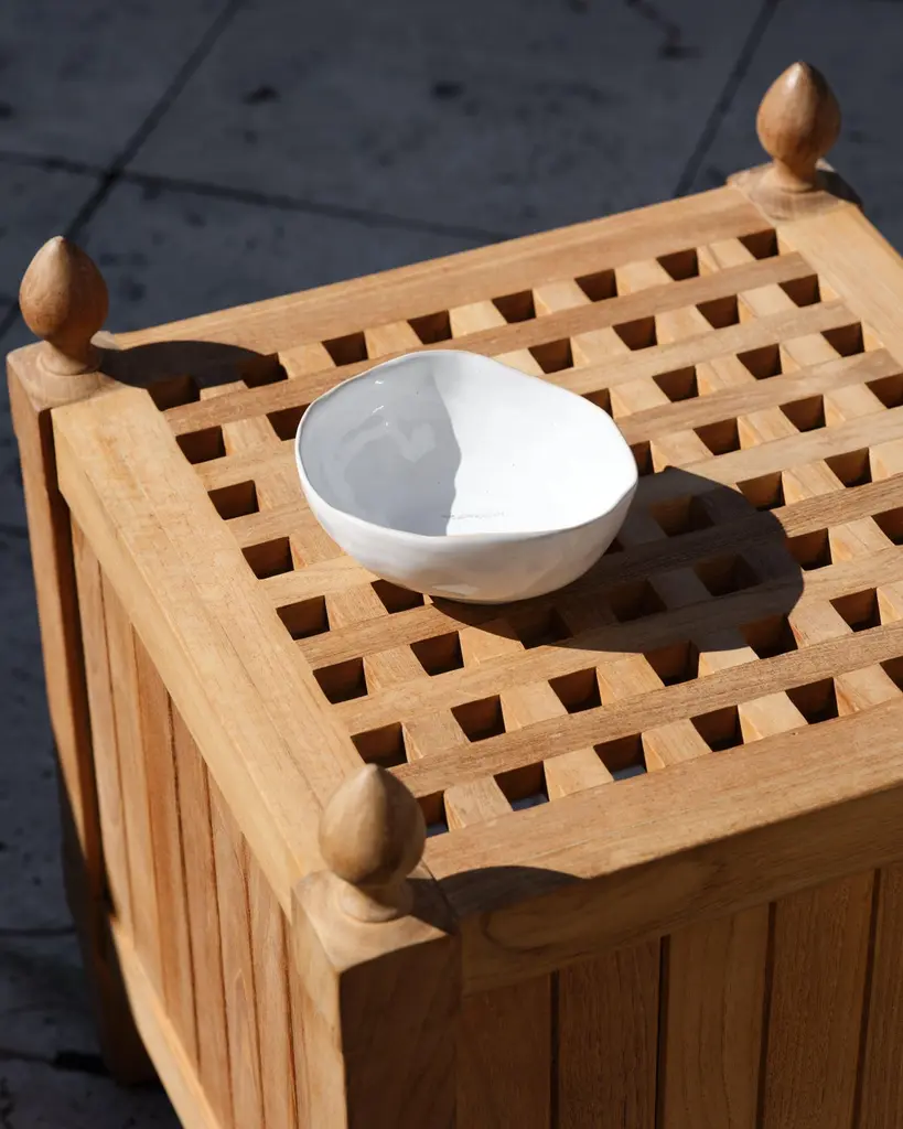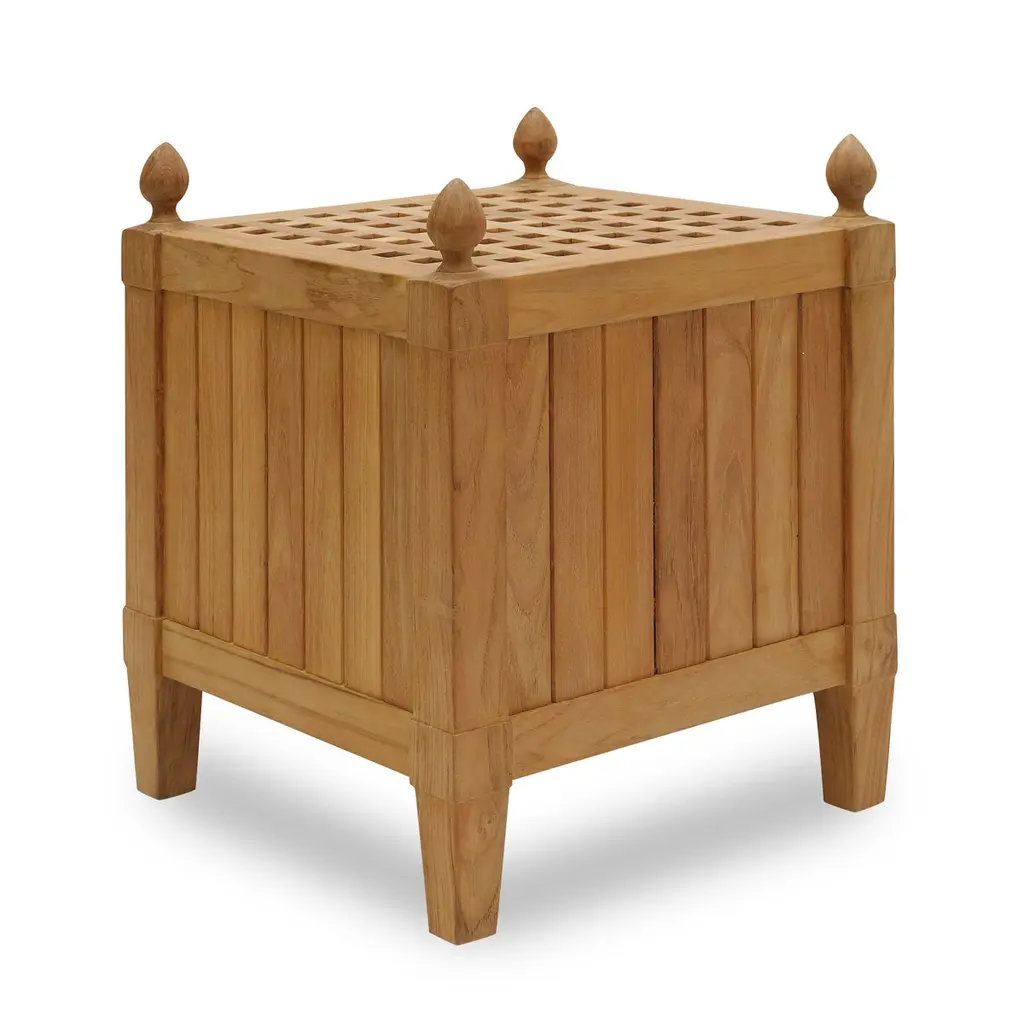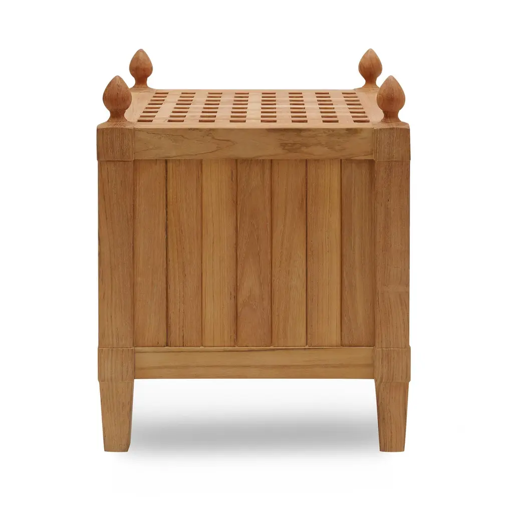 A nod to the iconic planters of the Versailles Orangerie, this teak drinks table balances classical inspiration with practical design. Four teardrop-shaped finials add a sculptural flourish, while slatted sides and an open checkerboard top allow water to drain effortlessly. Crafted from teak, it will weather to a silvery patina over time, only growing more handsome with age—just like the best gardens do.