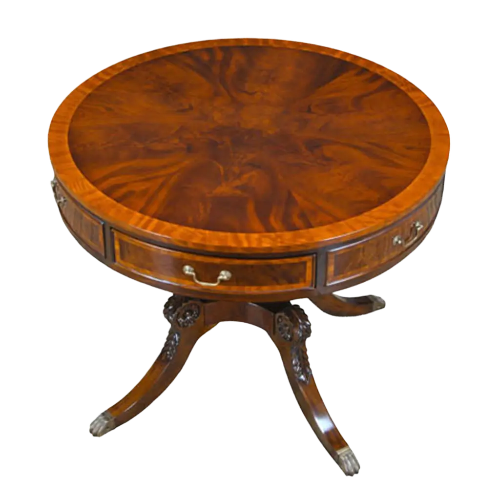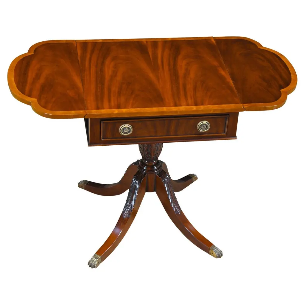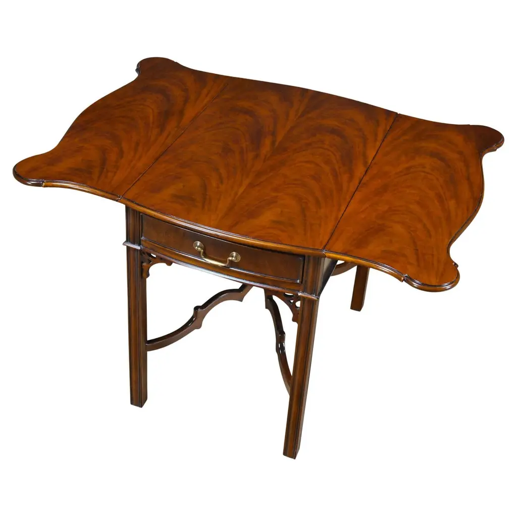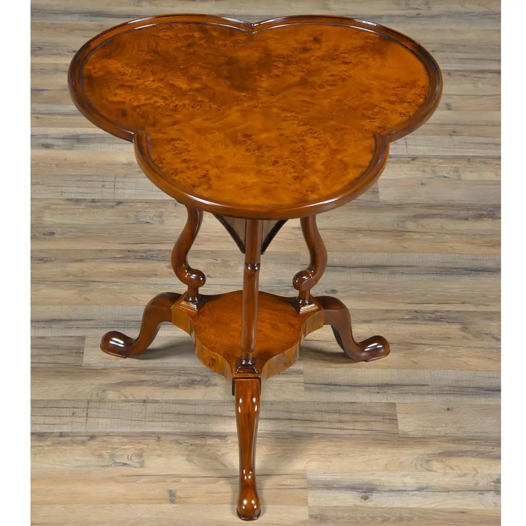 A high quality, clover top shaped Burled Clover Table produced by Niagara Furniture. Also traditionally referred to as a wine table. Beautifully shaped and presented top, supported by curved and shaped supports and resting on three solid mahogany legs, dovetailed into the center platform for added strength and stability.Measures 26.5″w x 24″d x 27.5″h metric 69 61 71
