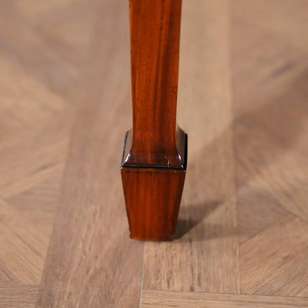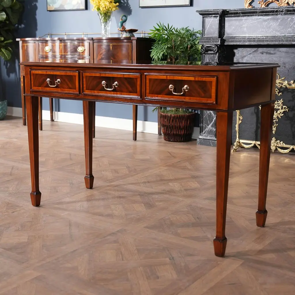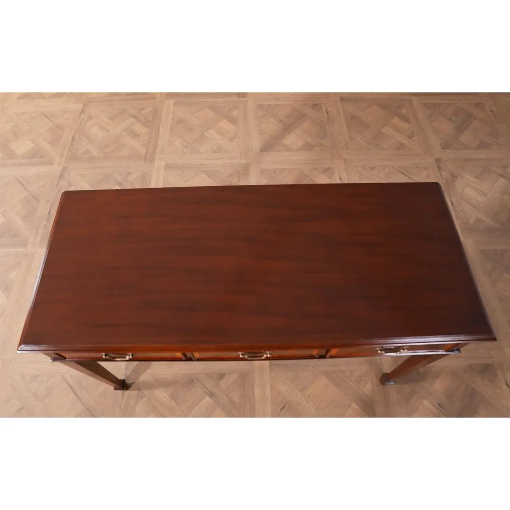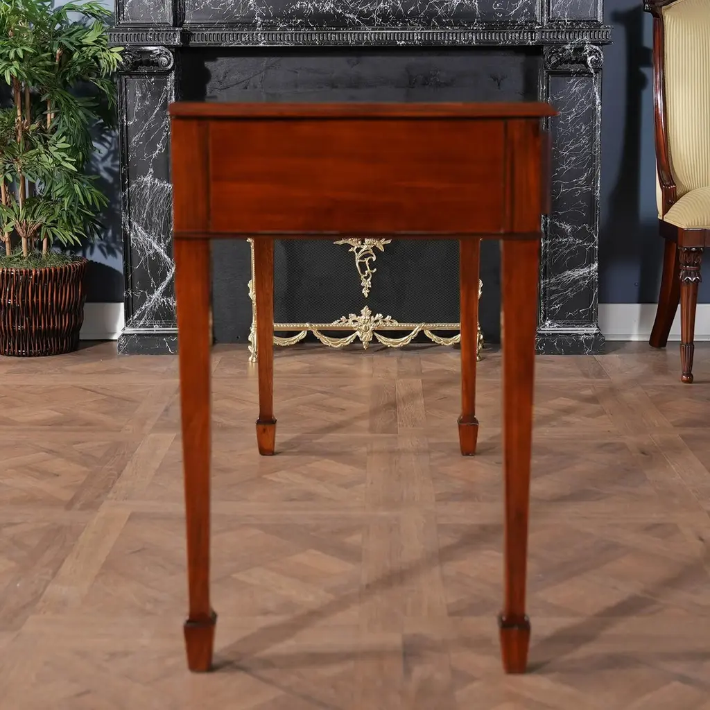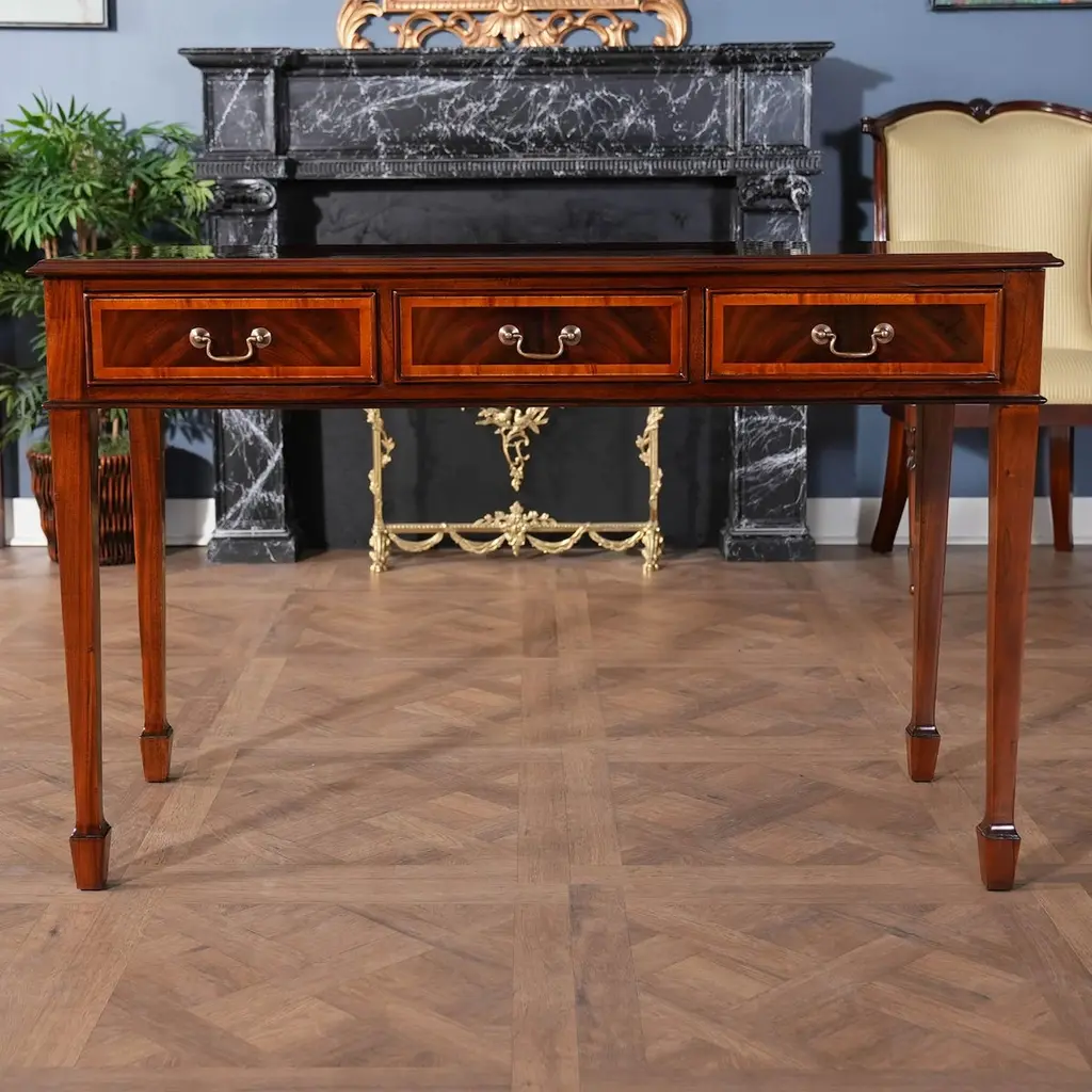 An elegant Burled Writing Table from Niagara Furniture which is perfect either at home or in the work office. Features include a large brown leather tooled top, made from full grain genuine leather, a flat edge profile with cookie cutter corners, three dovetailed drawers and finely tapered, reeded legs which end in solid brass caps. The legs of our Burled Writing Table are removable for ease of shipping and handling. Overall a very beautiful and functional desk with a large work surface, the visitor side is finished with burled wood veneers surrounded by moldings in the shape of faux drawers.Approximate height to the bottom of the drawer bank is 23.5 inches.Measures 45″w x 30″d x 30″h metric 114 76 76