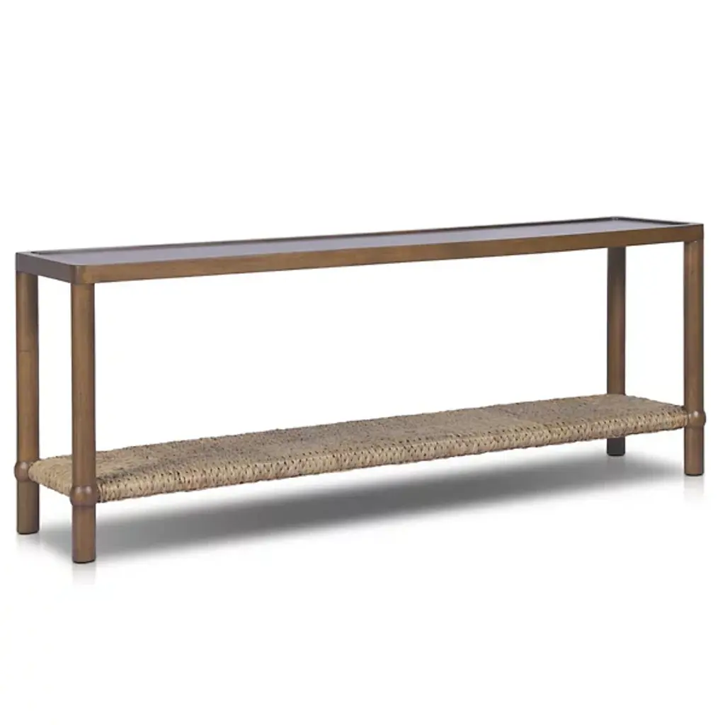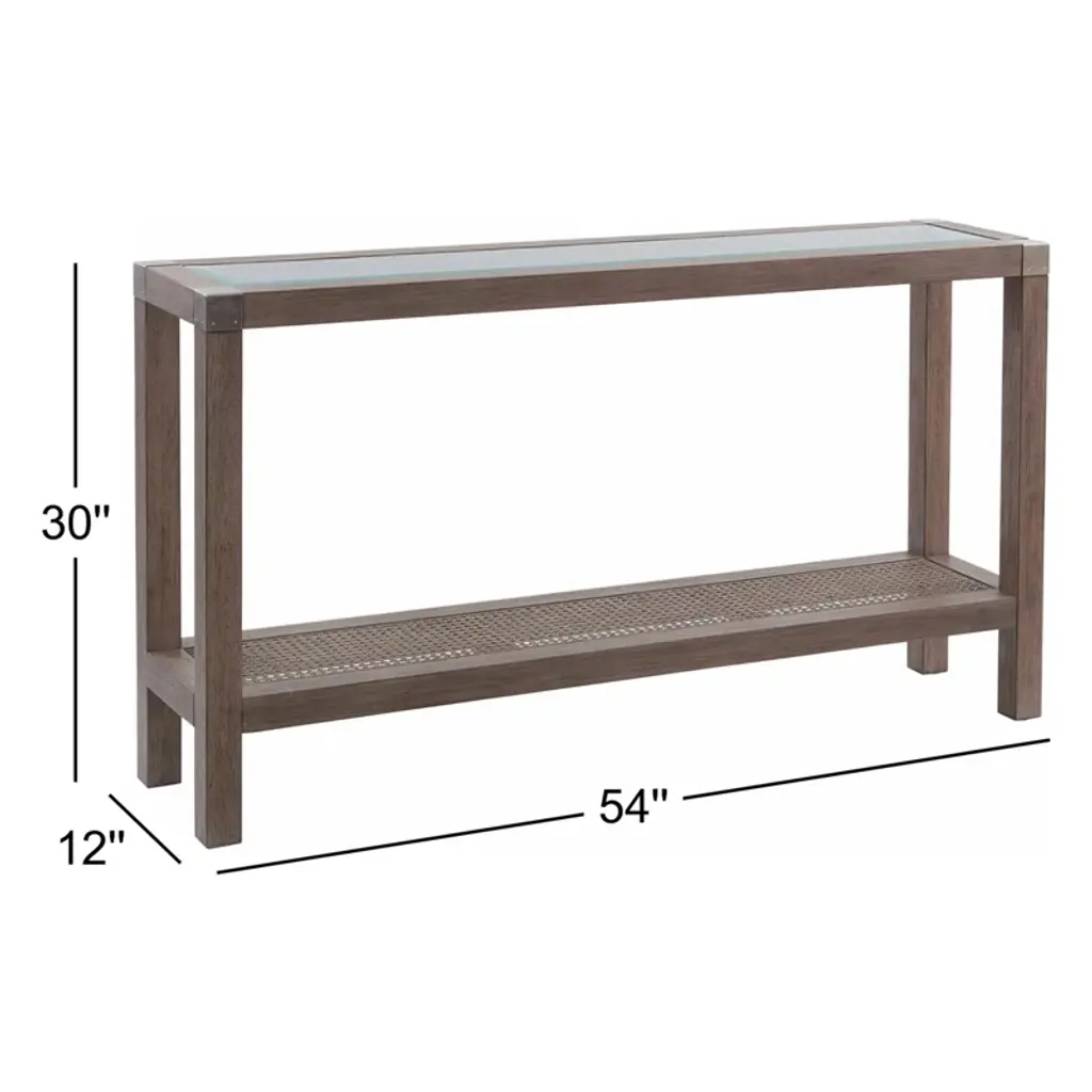 Introducing the Bushwick table, inspired by coastal farmhouse aesthetics. Crafted from solid wirebrushed rubberwood, it features clear tempered glass inset tops and charming cane inserts in the base. The neutral driftwood finish, complemented by brushed nickel corner cap detailing, brings tranquility to your space.