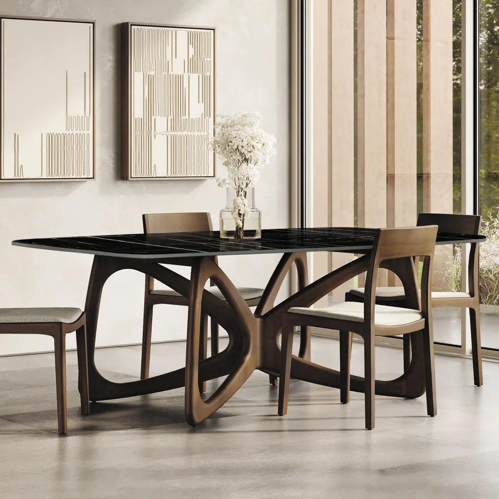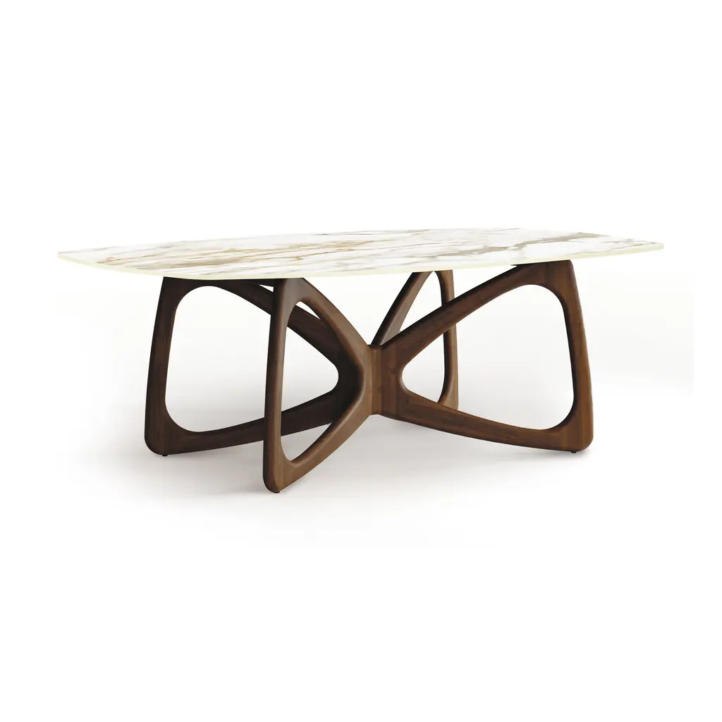 Welcome the beauty of nature into your living space with the Butterfly Sintered Stone Boat Shaped Table From Copeland Furniture. The boat shaped table blends modern aesthetics with natural inspiration for a striking addition to any room. Crafted in solid American black walnut hardwood or solid Oak, it's perfect for everyday use and will elevate any gathering with its eye-catching nature-inspired design. Highlights