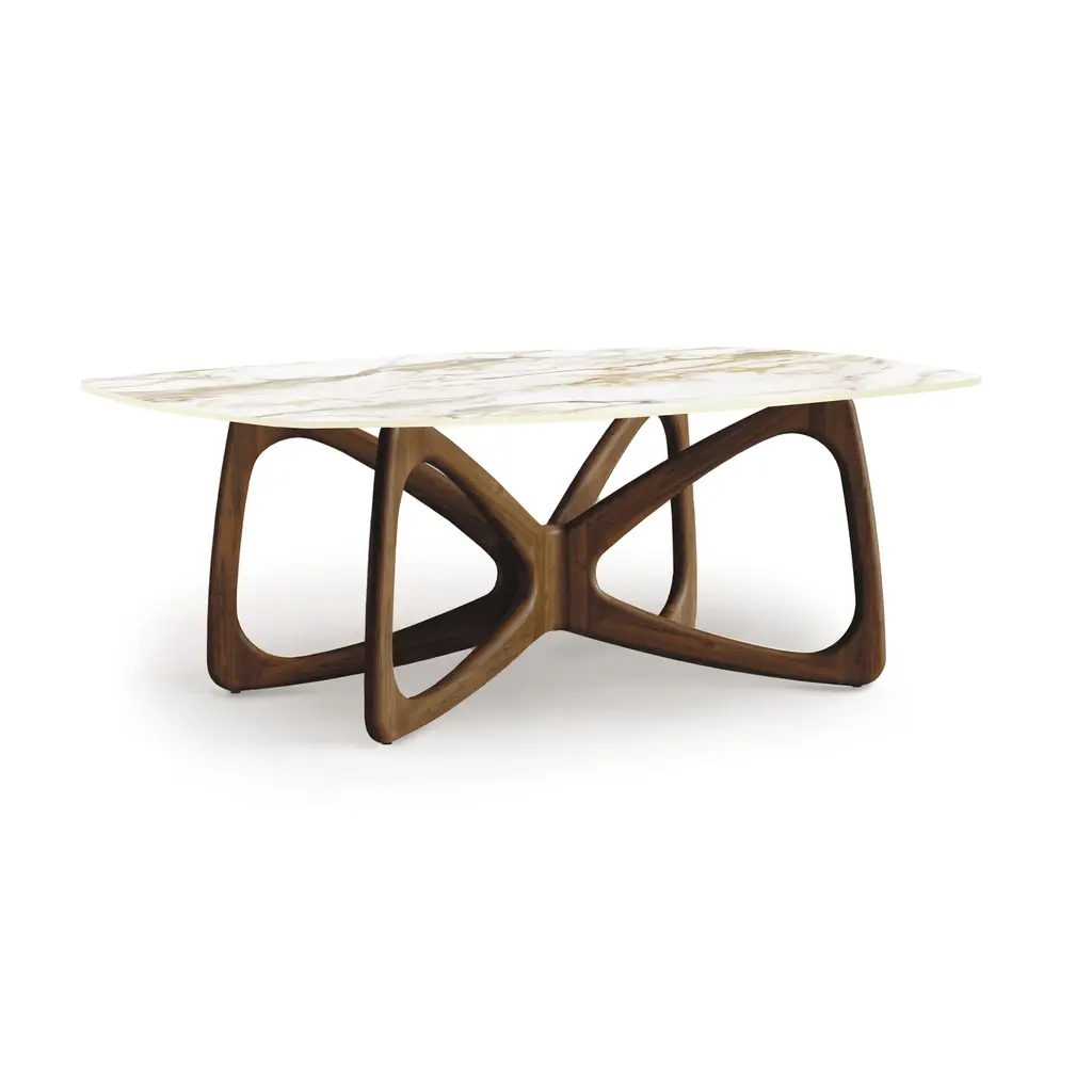 Welcome the beauty of nature into your living space with the Butterfly Sintered Stone Boat Shaped Table From Copeland Furniture. The boat shaped table blends modern aesthetics with natural inspiration for a striking addition to any room. Crafted in solid American black walnut hardwood or solid Oak, it's perfect for everyday use and will elevate any gathering with its eye-catching nature-inspired design. Highlights