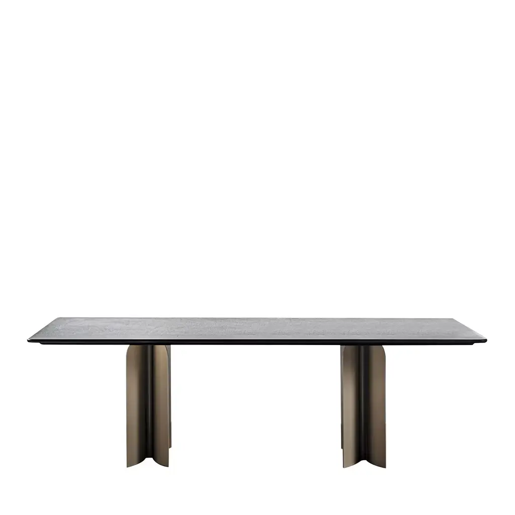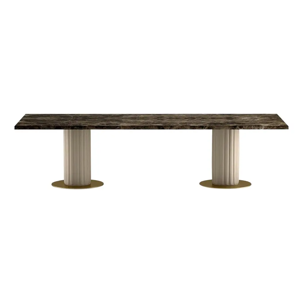 A large Emperador marble rectangular piece sits atop two large pillar-shaped supports in solid linden wood covered in grosgrain leather that gives this massive table a sculptural regality. The surface, with its warm earthy tones, recurs in the burnished brass discs under the two feet. This exquisite and versatile piece of functional decor can also be used as an elegant conference table in an executive office.