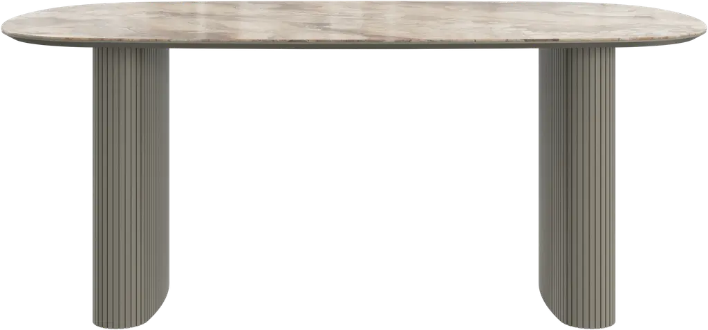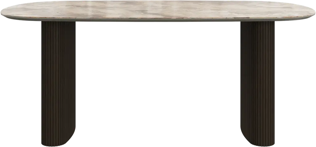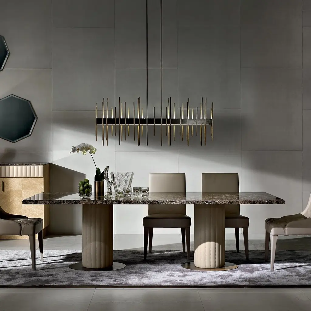 A large Emperador marble rectangular piece sits atop two large pillar-shaped supports in solid linden wood covered in grosgrain leather that gives this massive table a sculptural regality. The surface, with its warm earthy tones, recurs in the burnished brass discs under the two feet. This exquisite and versatile piece of functional decor can also be used as an elegant conference table in an executive office.