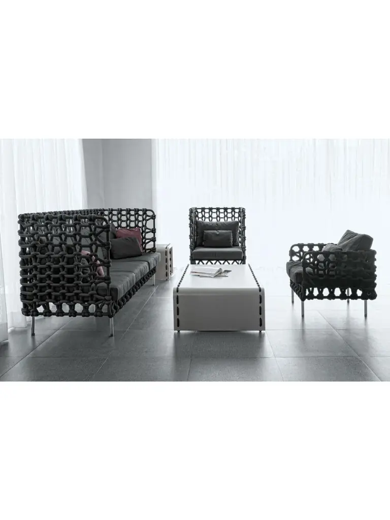 Cabaret coffee table by Kenneth Cobonpue.Materials: Fiberglass reinforced polymer, acrylic fabric, reticulated foam.Dimensions: 78cm x 136.5 cm x H 36.5cm. Cabaret wraps you in the warmth of its fabric layers like an oversized knit sweater. The innovative knotting and weaving technique used in the design lends sophistication to any room.Also available in other sizes and colors.Designer's BiographyKenneth Cobonpue is a multi-awarded furniture designer and manufacturer from Cebu, Philippines. His passage to design began in 1987, studying Industrial Design at the Pratt Institute in New York. While completing his studies, he apprenticed for a leather and wood workshop near Florence, Italy. He went on to study Furniture Marketing and Production at the Export-Akademie Baden-Württemberg in Reutlingen, Germany, under a private and state scholarship program, and subsequently worked in Bielefeld and Munich.Kenneth returned home to Cebu in 1996 to manage Interior Crafts of the Islands, Inc., a furniture design and manufacturing company founded by his mother Betty Cobonpue in 1972. Discovering that modern design could have a new face using natural fibers and materials, Kenneth created pieces of functional art, offering an alternative to the Western definition of modern design. Today, the Kennethcobonpue brand has become known globally for its unique designs and extensive roster of clientele, including Hollywood celebrities and members of royalty.With his masterful way of integrating nature, traditional craft and innovative technologies, designer and creative director Kenneth Cobonpue has earned international awards and recognition for his creative, organic, and expressive pieces. Working closely with some of the world’s leading designers, from household names to emerging talents, Kenneth has been pushing the envelope for design in the Philippines and sharing his vision to a global audience. Awards to his credit include five Japan Good Design Awards, the grand prize at Singapore International Design Competition, the Design for Asia Award of Hong Kong, the American Society of Interior Design Top Pick selection and the French Coup de Coeur award. Several of his designs were selected for several editions of the International Design Yearbook published in London and New York. Phaidon’s book entitled “& FORK” underscores Kenneth’s position as a leader of a new movement incorporating new technologies with crafts. In 2007, TIME magazine called him “rattan’s first virtuoso”. Kenneth was named the Designer of the Year in the first edition of Maison et Objet Asia held in March 2014 in Singapore.Kenneth reveals new work each year in the design shows from Milan to New York, and he speaks regularly about Southeast Asian design all over the world. He has also appeared in European television and in countless international magazines and newspapers around the world. Various Cobonpue designs have also appeared in full-length feature films and television, such as Oceans 13 and CSI.