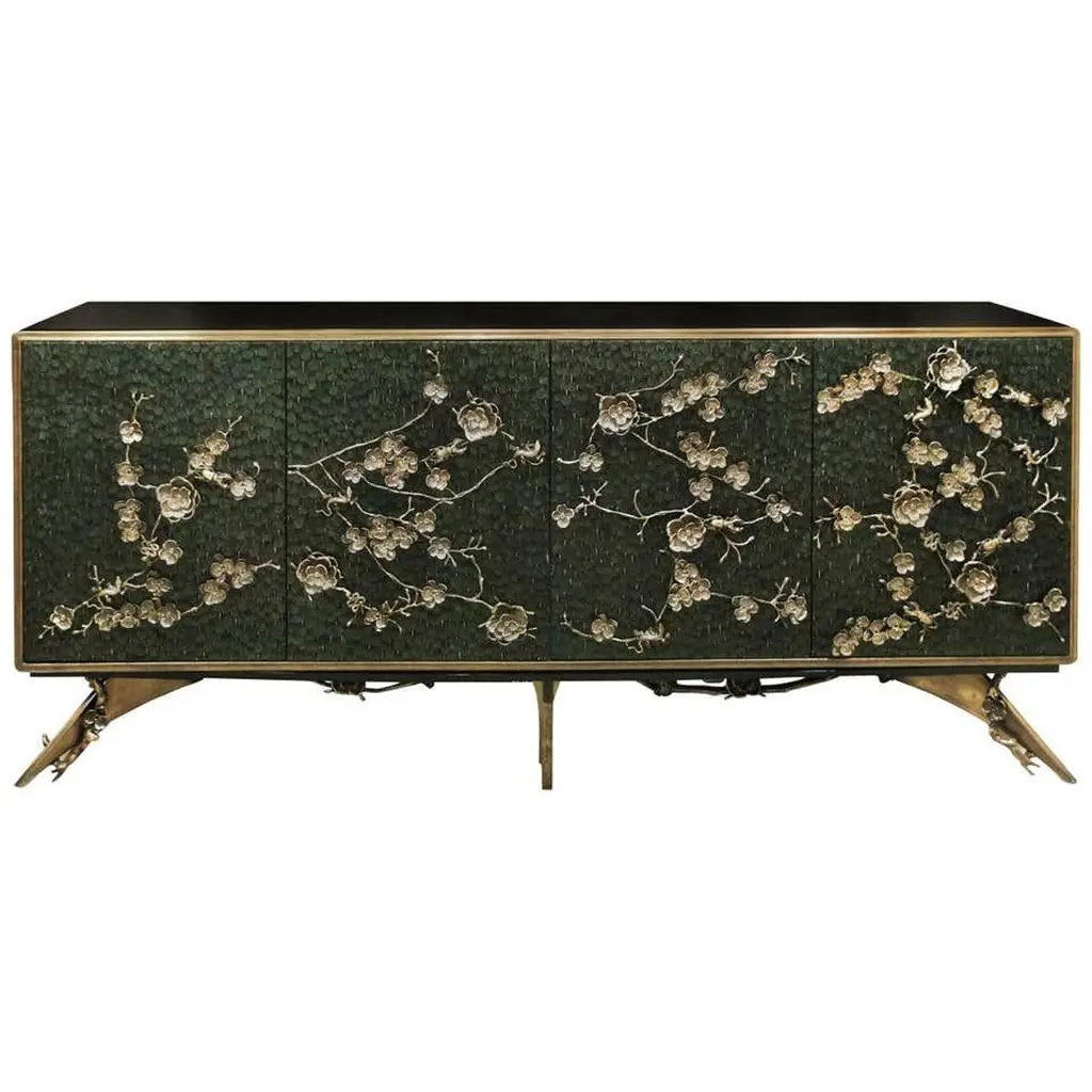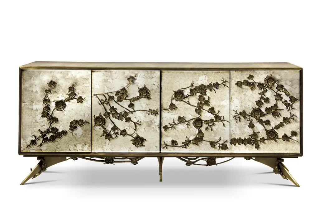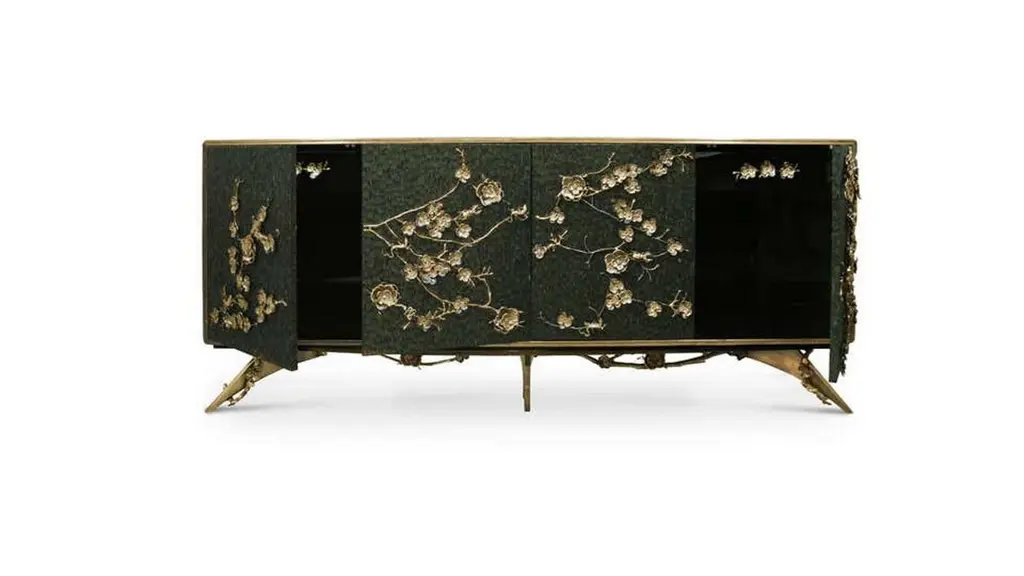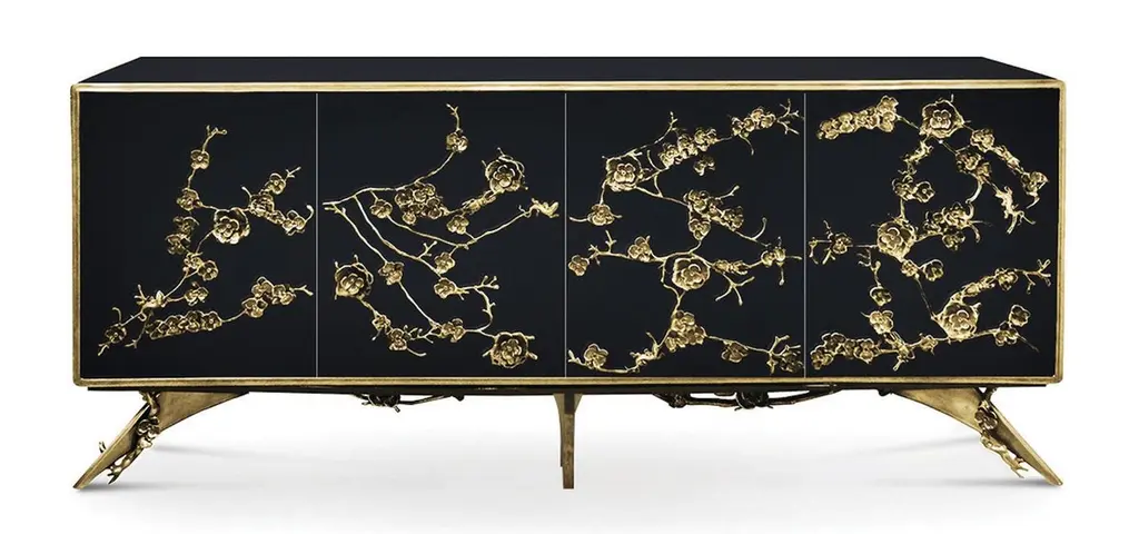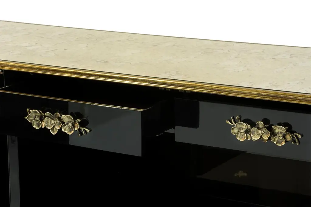 Cabinet and TV tableSmoked glass, brassMeasures: Height 33.86 in. (86 cm)Width 84.65 in. (215 cm)Depth 23.23 in. (59 cm)190 kg. There is a sense of reveal and conceal takes a beautiful chest in high gloss lacquer and adorns it in metal organic lace, revealing a mesmerizing hint of what lies beneath. Interior opens to four drawers embellished with organic hardware with a finish to match the exterior.As ShownStructure: Black Lacquer (High Gloss Finish).Structure Sides: Black Lacquer (High Gloss Finish).Door Front: Black Lacquer (High Gloss Finish).Door Interior: Black Lacquer (High Gloss Finish).Base: Aged Brass (High Gloss Finish).Handle: Aged Brass (High Gloss Finish).Frame: Aged Gold Leaf (High Gloss Finish).Interior: Black Lacquer (High Gloss Finish) and Smoked Glass.