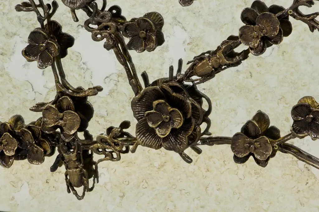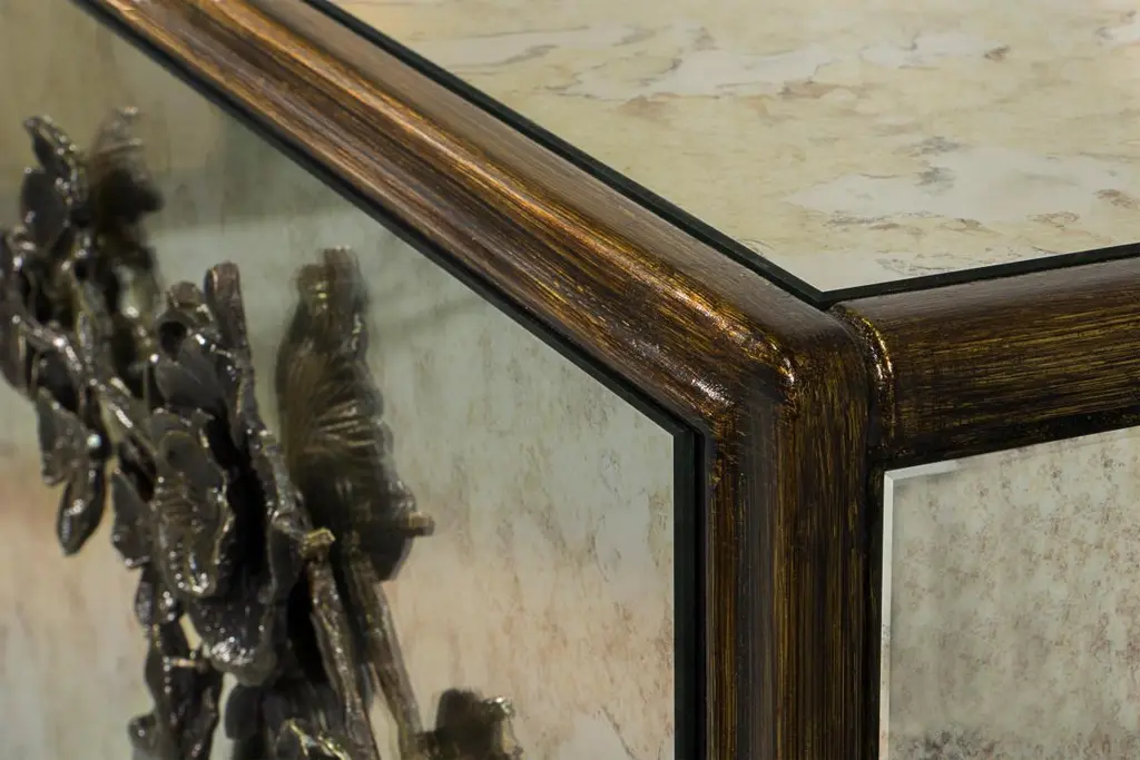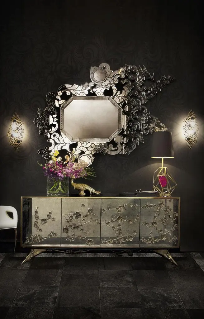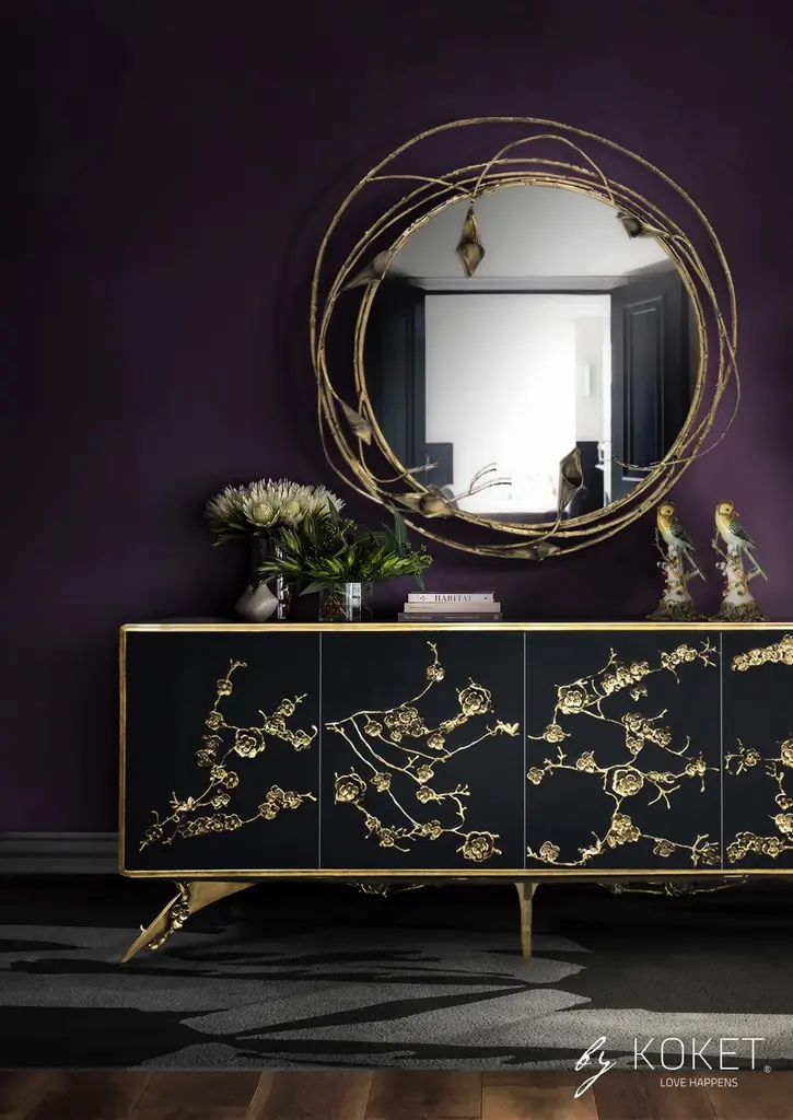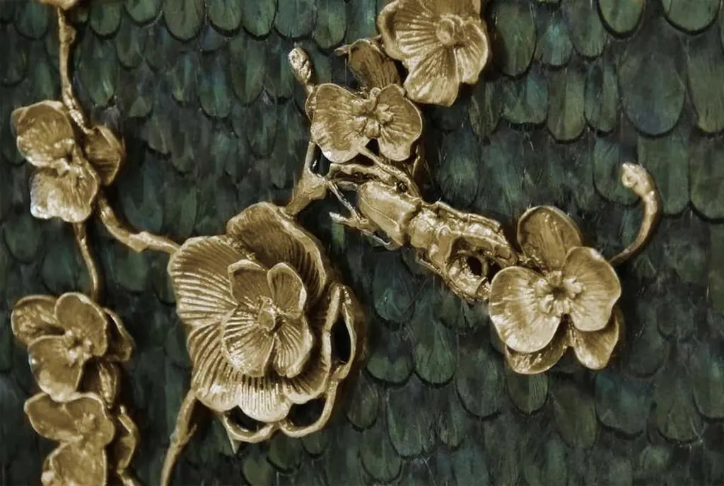 Cabinet and TV tableSmoked glass, brassMeasures: Height 33.86 in. (86 cm)Width 84.65 in. (215 cm)Depth 23.23 in. (59 cm)190 kg. There is a sense of reveal and conceal takes a beautiful chest in high gloss lacquer and adorns it in metal organic lace, revealing a mesmerizing hint of what lies beneath. Interior opens to four drawers embellished with organic hardware with a finish to match the exterior.As ShownStructure: Black Lacquer (High Gloss Finish).Structure Sides: Black Lacquer (High Gloss Finish).Door Front: Black Lacquer (High Gloss Finish).Door Interior: Black Lacquer (High Gloss Finish).Base: Aged Brass (High Gloss Finish).Handle: Aged Brass (High Gloss Finish).Frame: Aged Gold Leaf (High Gloss Finish).Interior: Black Lacquer (High Gloss Finish) and Smoked Glass.