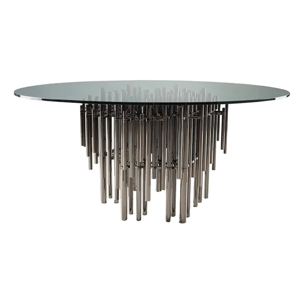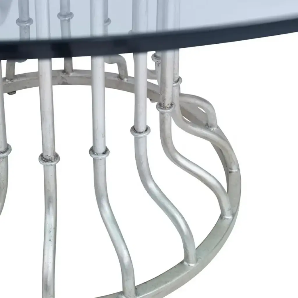 This metal flared table base is reminiscent of Parisian tables of the early 1900’s. The antiqued silver leaf base supports a 5/8" thick clear glass top.