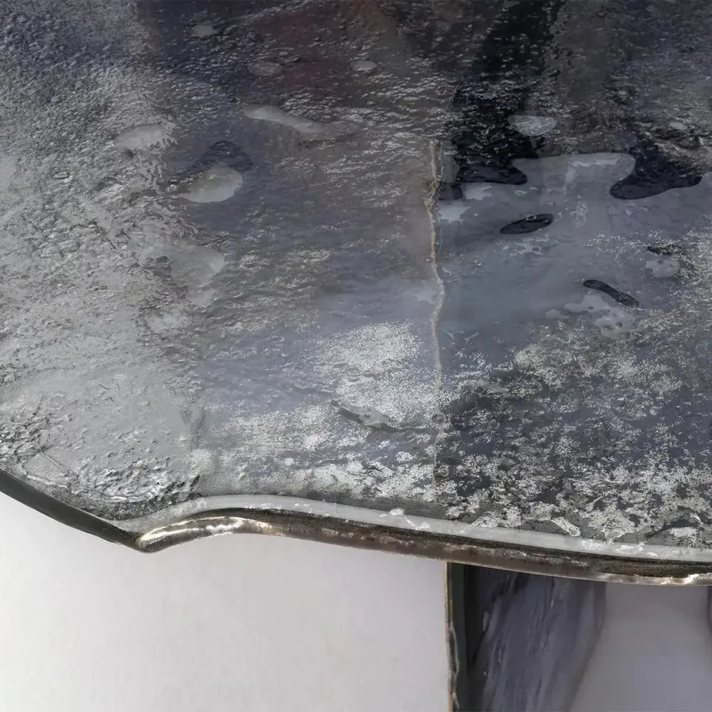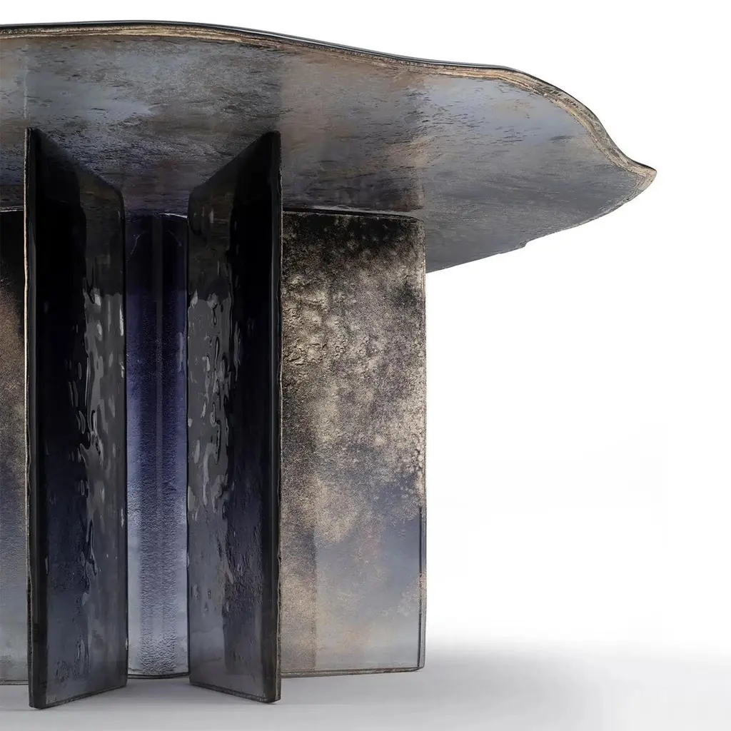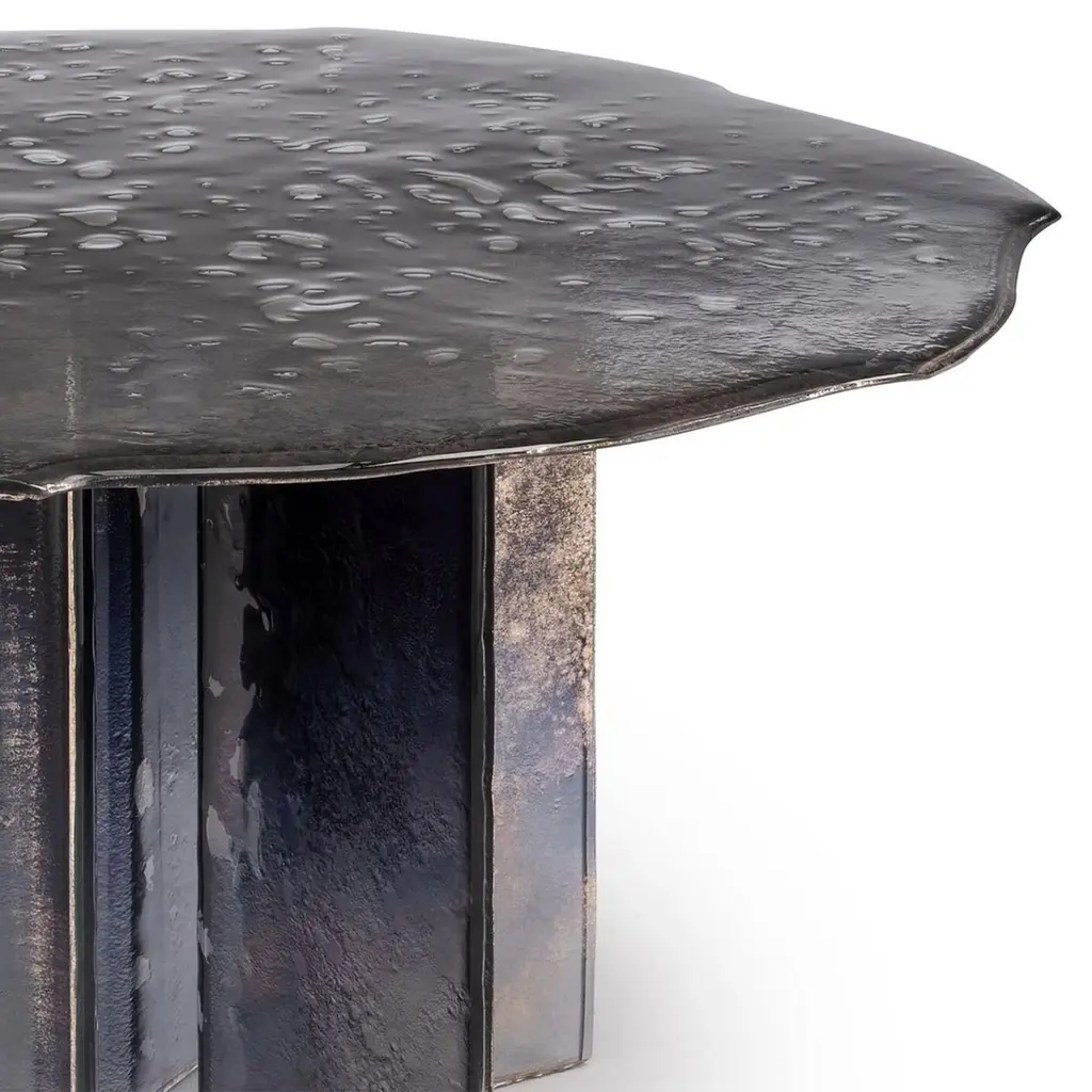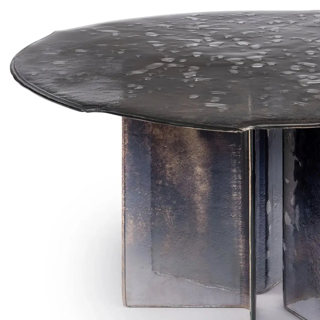 Table Cagilari Round all in baked glass in 2 layers. Table top with irregular edges. All glass parts are varnished with a gradient from deep blue to transparent with back partially silvered.