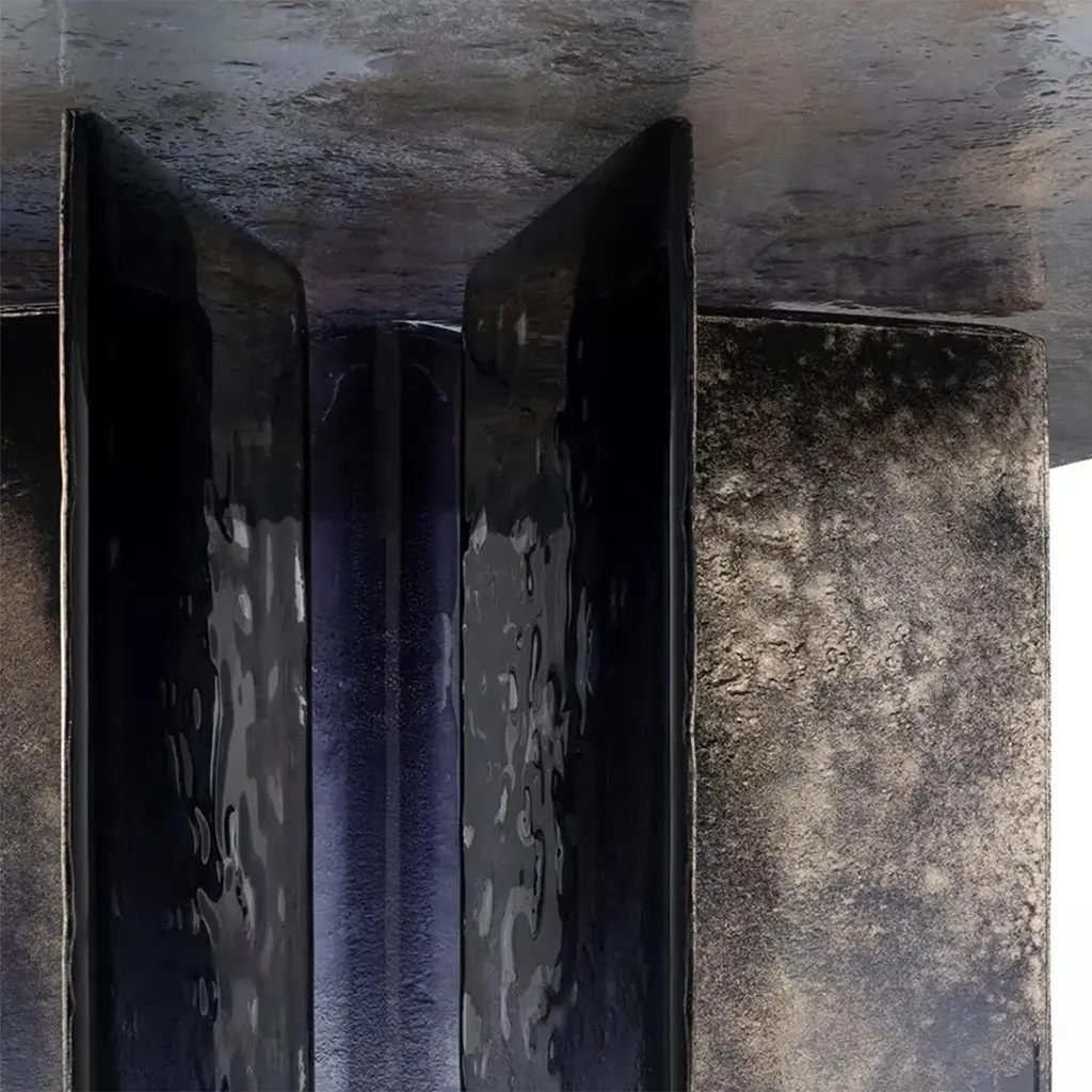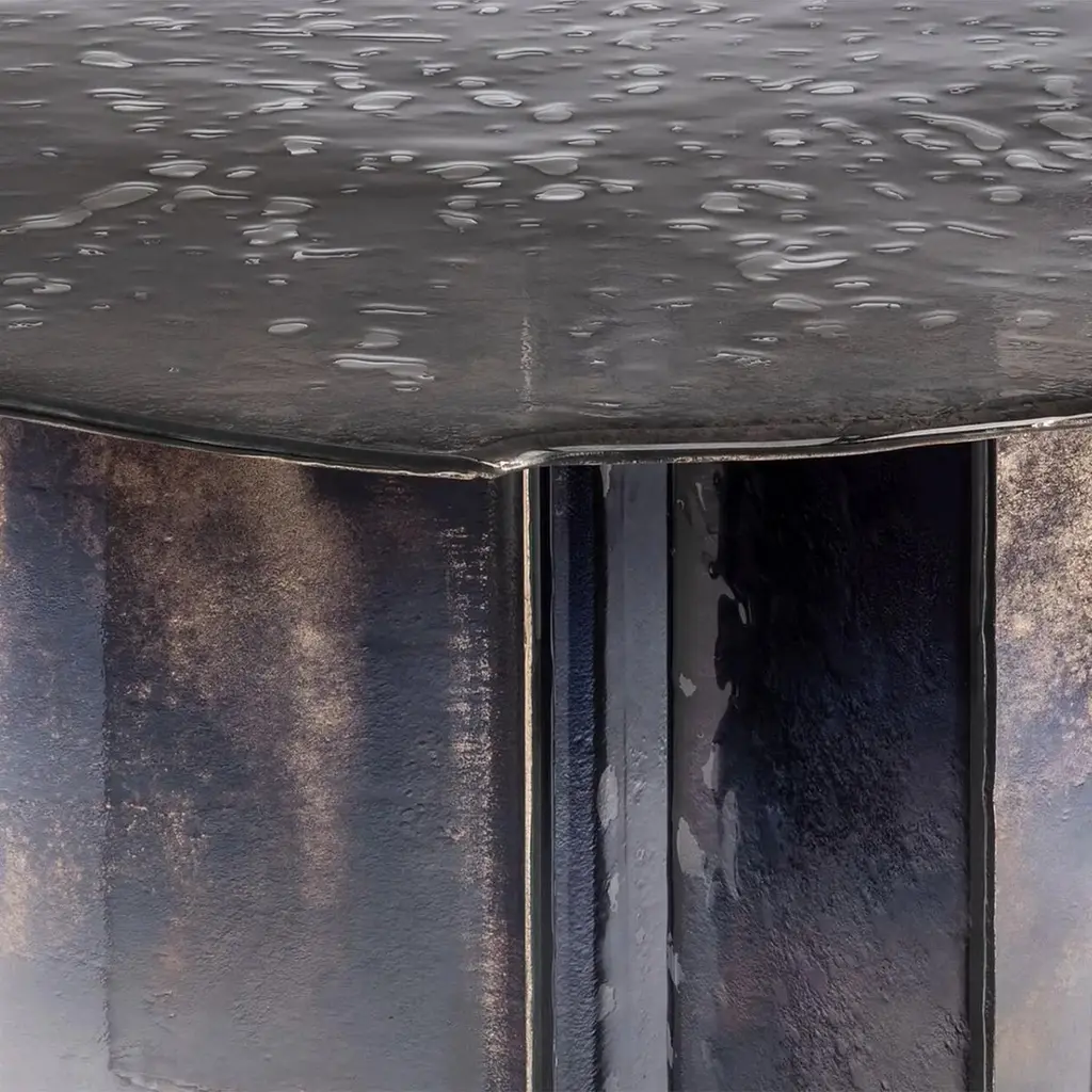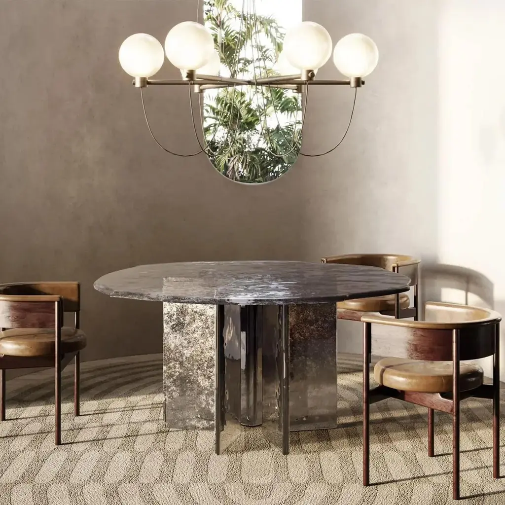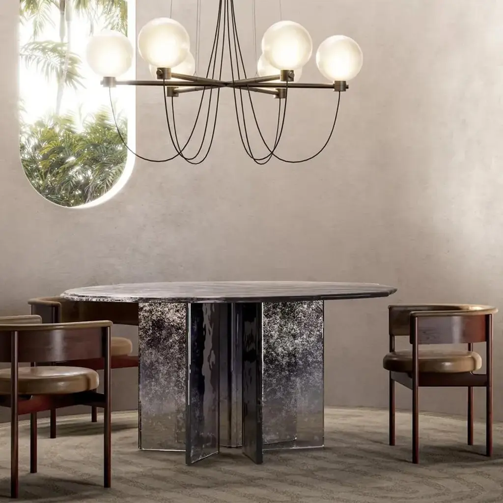 Table Cagilari Round all in baked glass in 2 layers. Table top with irregular edges. All glass parts are varnished with a gradient from deep blue to transparent with back partially silvered.