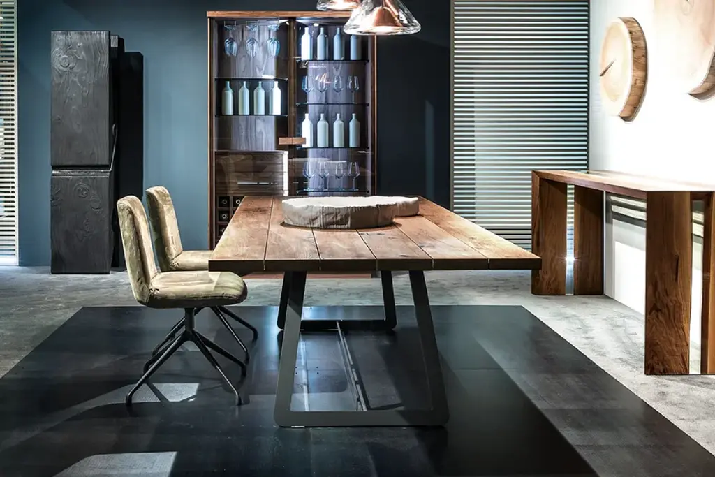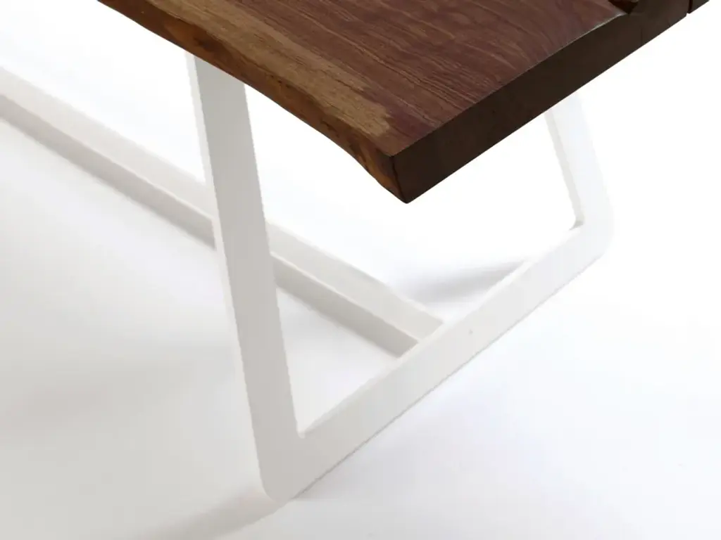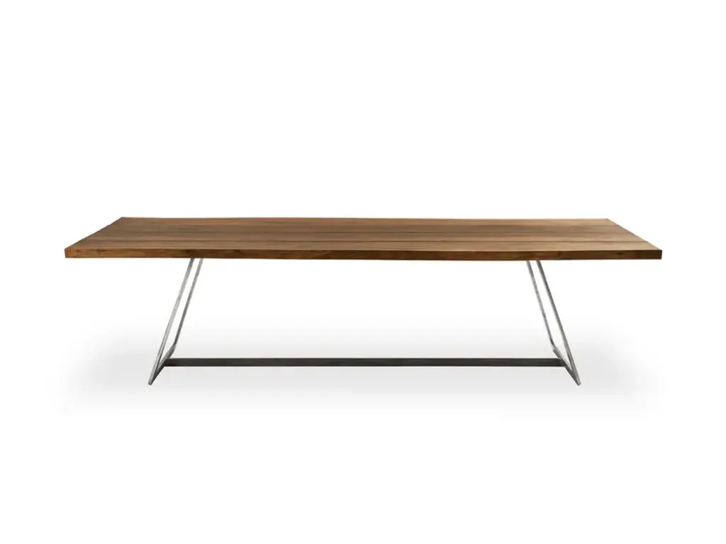 Calle Cut Natural Sides is a table with top in solid wood planks, not glued, with natural sides combined with an iron base, light colour, consisting of two U-shaped legs and a central bar.AVAILABLE FINISHES - TOPA1: walnut with knotsA2: oak with knotsA4: oak with knots pigmented: milk white, total blackAVAILABLE FINISHES - BASEB2: lacquered iron: irondust, RAL (selected colours only)B3: matt brushed lacquered iron: antique bronze, steel, titanium