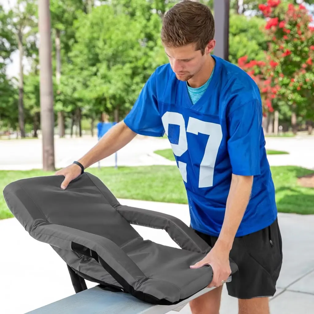 Camco 16” X 20” Portable Reclining Stadium Seat, Foldable Polyester Cushioned Chair With Steel Frame, Back Support, Armrests, And Storage, Grey