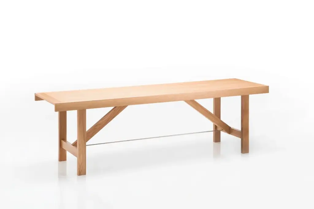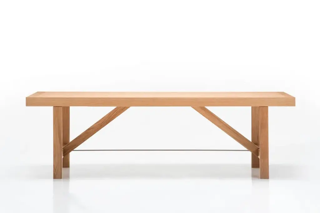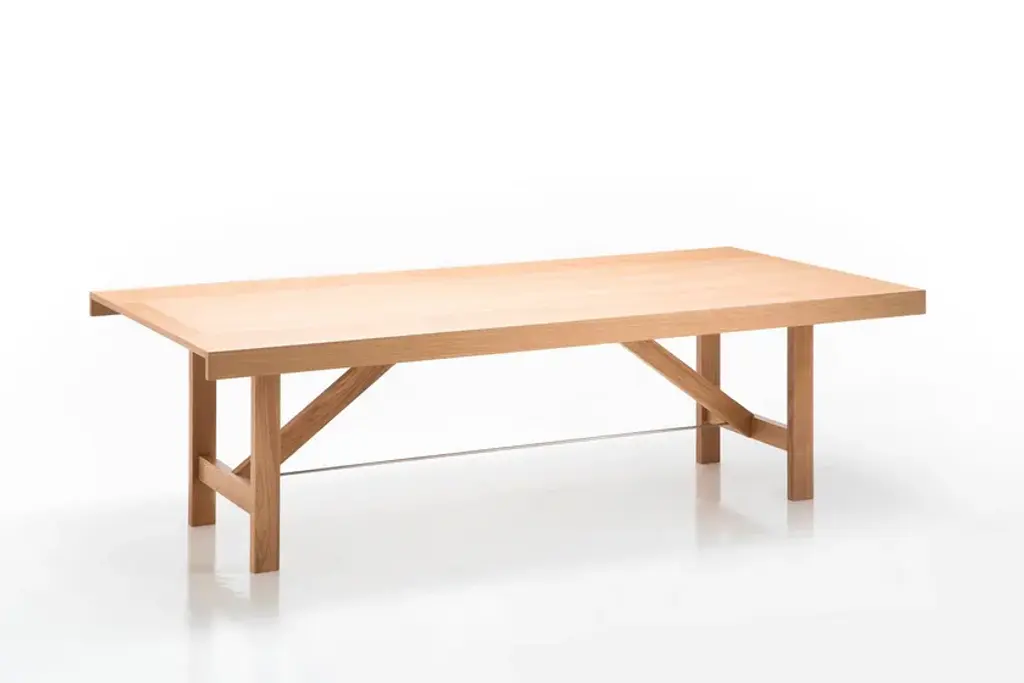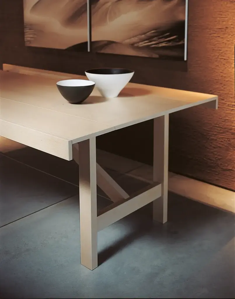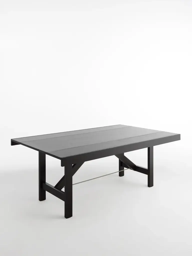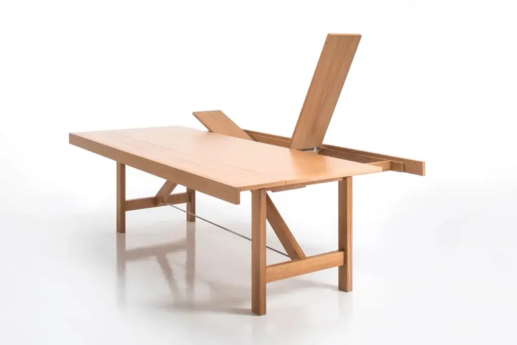 Capriata is a table featuring an unusually narrow and long top. Such proportions, beyond being very practical in certain furniture combinations, allow full visibility of the perfect dimensions of the supporting structure, reminiscent of wood roof trusses. The design is completed with an extensible solution, because instead of stretching, Capriata elongates on both long sides by removing the holding frame and unfolding the extensions contained therein. At its maximum extension, this feature almost doubles the surface area.Table that can be extended width-wise with two double-leaf opening extensions. Top and extensions made from particleboard panels, veneered and stained or melamine-coated and lacquered, 23 mm thick. Inclined supports, trestle and strut made from natural beech, either stained or lacquered. The table is assembled using beech pins and vinyl adhesive, free from formaldehyde and heavy metals. Stainless steel rod. Felt pads for resting on the floor.FINISHWhitened beech, mocha beech, white lacqueredDIMENSIONS (LxDxH)cm 200x69-95-121x77 - 63” x 35.5” x 28.4”cm 250x69-95-121x77 - 53.2” x 53.2” x 28.4”