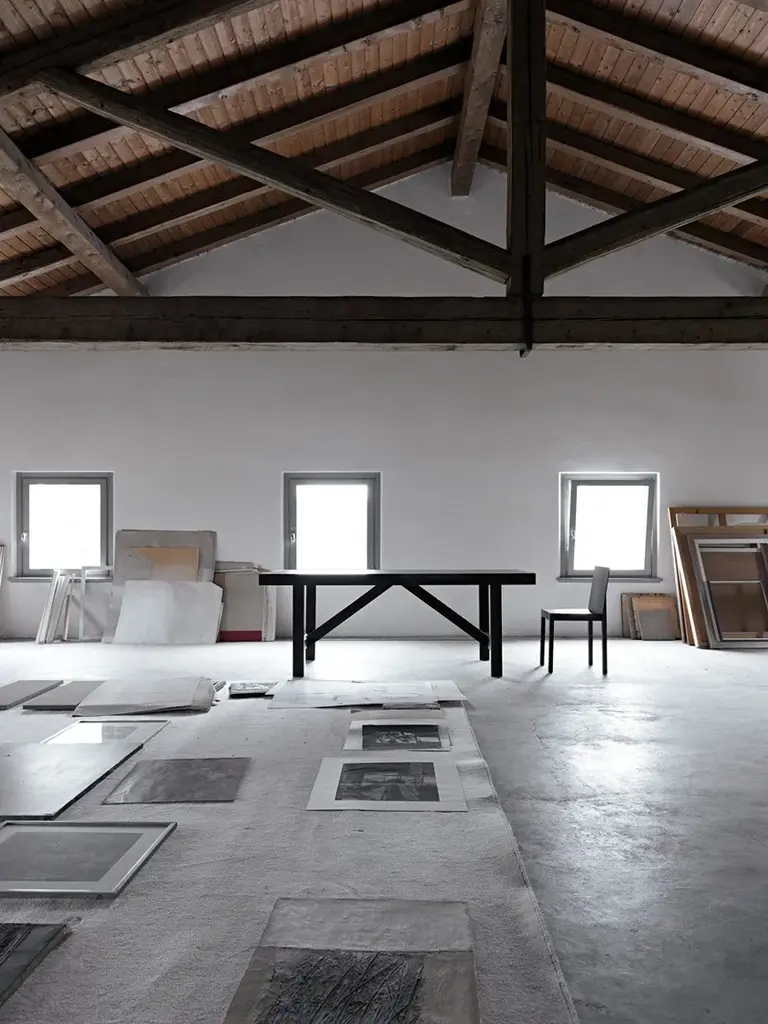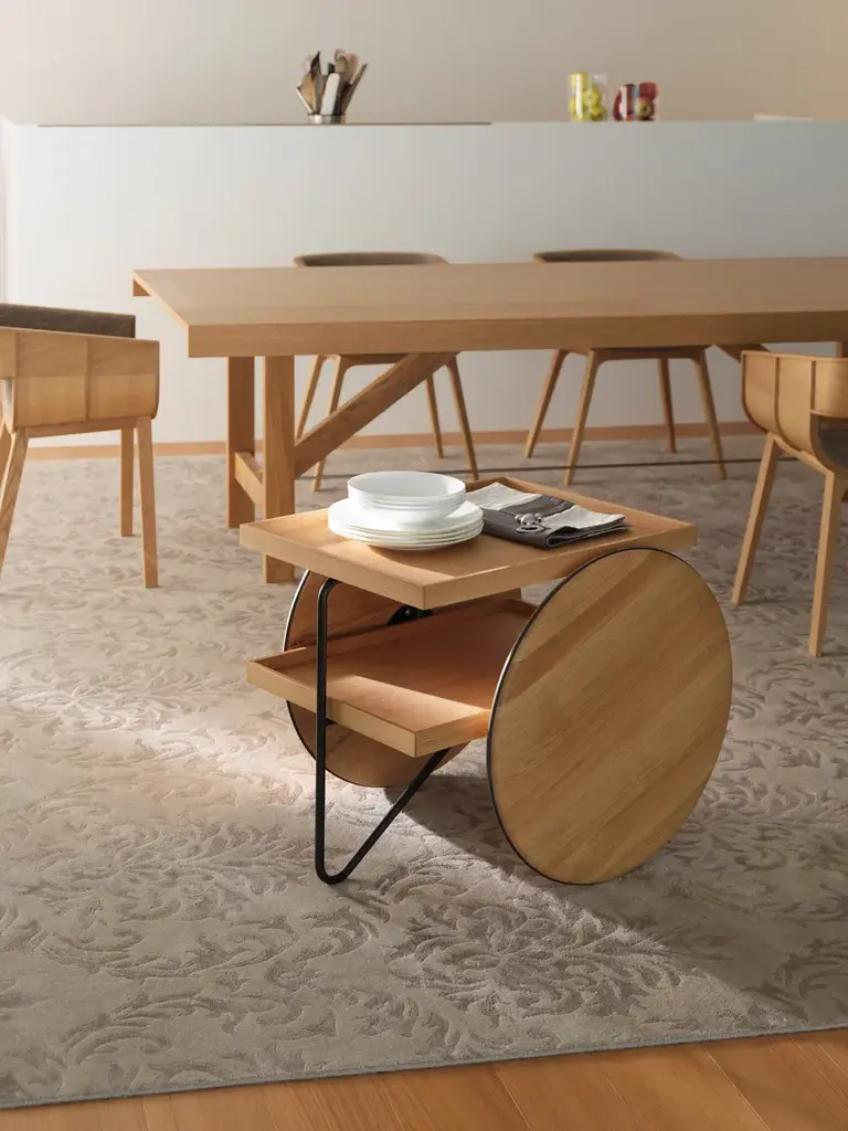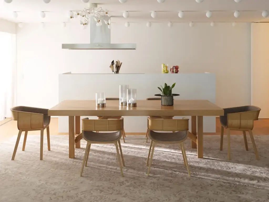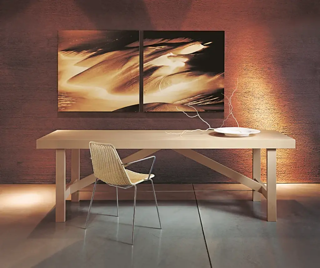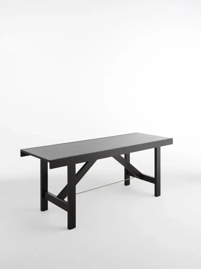 Capriata is a table featuring an unusually narrow and long top. Such proportions, beyond being very practical in certain furniture combinations, allow full visibility of the perfect dimensions of the supporting structure, reminiscent of wood roof trusses. The design is completed with an extensible solution, because instead of stretching, Capriata elongates on both long sides by removing the holding frame and unfolding the extensions contained therein. At its maximum extension, this feature almost doubles the surface area.Table that can be extended width-wise with two double-leaf opening extensions. Top and extensions made from particleboard panels, veneered and stained or melamine-coated and lacquered, 23 mm thick. Inclined supports, trestle and strut made from natural beech, either stained or lacquered. The table is assembled using beech pins and vinyl adhesive, free from formaldehyde and heavy metals. Stainless steel rod. Felt pads for resting on the floor.FINISHWhitened beech, mocha beech, white lacqueredDIMENSIONS (LxDxH)cm 200x69-95-121x77 - 63” x 35.5” x 28.4”cm 250x69-95-121x77 - 53.2” x 53.2” x 28.4”