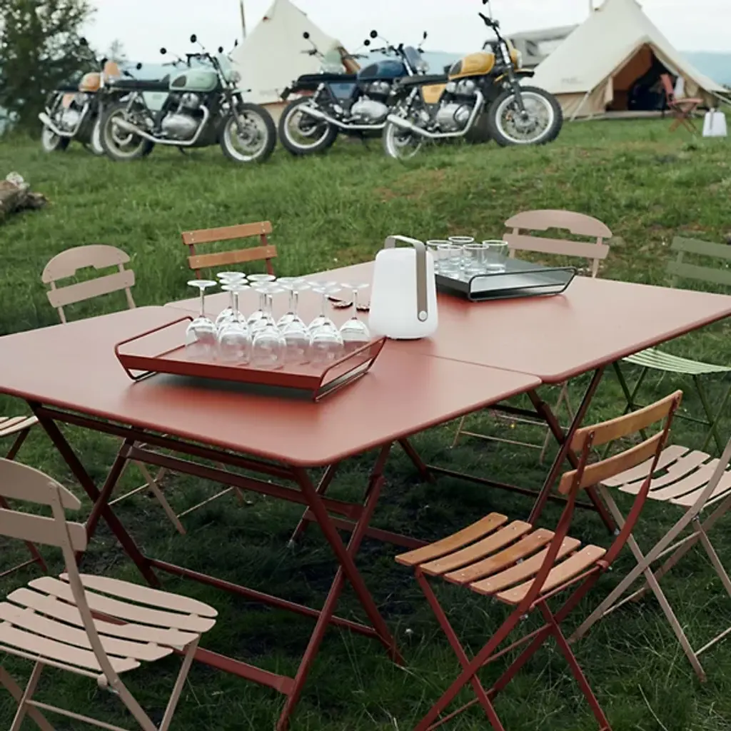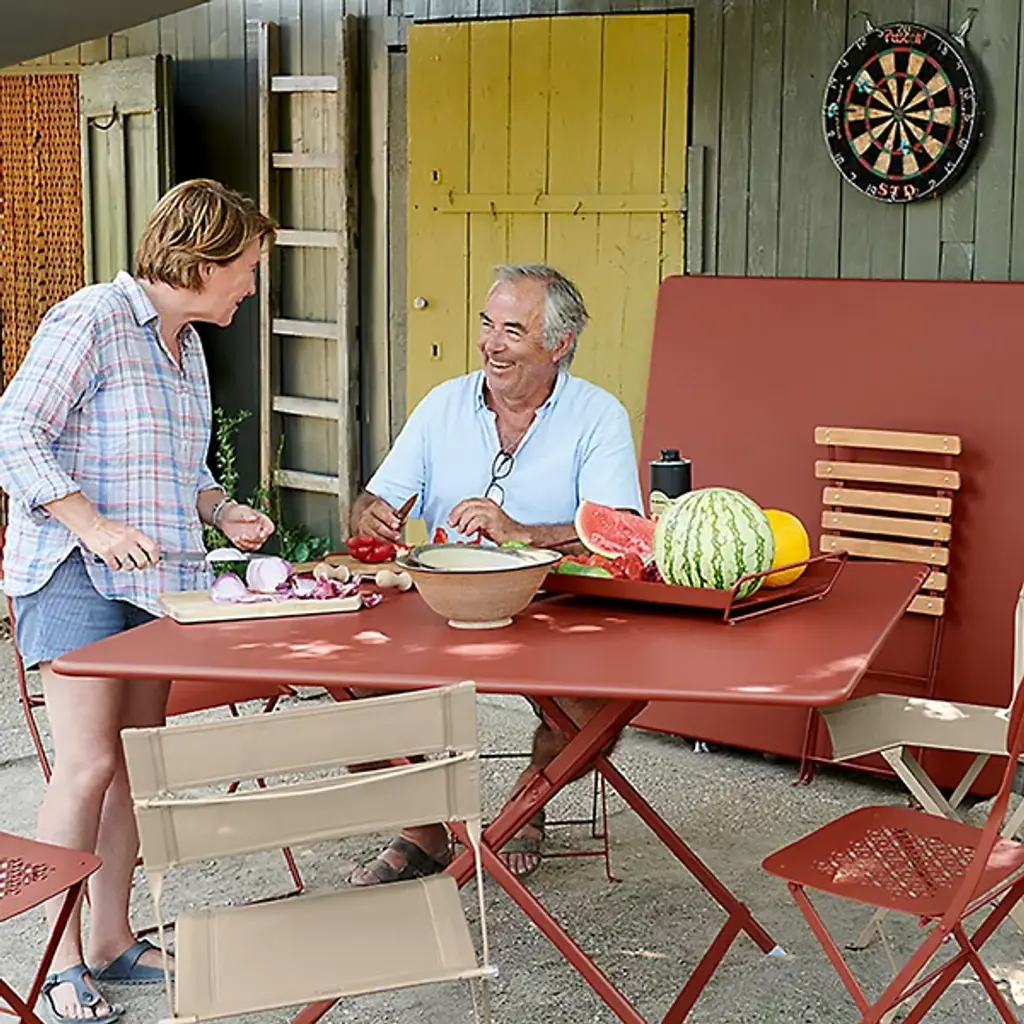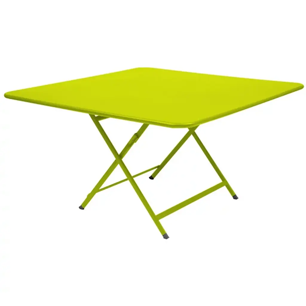Outdoor seating for 8, easily set up by 1. The Fermob Caractere Table has a generously sized square top (51 x 51 inches) and is made entirely out of steel. But it is actually quite lightweight and easy for 1 person to fold/unfold, transport and store. Add to any outdoor setting with one of more than 20 available powder coated finishes.