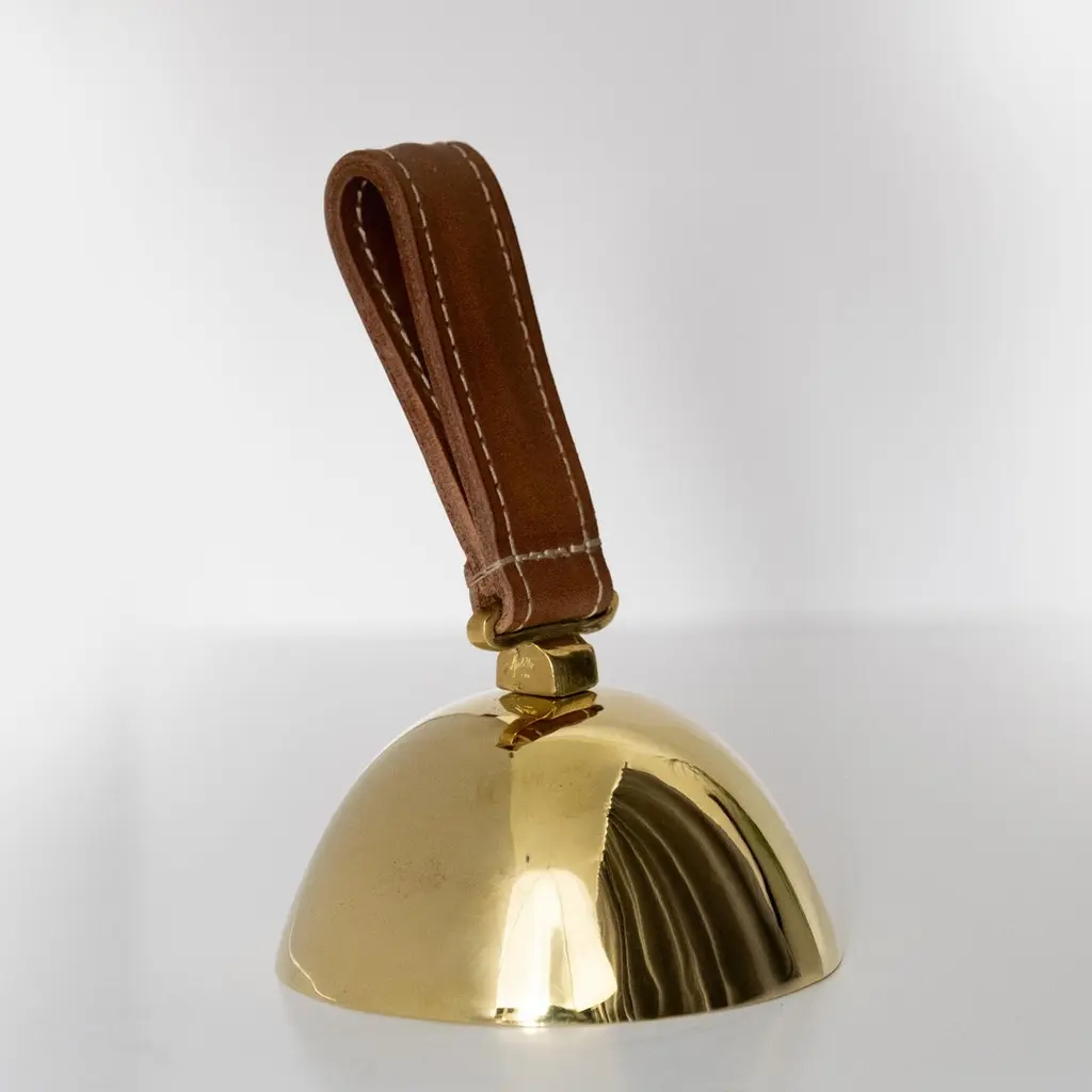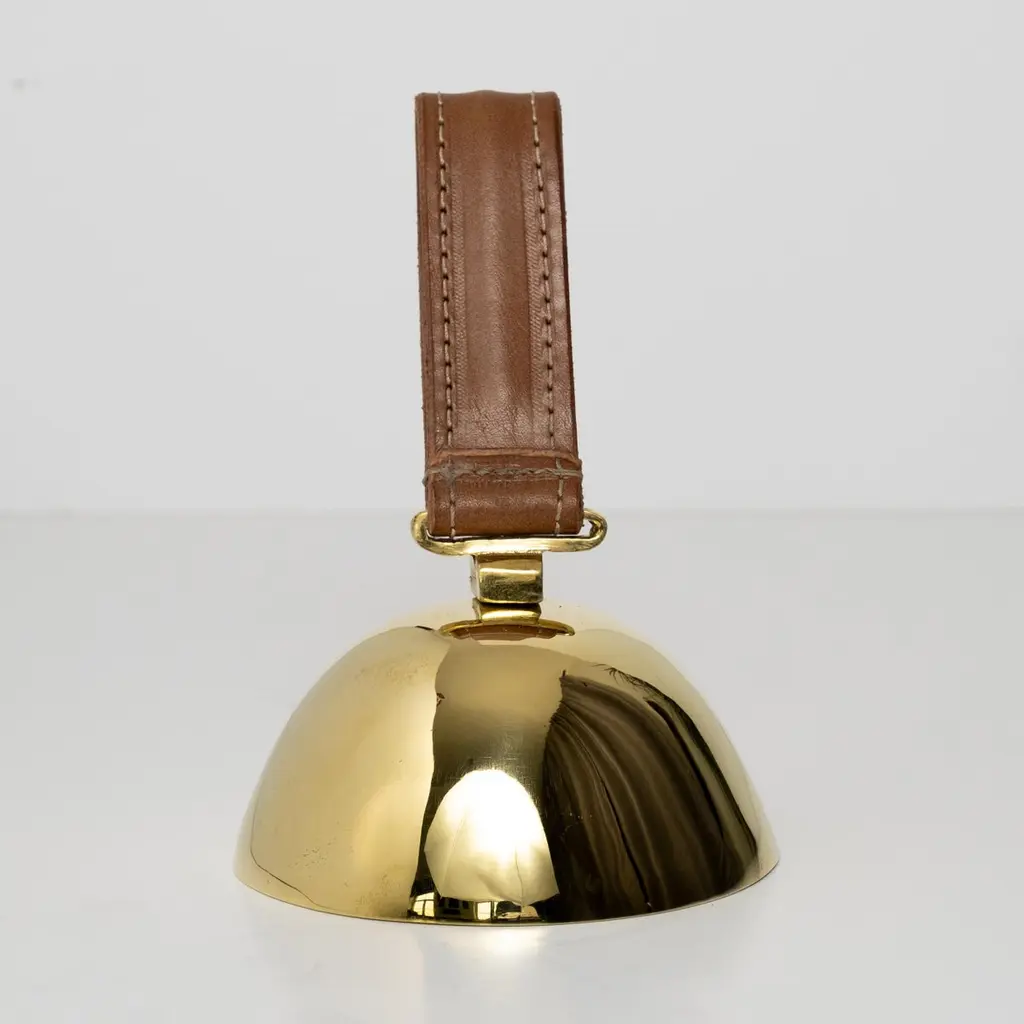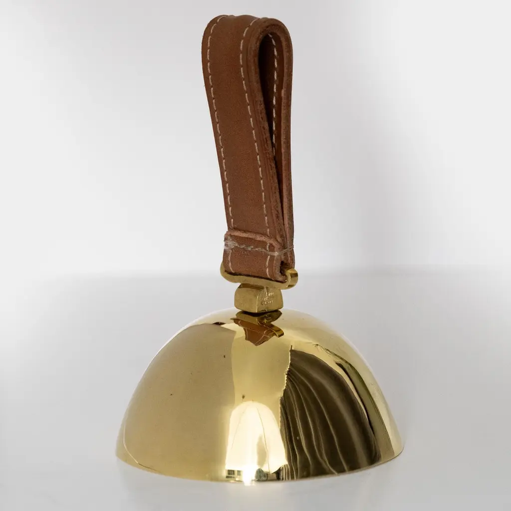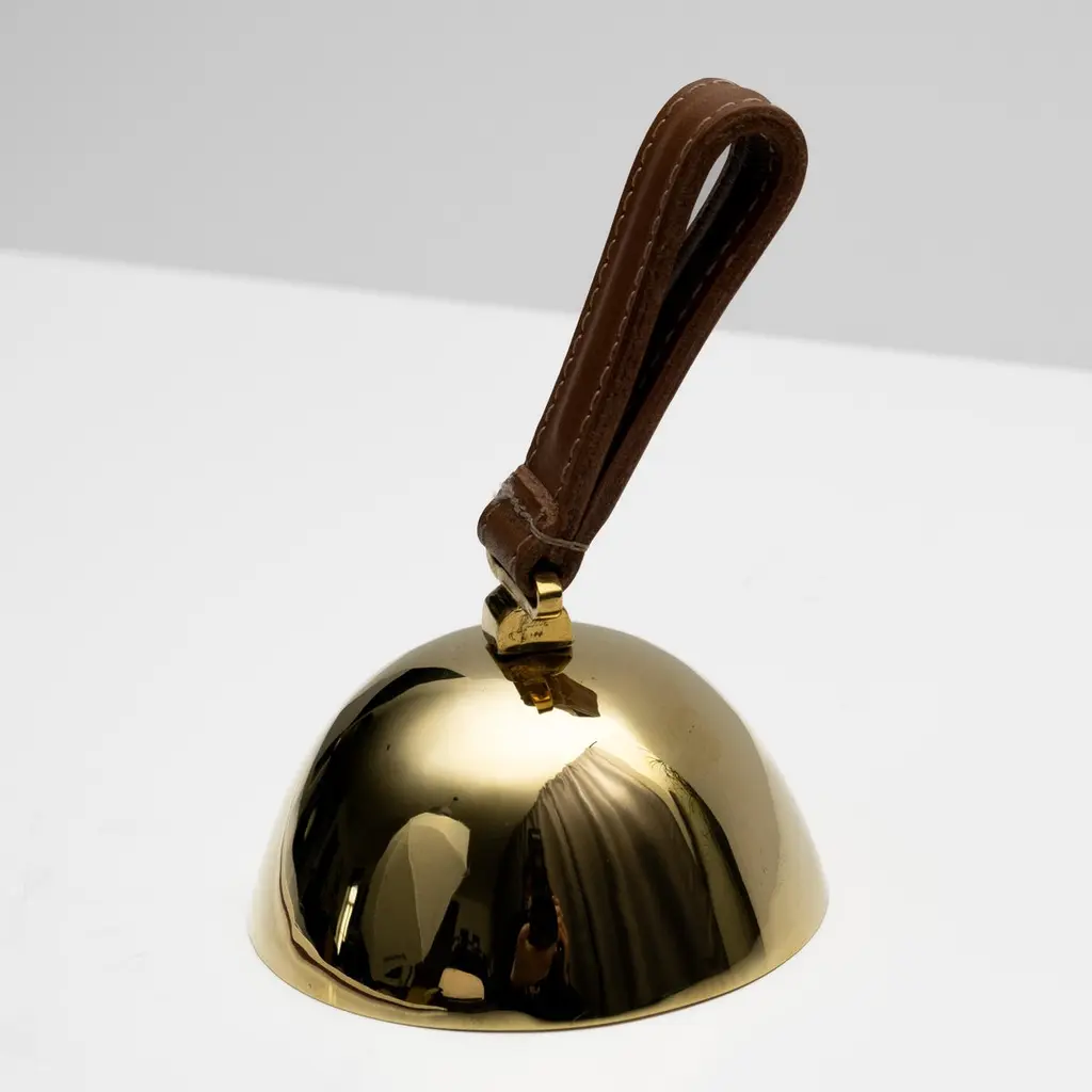 Carl Auböck Model #3310 Large Brass Bell with Leather HandleDesigned in the 1950s, this incredibly functional and sculptural bell is executed in polished brass with a rich brown leather handle. The #3610 is an homage to dinner or table bells of the 19th century.Price is per item. Available in unlimited quantities.Produced by Carl Auböck IV in the original Auböck Werkstätte in the 7th district of Vienna using the same exacting standards, high-quality materials, original molds, and techniques of his legendary grandfather. Auböck's design career was long and varied, reaching its pinnacle of prestige at the Triennale di Milano in 1954, where he received four gold medals in recognition of his iconic work.One in stock. Please note out of stock can take 2-4 weeks or more. Stock availability can change at any time. For time-sensitive orders, please inquire prior to purchasing.Finish varies from item to item due to the handmade nature of their fabrication. Brass is not lacquered and will develop a patina overtime unless re-polished.Made to order.