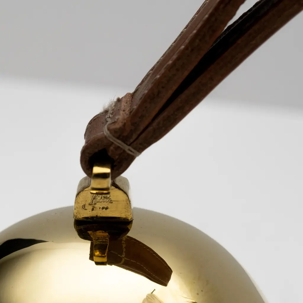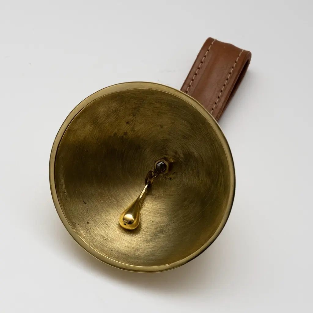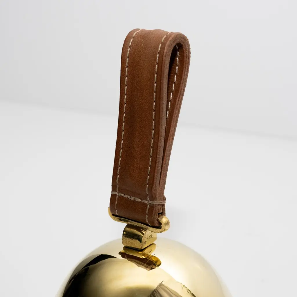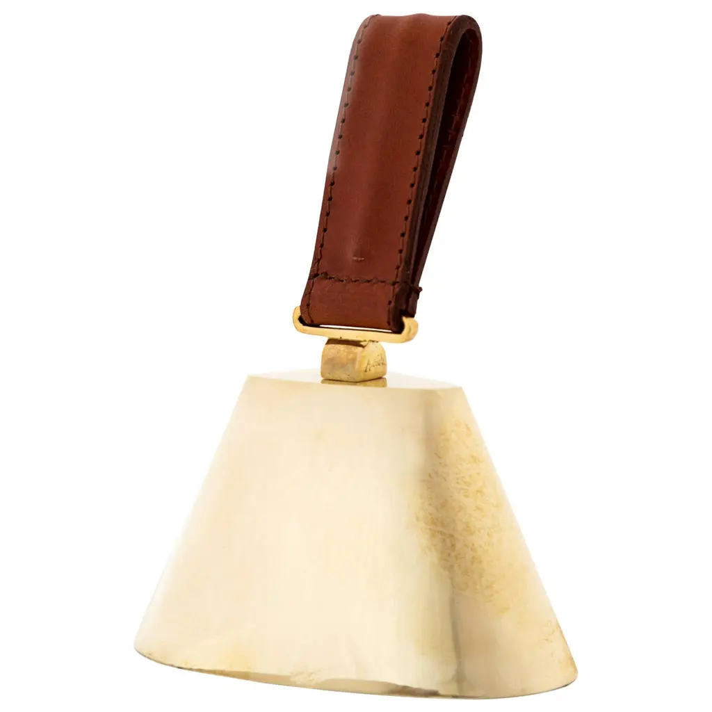 Carl Auböck Model #3310 Large Brass Bell with Leather HandleDesigned in the 1950s, this incredibly functional and sculptural bell is executed in polished brass with a rich brown leather handle. The #3610 is an homage to dinner or table bells of the 19th century.Price is per item. Available in unlimited quantities.Produced by Carl Auböck IV in the original Auböck Werkstätte in the 7th district of Vienna using the same exacting standards, high-quality materials, original molds, and techniques of his legendary grandfather. Auböck's design career was long and varied, reaching its pinnacle of prestige at the Triennale di Milano in 1954, where he received four gold medals in recognition of his iconic work.One in stock. Please note out of stock can take 2-4 weeks or more. Stock availability can change at any time. For time-sensitive orders, please inquire prior to purchasing.Finish varies from item to item due to the handmade nature of their fabrication. Brass is not lacquered and will develop a patina overtime unless re-polished.Made to order.