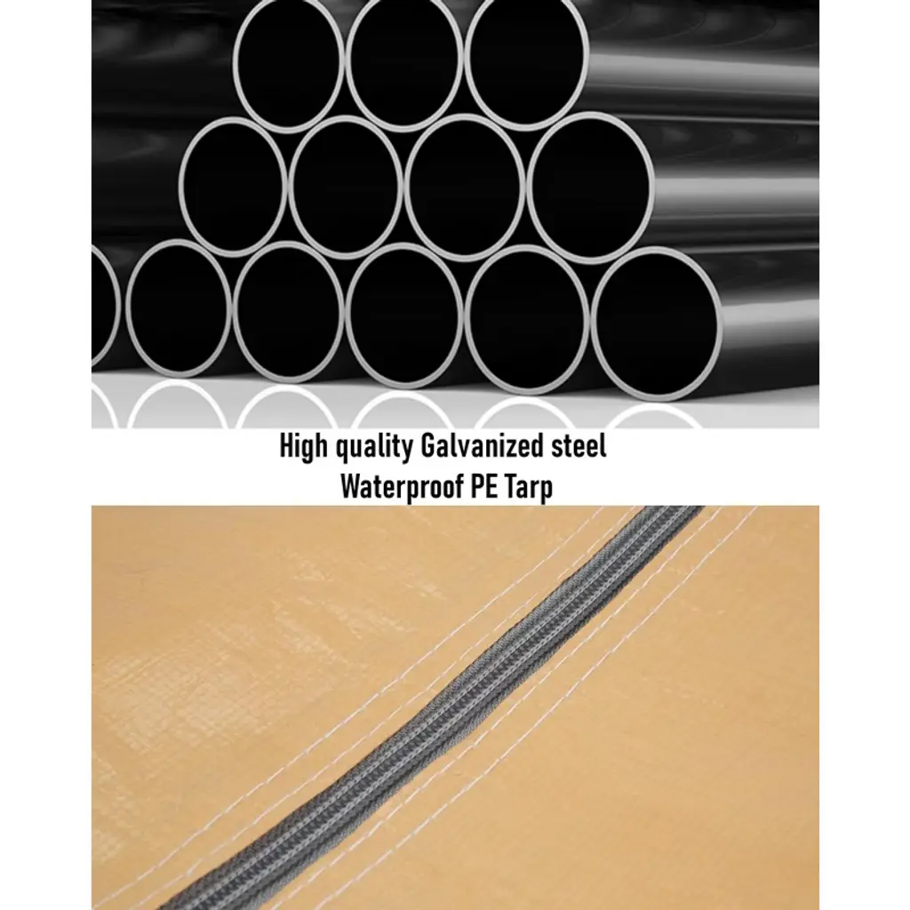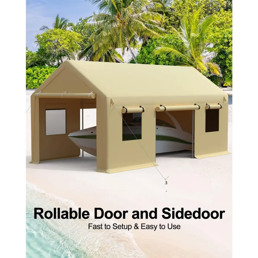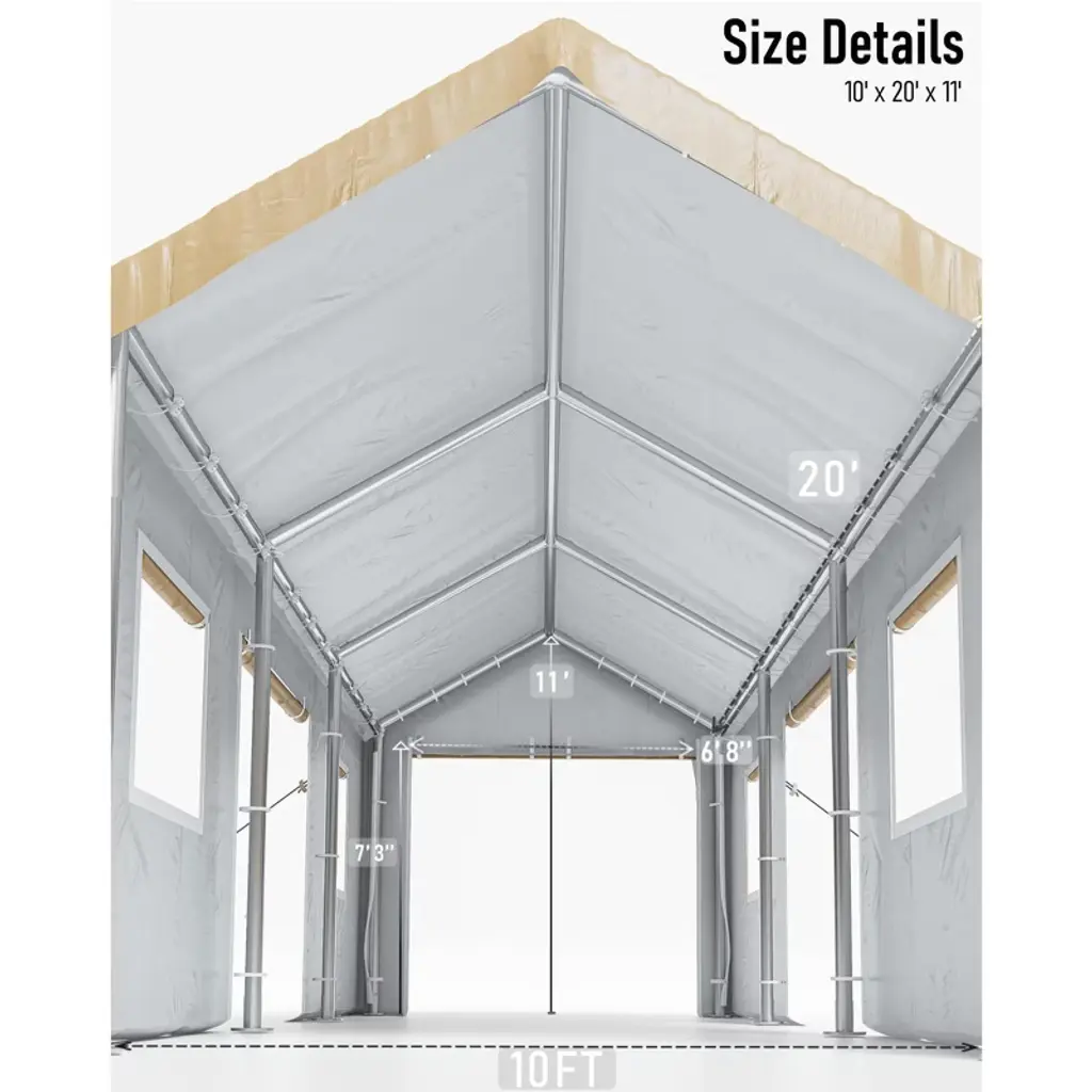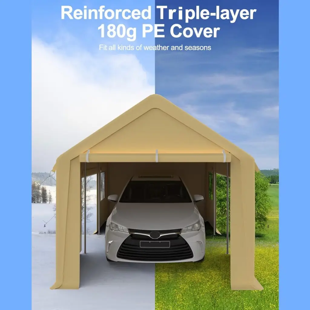 1.Superior All-Weather Protection Crafted with heavy-duty waterproof materials, this carport shields your vehicles and equipment from the harshest elements. Its robust galvanized steel frame resists rust and corrosion, ensuring long-term strength and stability. The durable PE top cover and sidewalls block UV rays to prevent paint fading, repel rain and snow to avoid water damage, and stand strong against wind¡ªkeeping your pickup, boat, or gear safe in sun, storm, or snow. 2.Spacious 10'x20' Design for Versatile Use With a generous 10'x20' footprint, this portable garage offers ample space to accommodate a range of items: park cars, motorcycles, or boats with room to spare, or use it as secure storage for lawn equipment, tools, or seasonal gear. The size ensures full coverage, protecting large belongings from outdoor exposure while leaving enough space for easy access and maneuvering. 3.Enhanced Ventilation & Accessibility Equipped with 4 roll-up doors and 4 mesh windows, this carport balances convenience and airflow. The roll-up doors (easy to open/close) provide quick access for vehicles or storage, while the mesh windows promote continuous air circulation¡ªreducing moisture buildup, preventing mold, and eliminating stale odors. This design keeps stored items dry, fresh, and well-ventilated year-round. 4.Quick, Hassle-Free Installation Designed for simplicity, this carport assembles and disassembles in minutes with 2-3 adults. No complex tools are needed¡ªclear structure and intuitive connections make setup straightforward. Its portability lets you relocate it easily, whether for temporary use at a campsite or long-term protection in your driveway, ensuring flexibility for changing needs. 5.Sturdy Construction for Durability Built with reinforced steel poles and heavy-duty covering materials, this carport is engineered to stay stable in adverse weather, including storms. For added security in high winds, we recommend securing it with heavy weights or sandbags¡ªenhancing stability to protect your valuables. This robust design ensures reliable performance, even with frequent use.