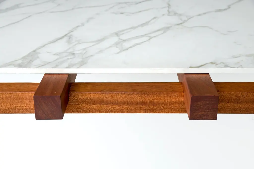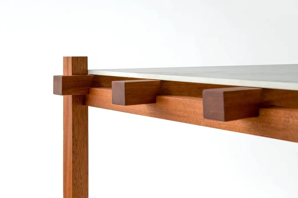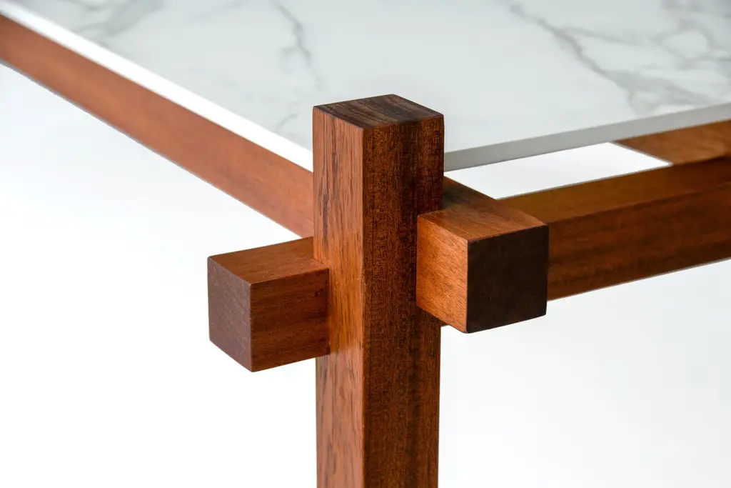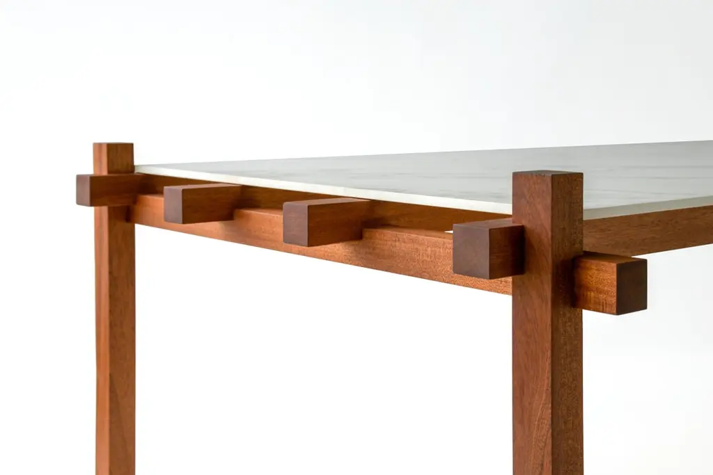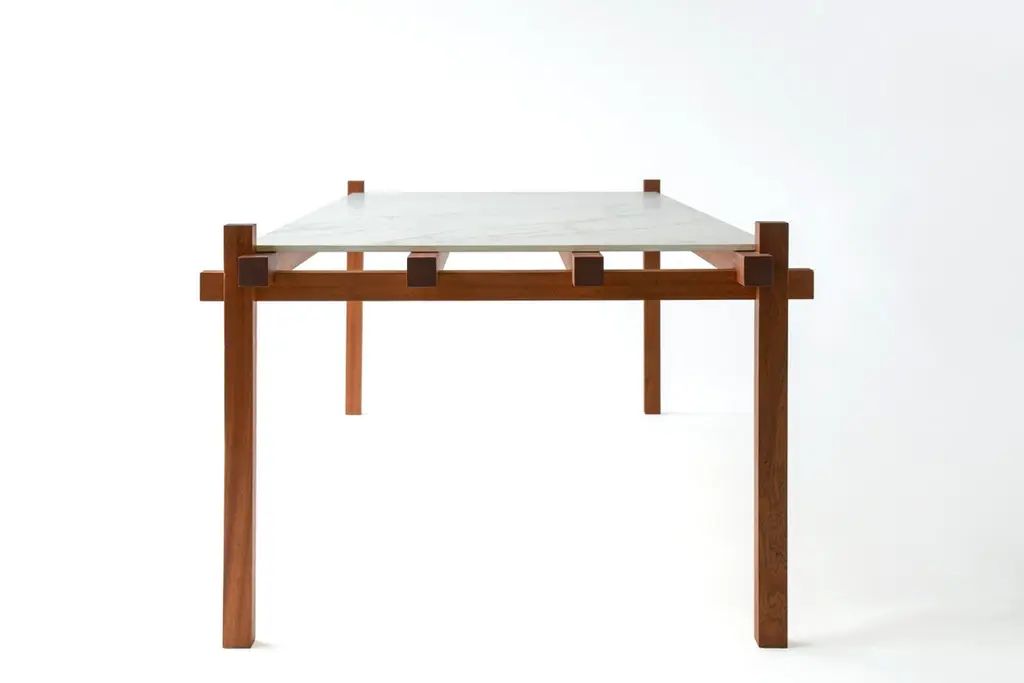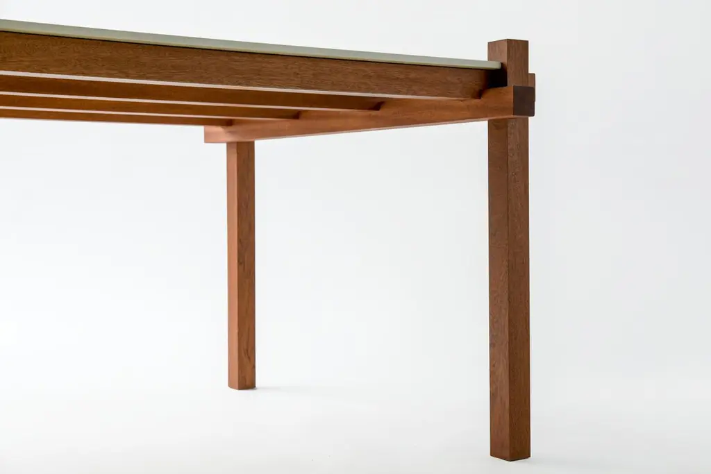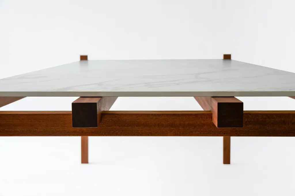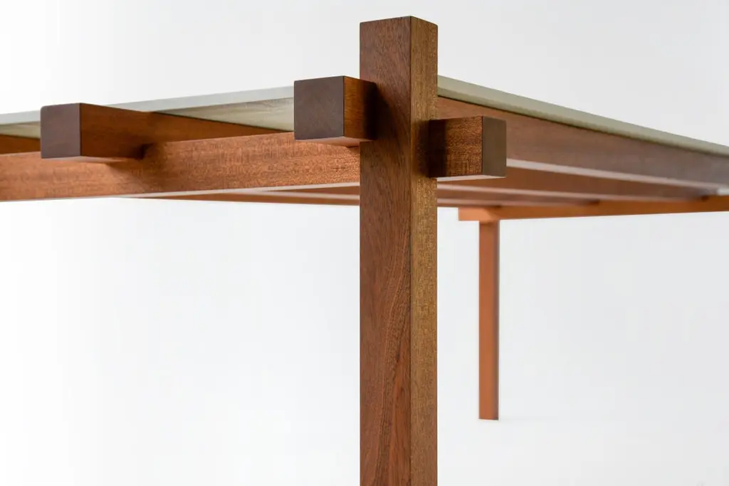 Carrier Neolith ceramic table by Jesse VisserDimensions: 240 x 100 x 75 cmMaterials: Steel, tabletop Neolith ceramic.The Carrier is a table in which the carrying element has been highlighted. This has been achieved with a completely self-supporting construction that encloses the tabletop.A clear design in which the ceramic tabletop rests solely on the Mahoni wooden construction.The wooden beams from the first prototype originate from one enormous trunk that measures 250 cm cross-section.These beams are self supported and are joined together using an innovative wood joint that doesn’t need bolts or screws. On each beam a shape is milled out causing the beams to interlock seamlessly.For the tabletop a high quality ceramic slab from Neolith is used. It has a fine silk surface finish. This is a material with a high durability and a luxurious feel. It’s scratch resistant, heat resistant and easy to maintain.Jesse Visser:Jesse Visser’s work has been exhibited in, among others; Milan, New York, Cologne, London, Frankfurt, Tallin, and in the Netherlands.Jesse Visser enjoys various collaborations with labels, craftsmen, product developers, industry- and other creative thinkers. A part of his designs are created in partnership with designer brands or as custom pieces for architects. On his own initiative he creates in-house productions and special limited edition pieces.The labels Visser works for are predominantly focussing on furniture and lighting design. He is strongly involved by the process of product-development. Searching for new production techniques, innovative materials, fnding the best solution that will bring the product to a higher level. He challenges himself to break down a product to its essenceand then built it up with as few resources as possible, which result in functional high end pieces. His products are often conceptual but always functional, clear and clever detailed.Apart from being a designer, he is art director of ‘Brothers and Sons’ and works as a lecturer at ‘Utrecht School of the Arts’ in The Netherlands.During his career, Jesse Visser has been rewarded with several international awards and recognitions for his work as well as taking part in numerous exhibitions. The ‘best product’ award for the Alumni chair during Design District 2015, the third price Auroralia 2010 with the Cercle Luminaire, the Designboom Competition (honourable mention 2005) withthe project doors and the 100% Rubber Design Award 2002 with the Bunker Table.