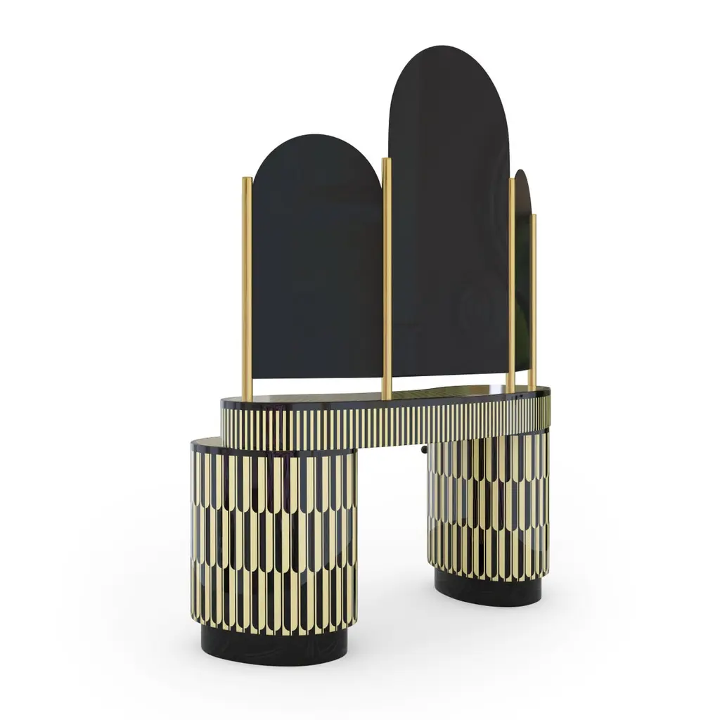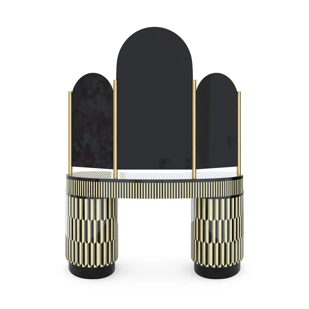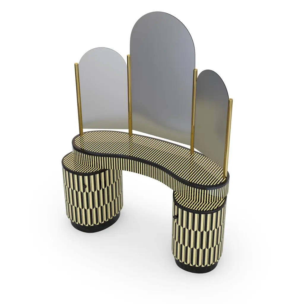 Casablanca is a magnificent vanity table handcrafted with resin inlay. It has three tall arch-shaped mirrors with gold trimmings and abundant drawers and shelves.India's handicrafts are as multifarious as its cultures, and as rich as its history. The art of bone and horn inlay is omnipresent here. Artisans from the Northern region of Sarai Tarin, to Bengal in the East, and Trivandrum in the South, have imbibed the ancient technique from Himalayan tribes, and have made their own mark along the way. The intricately crafted combs, vases, toys, and other objets d'art have long been a connoisseur's delight, and a means of livelihood for millions. When the founders of Scarlet Splendour and designer Matteo Cibic went on tour, in search of inspiration for their first collection, they were captivated by the exquisite bone marquetry. They decided to make a contemporary version of the playfully geometric designs, which would be accepted across the world. Cibic then developed a resin compound, and the company carried out trials with the material until they found the right mix. The resin would replicate ivory inlay, on a base of plywood, ultimately smoothened and lacquered to have no visible or tactile end. Each piece of the Vanilla Noir collection would then be made in India, by local craftsmen using locally sourced materials and pigments. The aim was to combine Indian workmanship and Western aesthetic in such a way that each piece appears timeless, and with multiple roots. In the unique decorative imprints one would recognize Indian styles, and also unexpected drifts to Italian design. The company's founders wanted to proudly showcase the fine art and making capabilities of their native India, and give the craftsmen due recognition. They have successfully paid homage to their heritage by elevating indigenous art and taking it to global design platforms.Care: Wipe gently with dry soft cloth. Liquid spillage must be wiped without delay.Please note: Each piece in the Vanilla Noir collection exalts the handmade, the painstakingly crafted, the authentic. A piece may have slight variations and tiny imperfections but these are the marks of an artisan, a testament to the individuality of each work of art. It is our belief that these variations infuse our objects d'art which desire and we assert our right to make the necessary qualitative changes. Prices do not include VAT. VAT may be applied depending on the ship-to location.