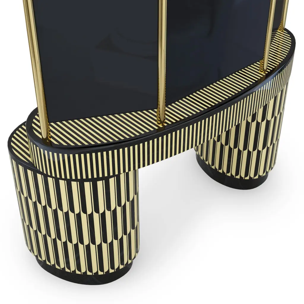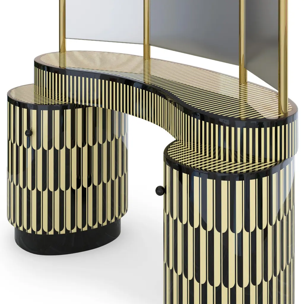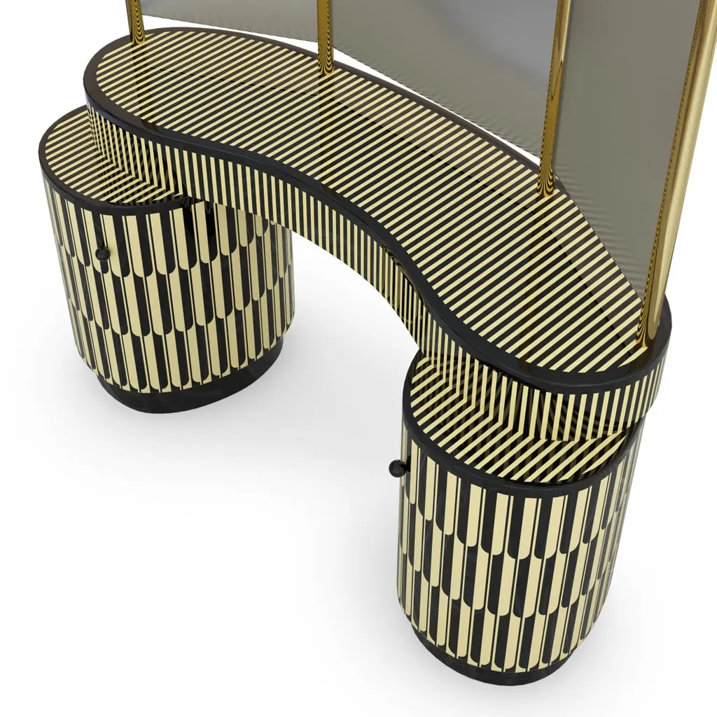 Casablanca is a magnificent vanity table handcrafted with resin inlay. It has three tall arch-shaped mirrors with gold trimmings and abundant drawers and shelves.India's handicrafts are as multifarious as its cultures, and as rich as its history. The art of bone and horn inlay is omnipresent here. Artisans from the Northern region of Sarai Tarin, to Bengal in the East, and Trivandrum in the South, have imbibed the ancient technique from Himalayan tribes, and have made their own mark along the way. The intricately crafted combs, vases, toys, and other objets d'art have long been a connoisseur's delight, and a means of livelihood for millions. When the founders of Scarlet Splendour and designer Matteo Cibic went on tour, in search of inspiration for their first collection, they were captivated by the exquisite bone marquetry. They decided to make a contemporary version of the playfully geometric designs, which would be accepted across the world. Cibic then developed a resin compound, and the company carried out trials with the material until they found the right mix. The resin would replicate ivory inlay, on a base of plywood, ultimately smoothened and lacquered to have no visible or tactile end. Each piece of the Vanilla Noir collection would then be made in India, by local craftsmen using locally sourced materials and pigments. The aim was to combine Indian workmanship and Western aesthetic in such a way that each piece appears timeless, and with multiple roots. In the unique decorative imprints one would recognize Indian styles, and also unexpected drifts to Italian design. The company's founders wanted to proudly showcase the fine art and making capabilities of their native India, and give the craftsmen due recognition. They have successfully paid homage to their heritage by elevating indigenous art and taking it to global design platforms.Care: Wipe gently with dry soft cloth. Liquid spillage must be wiped without delay.Please note: Each piece in the Vanilla Noir collection exalts the handmade, the painstakingly crafted, the authentic. A piece may have slight variations and tiny imperfections but these are the marks of an artisan, a testament to the individuality of each work of art. It is our belief that these variations infuse our objects d'art which desire and we assert our right to make the necessary qualitative changes. Prices do not include VAT. VAT may be applied depending on the ship-to location.